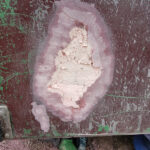 Full through cracks received a fiberglass matting and resin to restore strength and then a fiberglass filler applied along with the other areas prepared earlier.