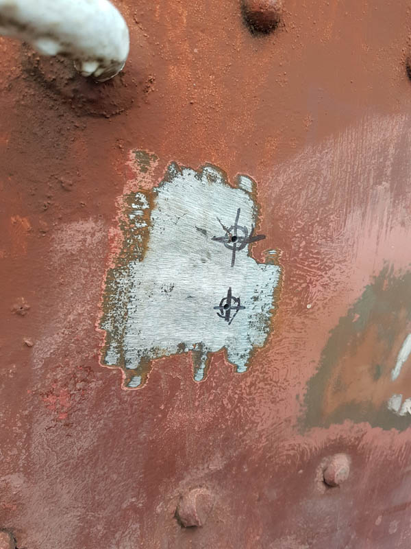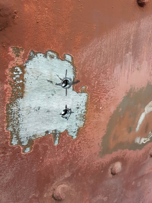 The large repair plate that was fitted last weekend received a row of false rivets to blend the repair into the vehicle.