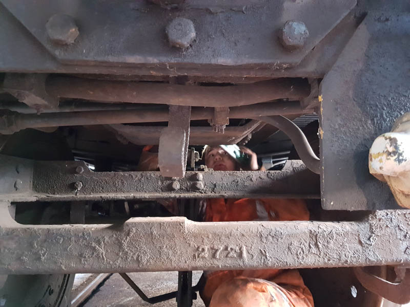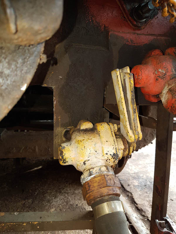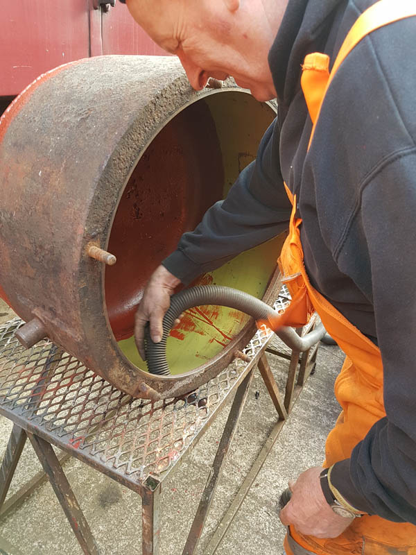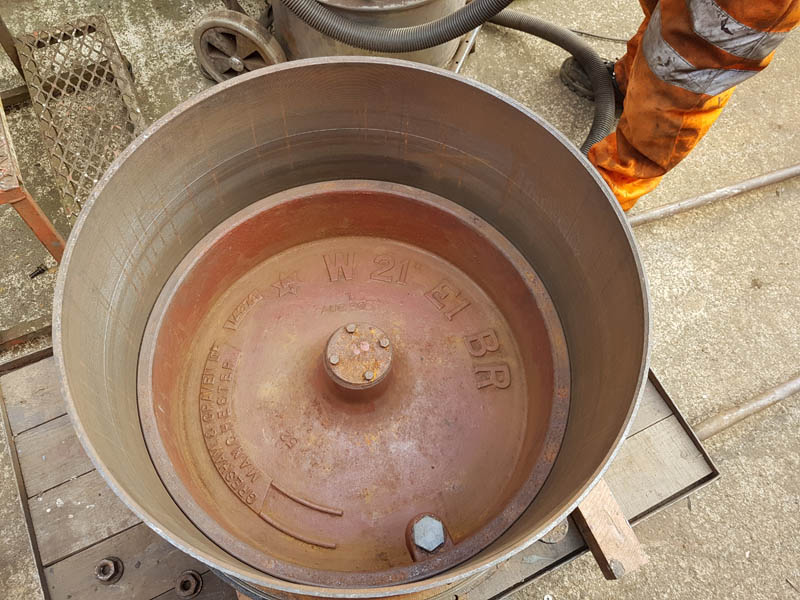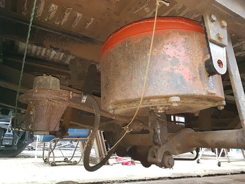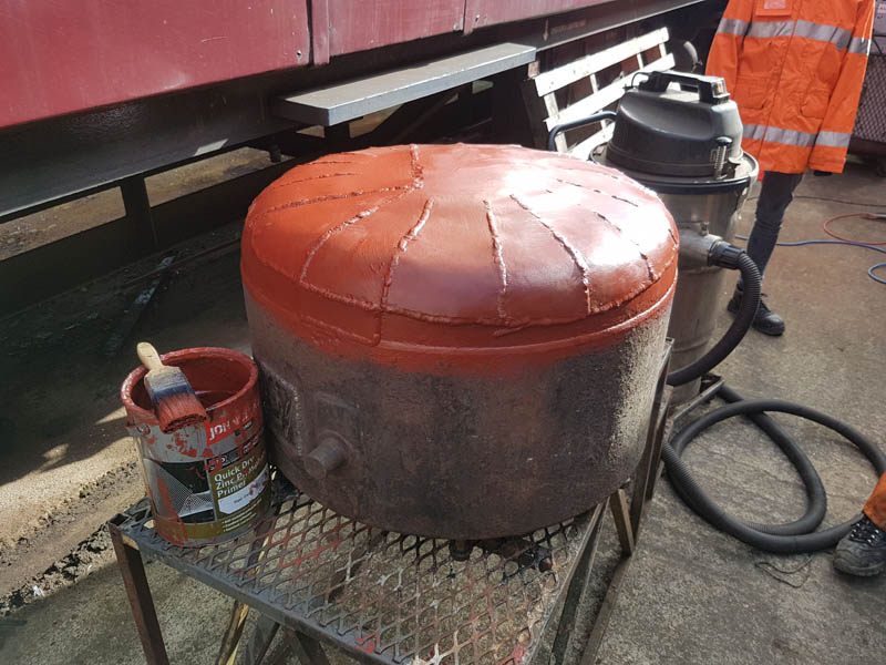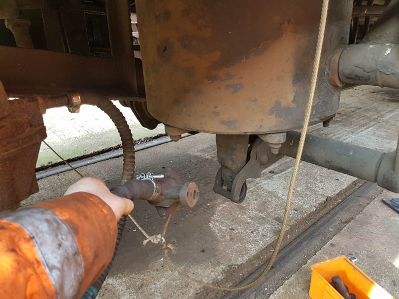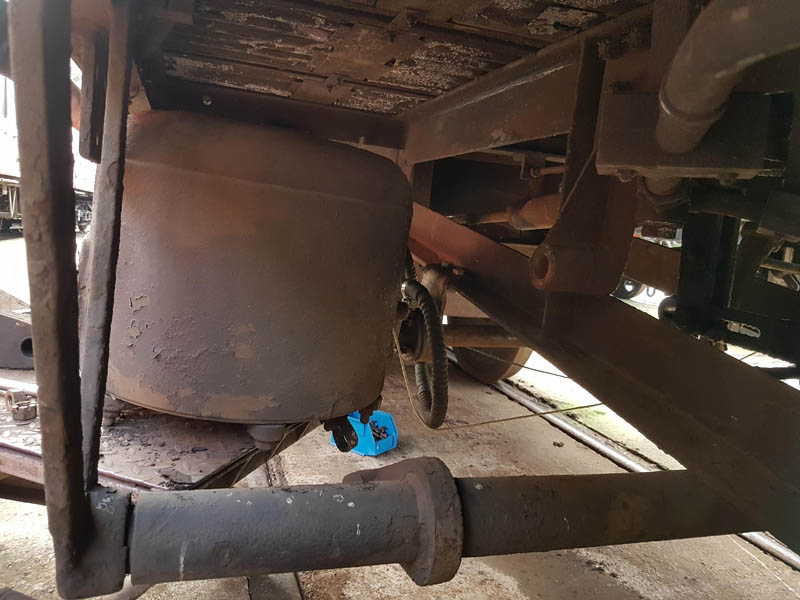 Once the east side was in undercoat, we manhandled the vehicle round to the turntable for a quick spin, this served two purposes, to make the job of spraying the former westside easier and to allow access to the vacuum cylinder location as we will be reinstating the vacuum brake which was removed when the vehicle was sold out of BR ownership around 1964.