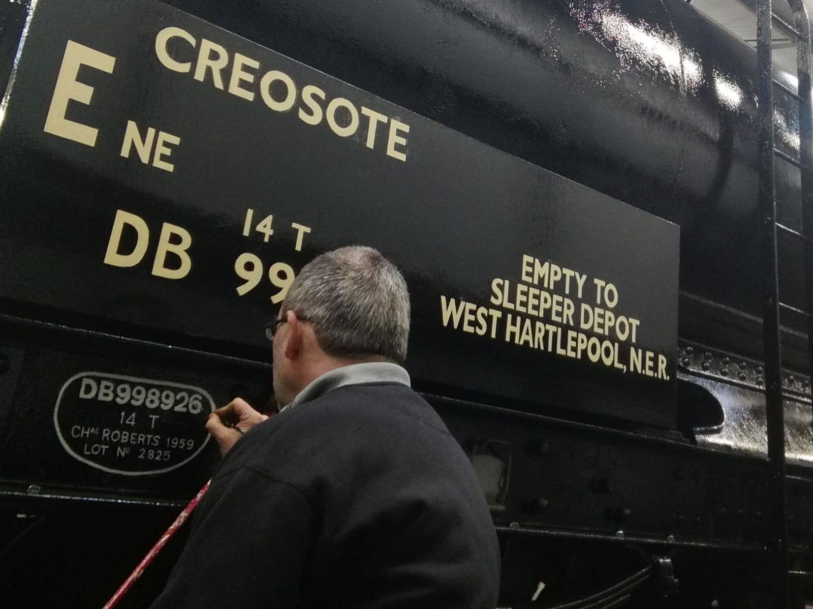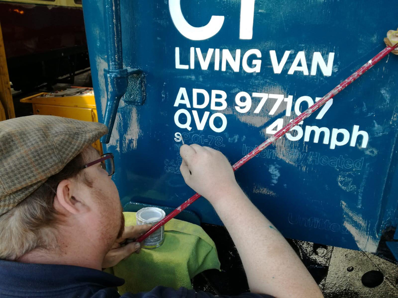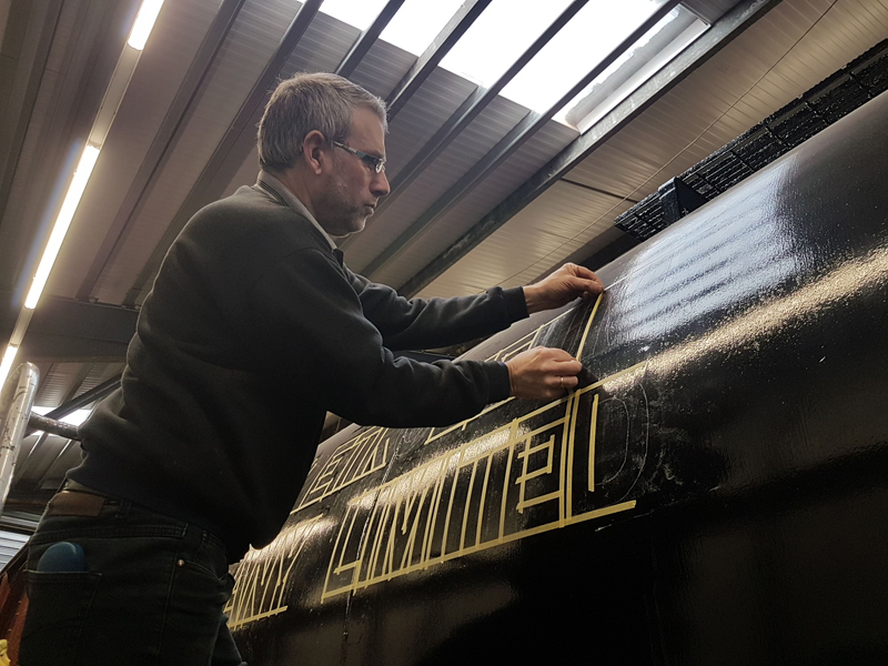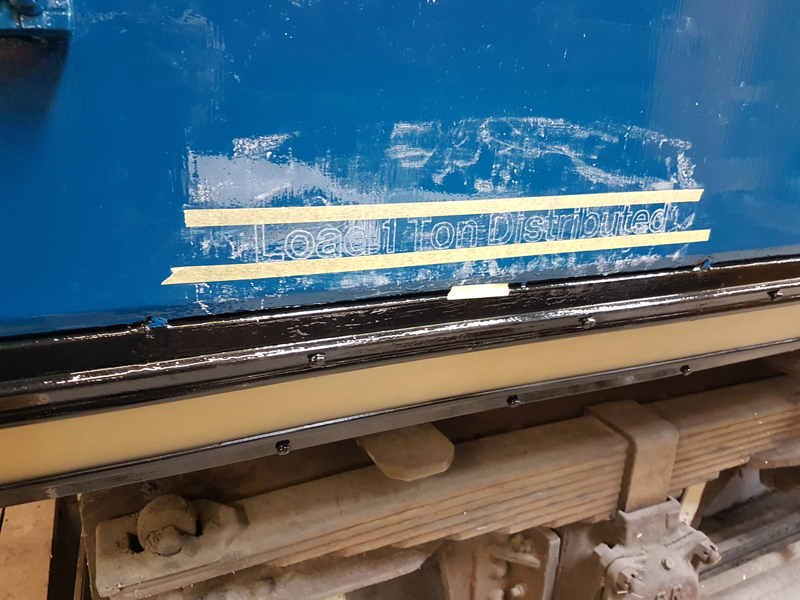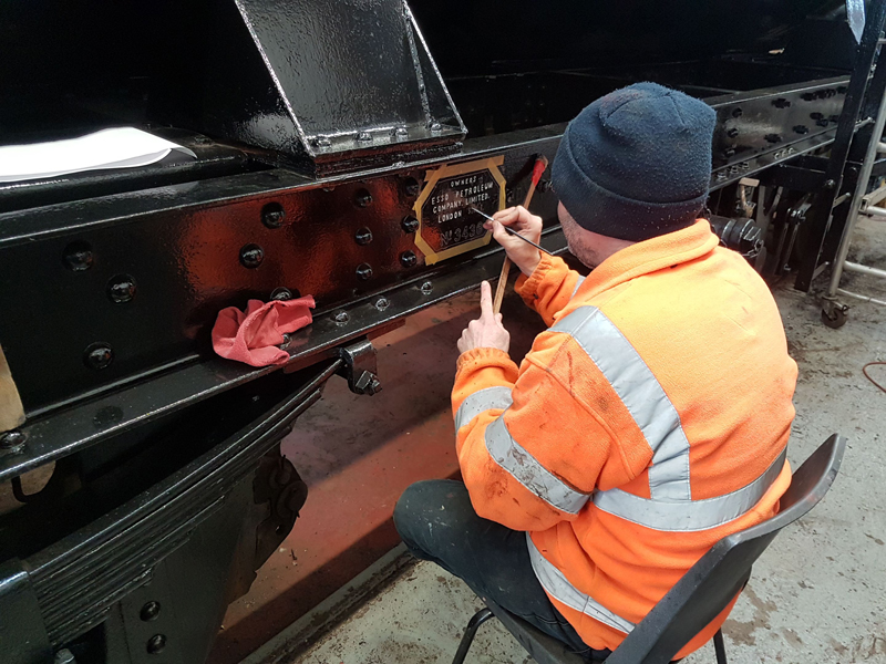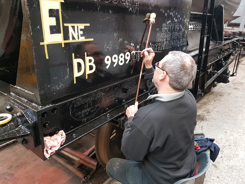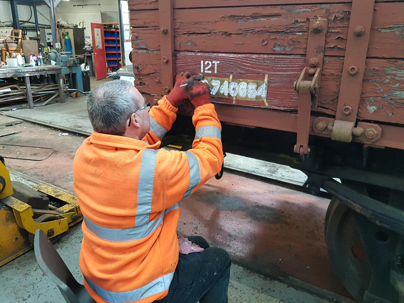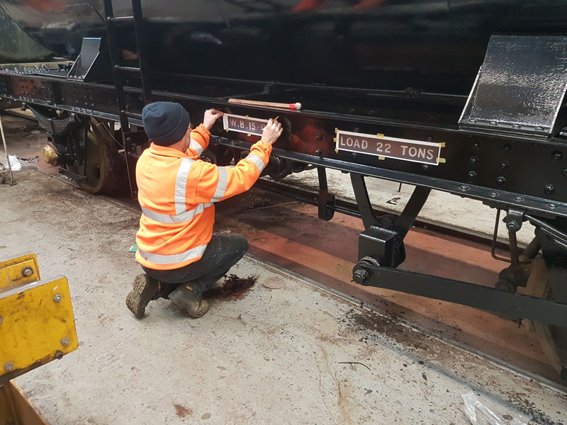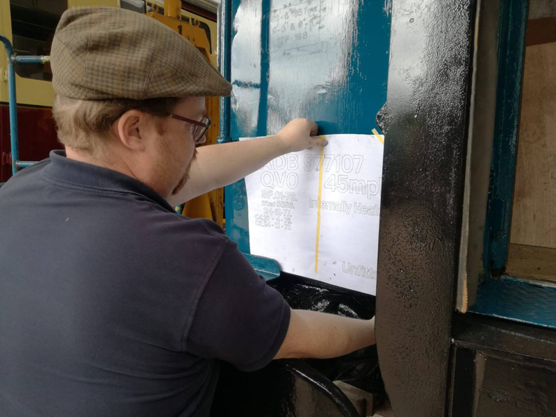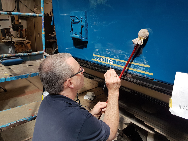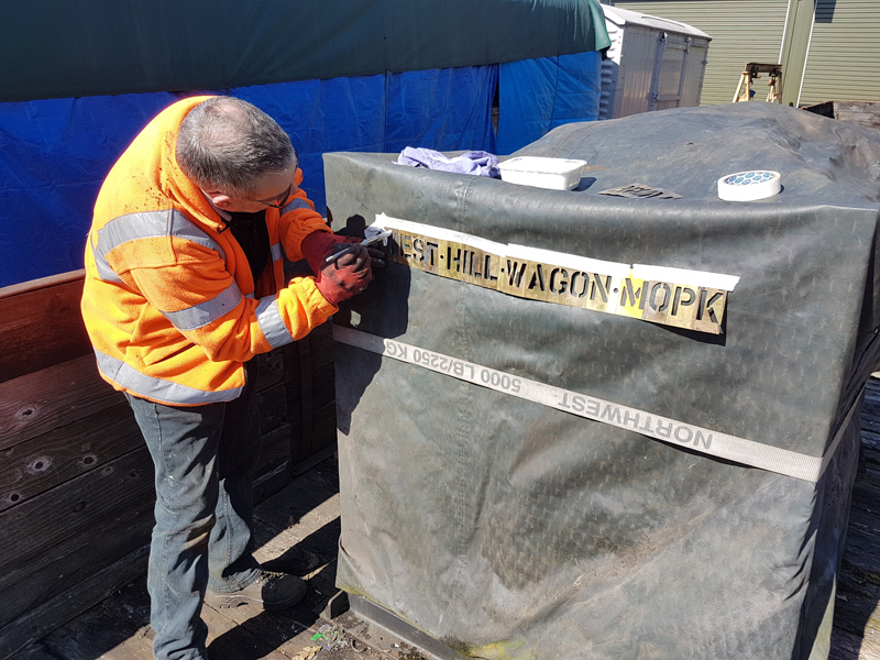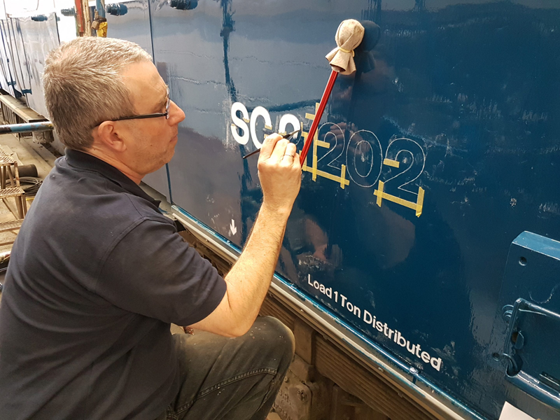 Dave taking the lead with the sign writing on this one, applying the running numbers, Guards door, load marking and the No 1 wheel arrow. Regards the latter we have gone for the rarer legend without the word evenly.