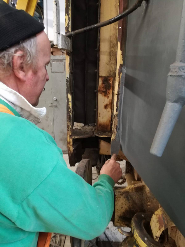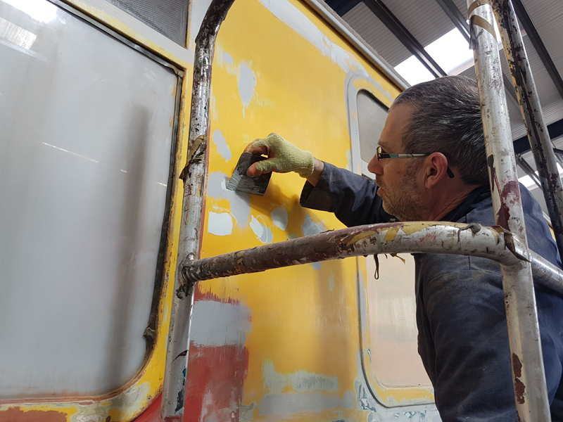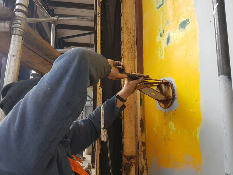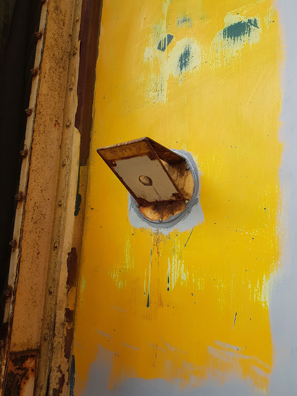 Ross started with applying the first coat of yellow to the east side first class stripe. He then moved on to fitting the fridge flue and it’s cover.