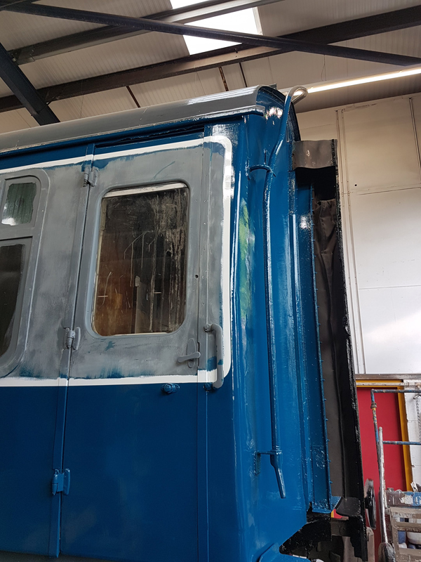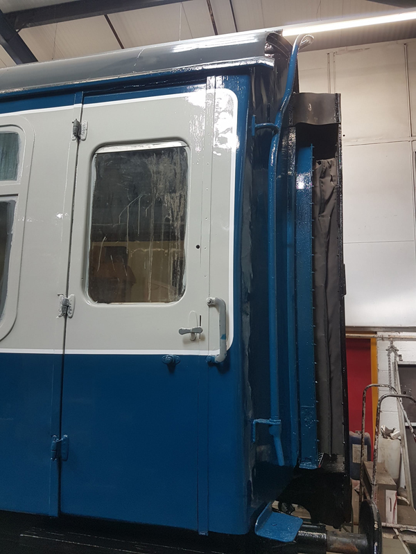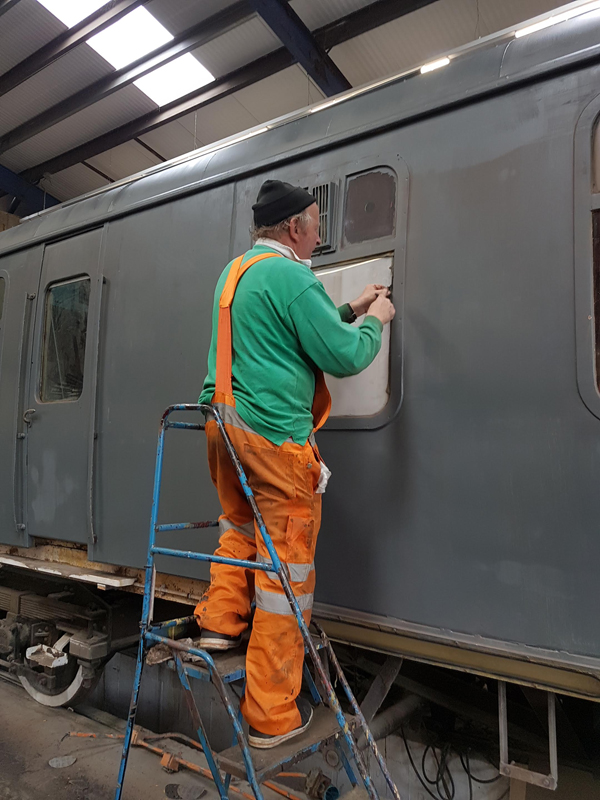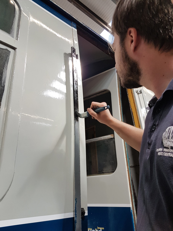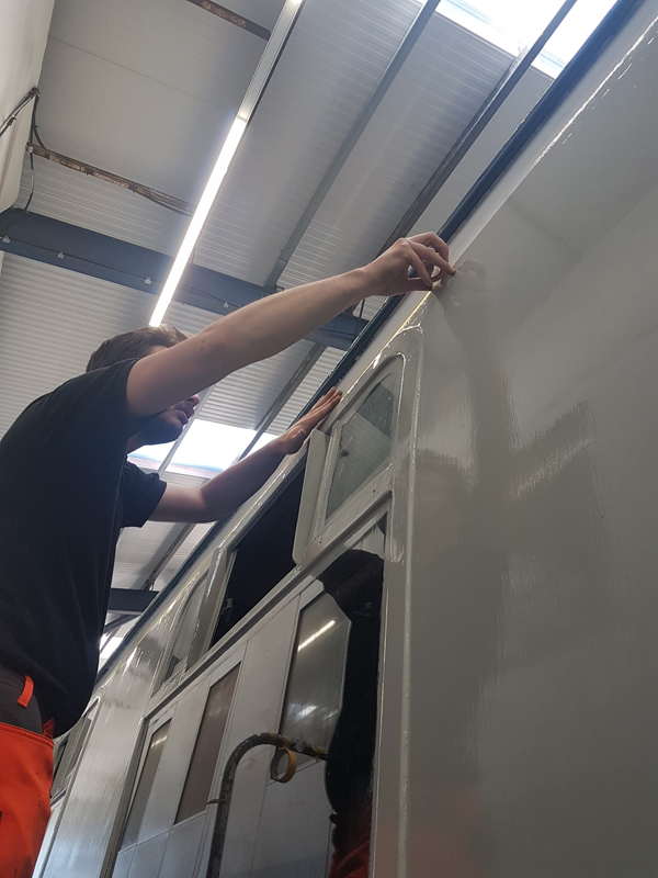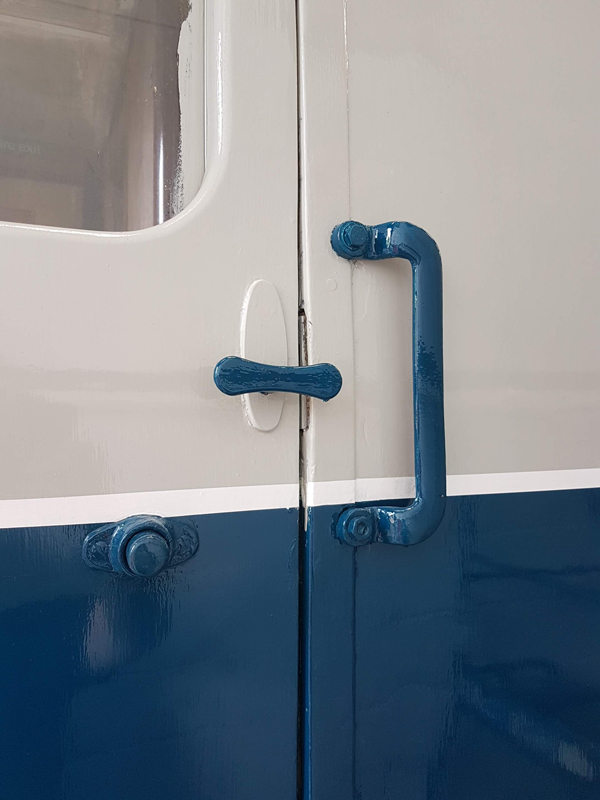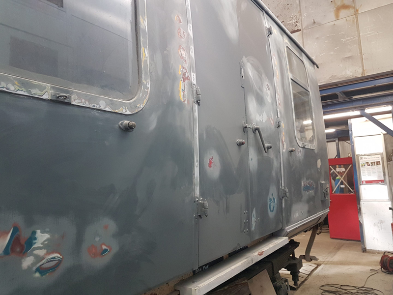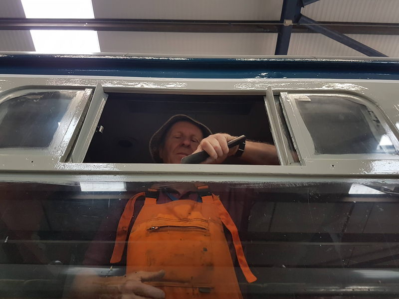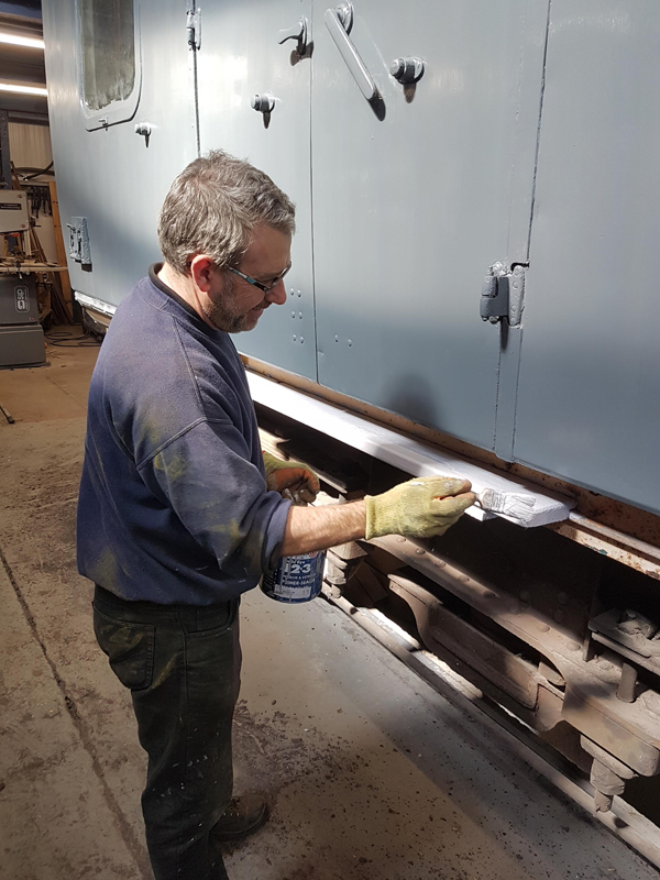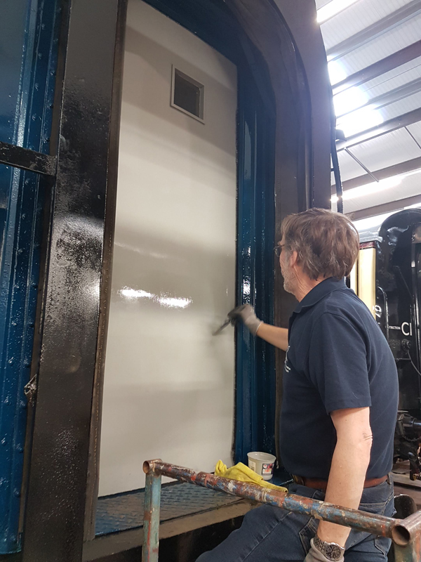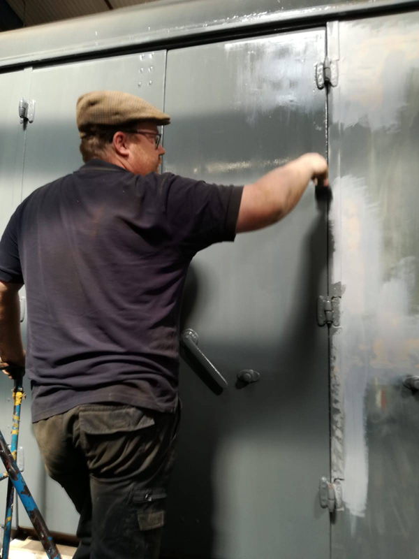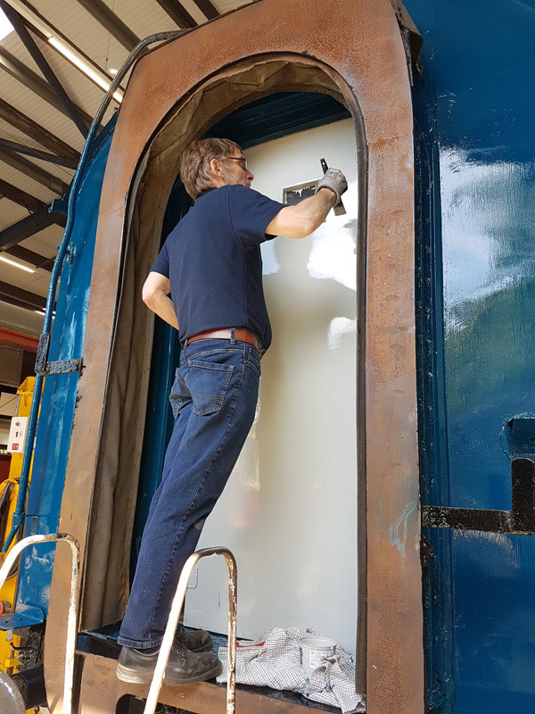 Whilst I was beavering away with the lining, Richard joined me and applied a second coat of grey to the south end vestibule door.