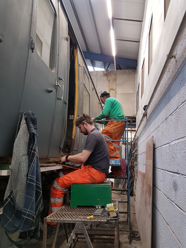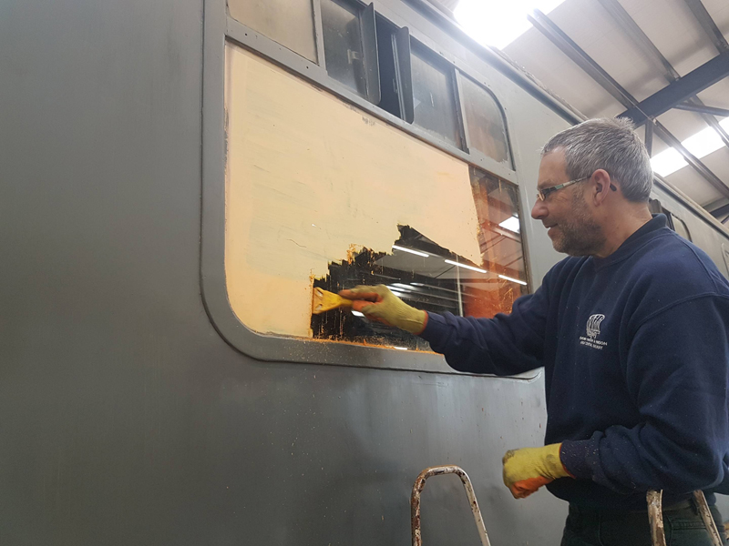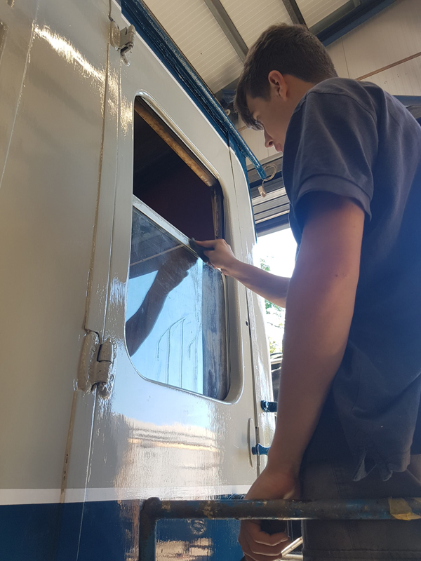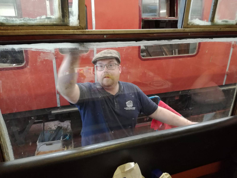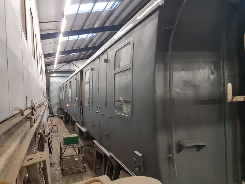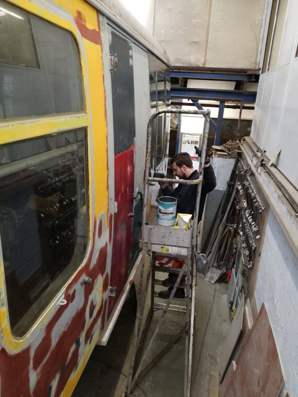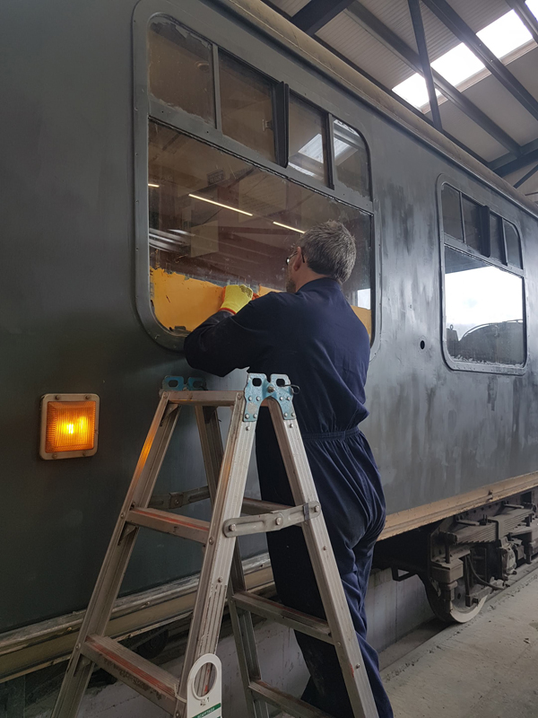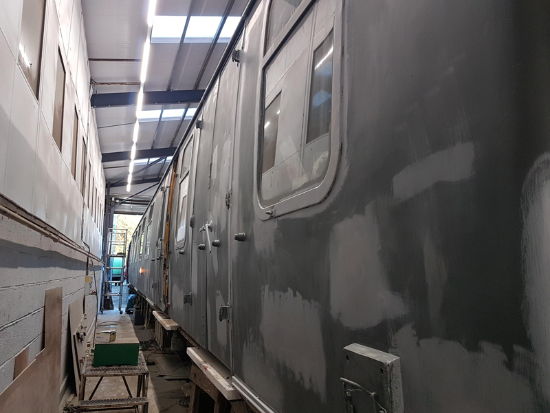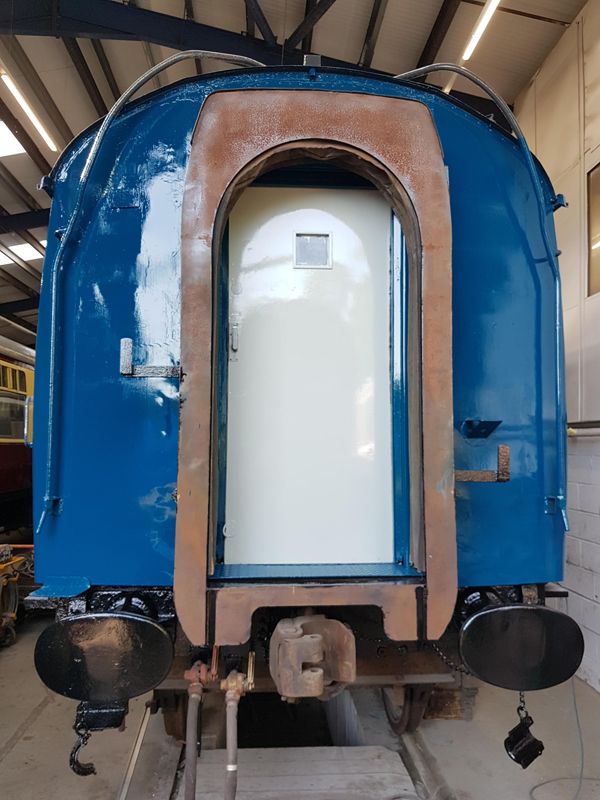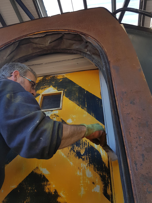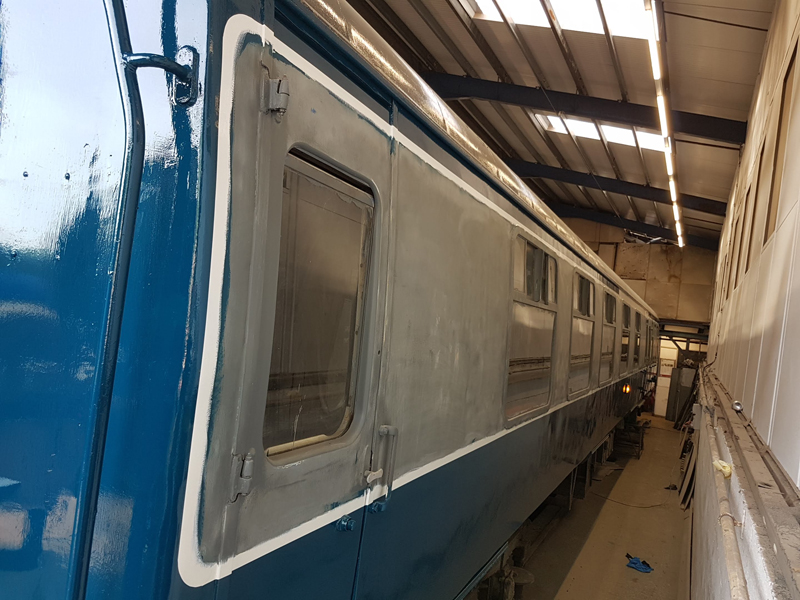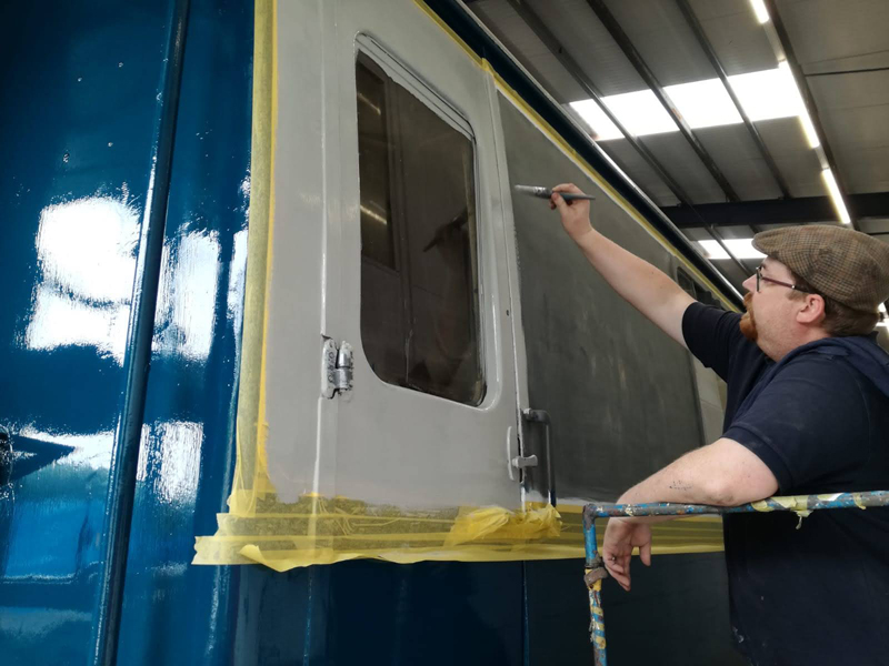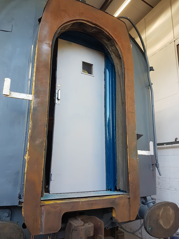 Whilst I was beavering away with the lining, Richard joined me and applied a second coat of grey to the south end vestibule door.