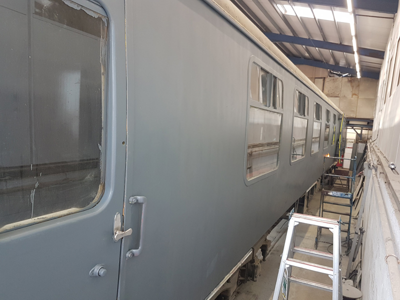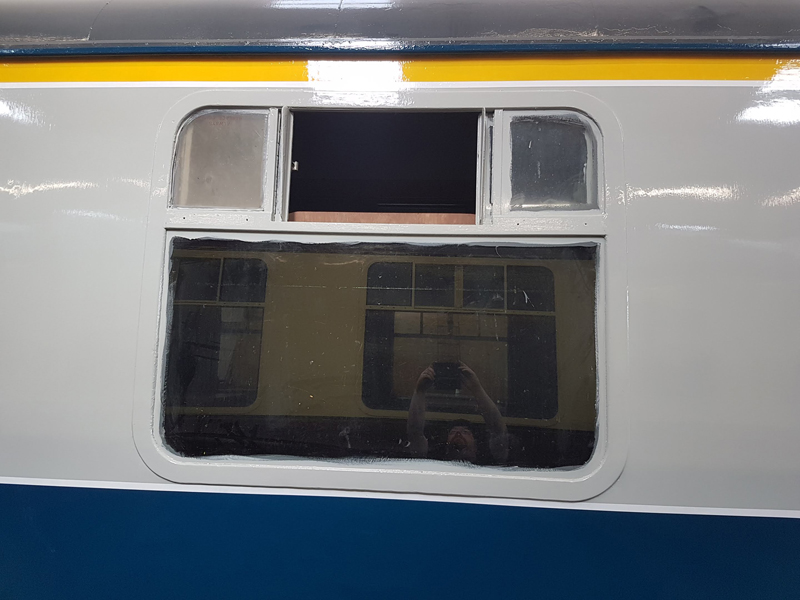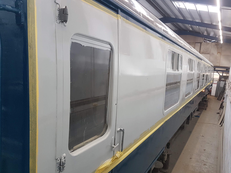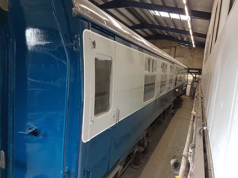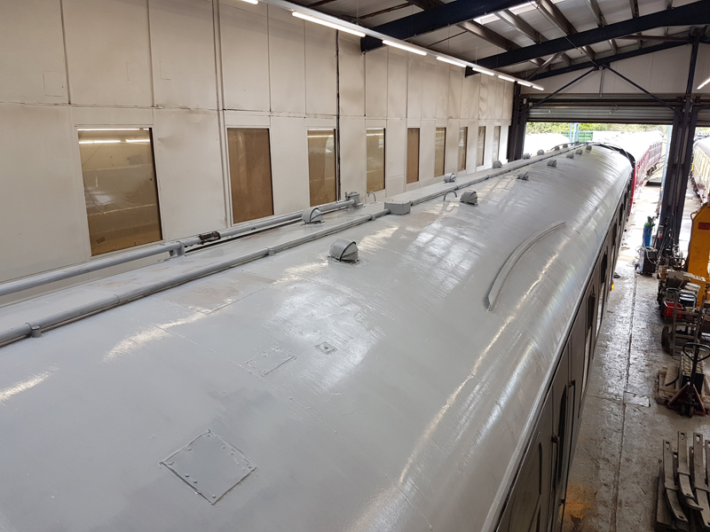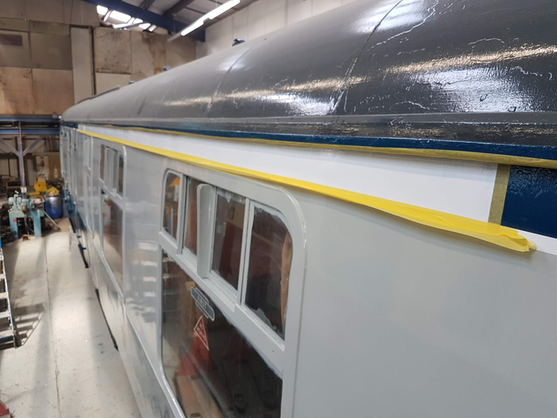The area above the as built first class compartments was painted white up to the gutter line. This will act as an undercoat for the eventual yellow stripe.