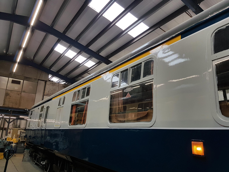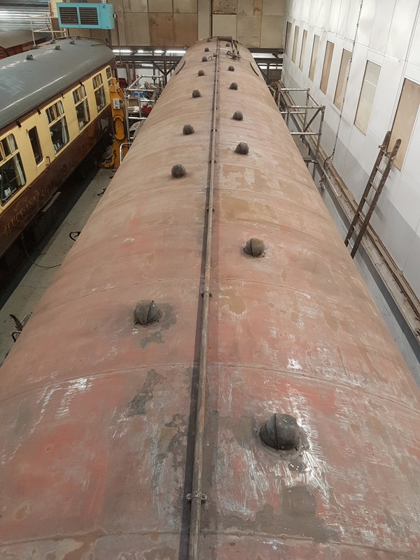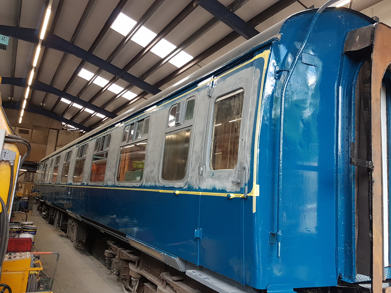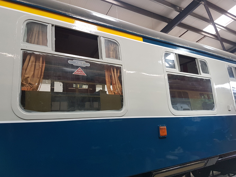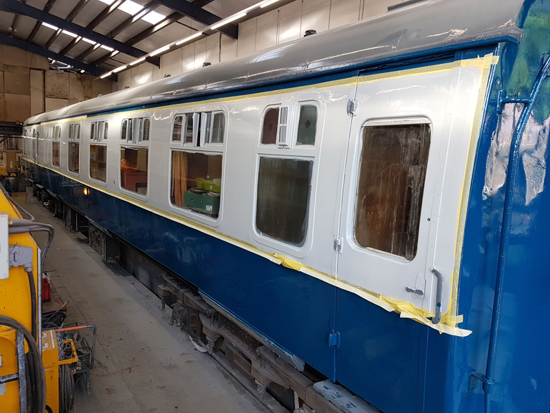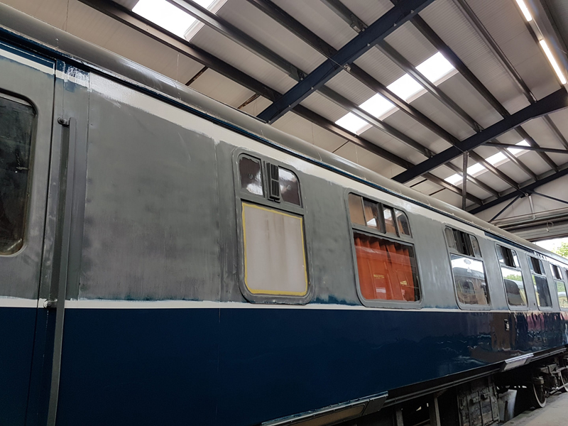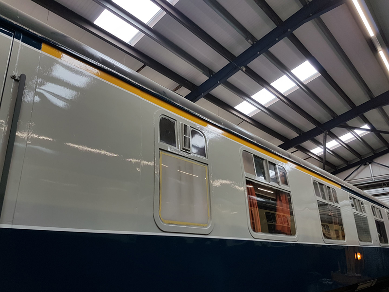 The area above the as built first class compartments was painted white up to the gutter line. This will act as an undercoat for the eventual yellow stripe.