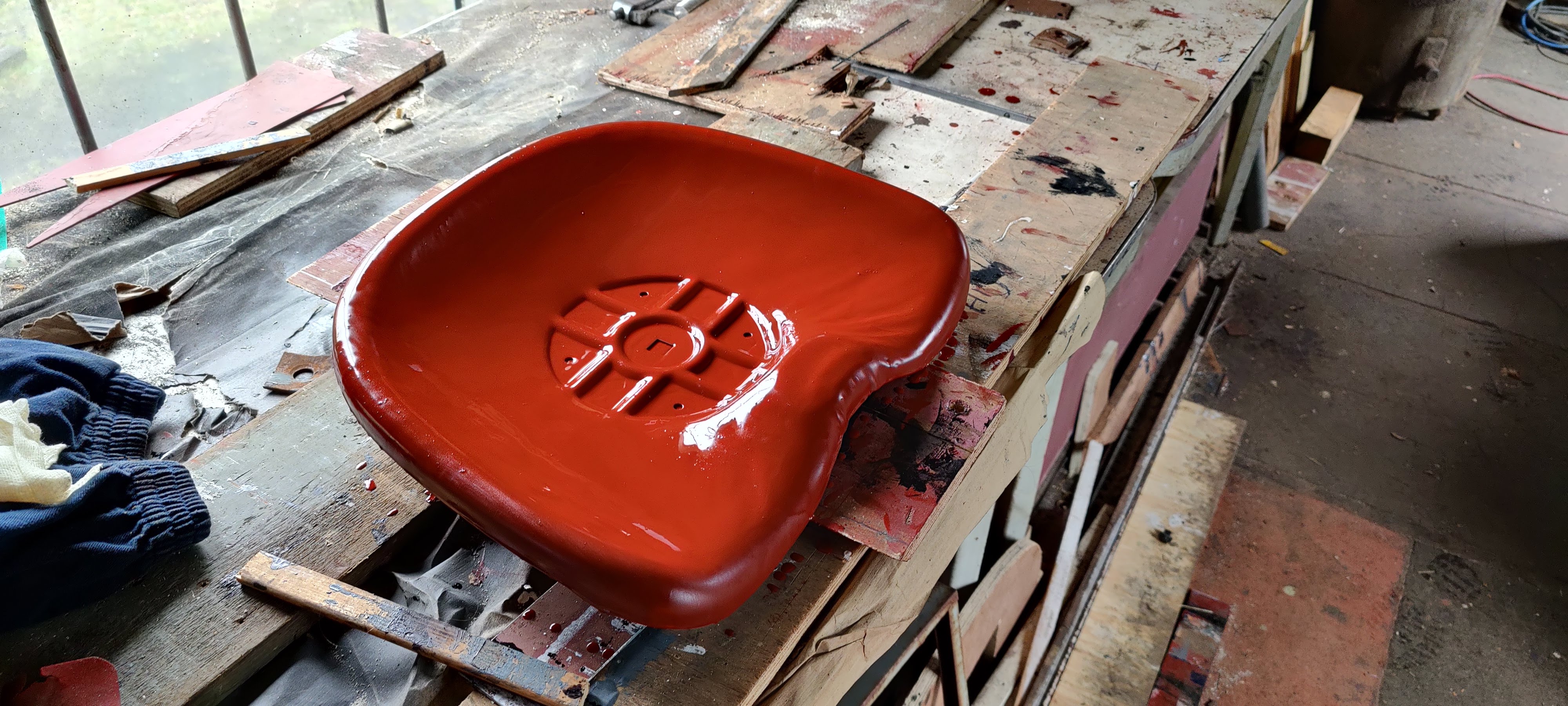 Day four and continuation of the top coat application. With the yellow side stripes dry I applied bauxite to the remaining planks and the duckets. Second coat of yellow was also to the end stripes.