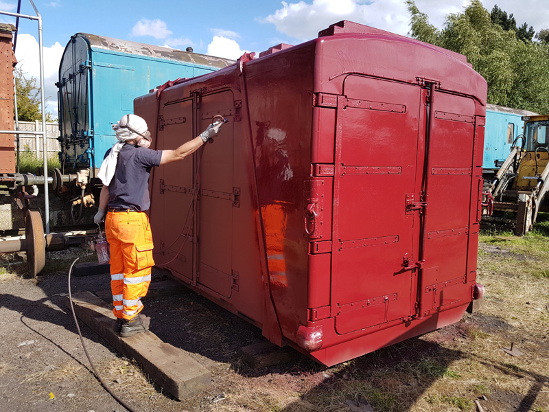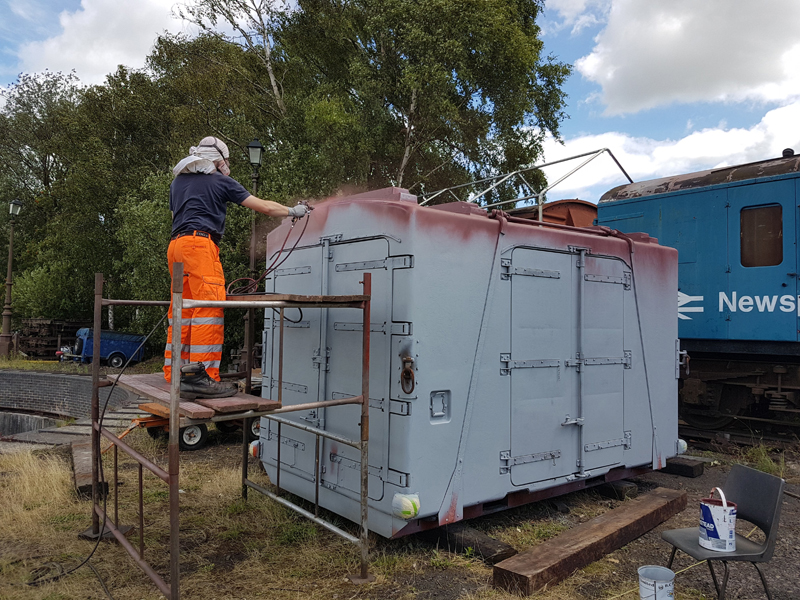 Back at Quorn and finally a break in the weather. A moment I have been waiting for for over a year painting of my fibreglass container. The special Fibreglass/gelcoat primer first. The is a very fast drying paint and was quickly followed up by the undercoat.