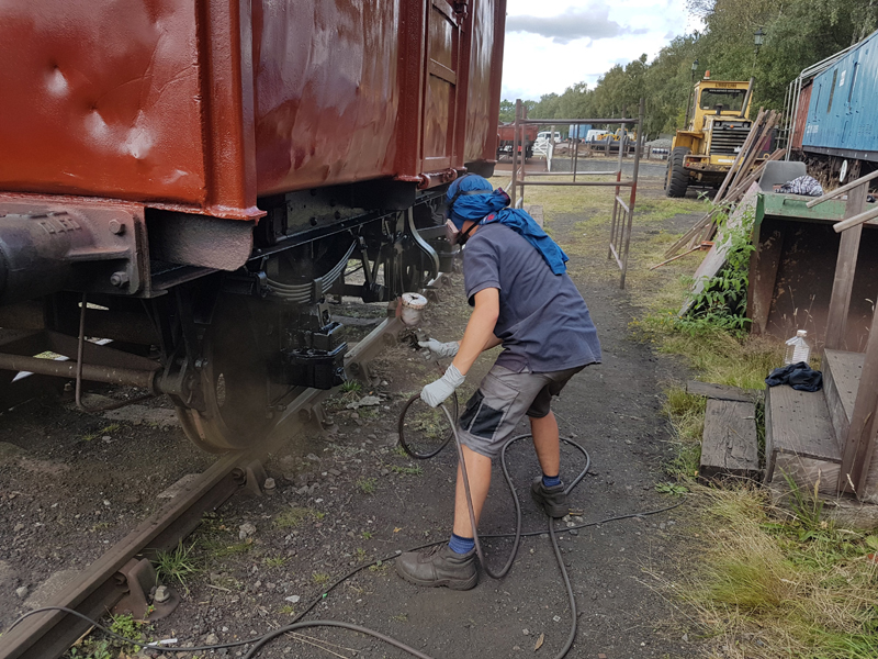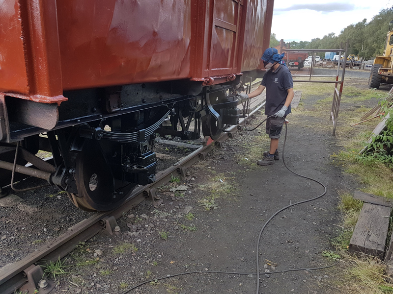 With the Gloss hardening off, we made a quick clean up of the underframe and applied a further colour for the day. Black Bitumen, Jake again spraying the sides whilst Dave and I followed with Brushes.