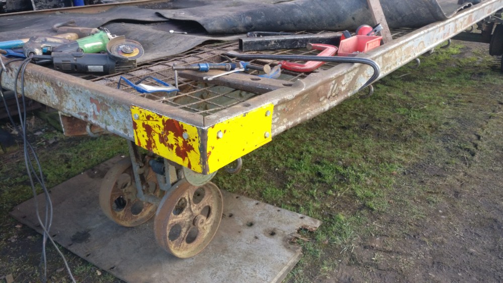 Later designs of Salmon had Plateback bogies with a wheelbase of either 5ft. 6in. or 8ft. These still had oil axleboxes so were limited to 50mph. In the TOPS era these were classed ‘YMO’. In the 1980s some of the fleet of Salmon were overhauled and had air brakes fitted, with extra tie down points added for ratchet straps. These became YMA or YMB depending on whether they retained the vacuum through pipe or not. In the late 90s two wagons were fitted with roller bearing bogies. A further 125 wagons were converted. The conversion didn’t result in a speed increase for the wagon, but bought about reliability improvements. For those remaining in service further conversion work was undertaken in 2009 to add 3 bolsters to the wagons to simplify the loading of track panels. The bolsters would locate the track panel on the wagon laterally and longitudinally. These conversions received another TOPS code, YKA, and another fishkind name; Osprey.