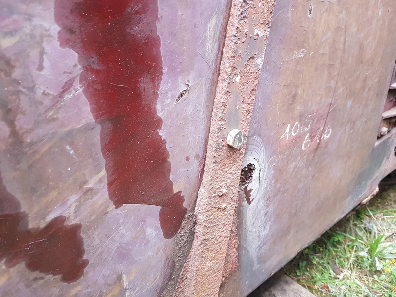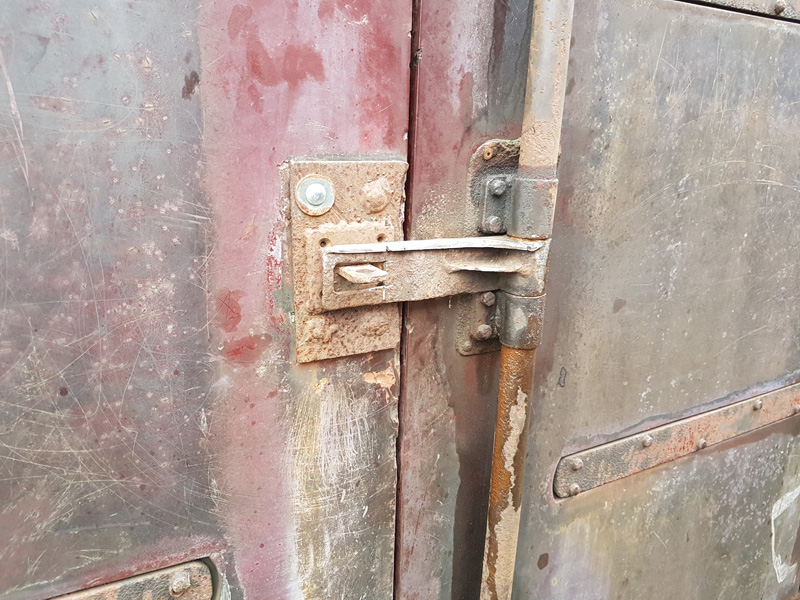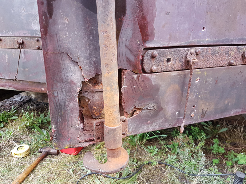 The hinge positions were clearly visible, the lower recesses for the luggage doors were still there, just packed with wood and a steel angle added at the bottom to retain the riveted skin. The Z irons were in good condition so Matt pressed on and cut out the additions, decision made, luggage doors will be refitted.