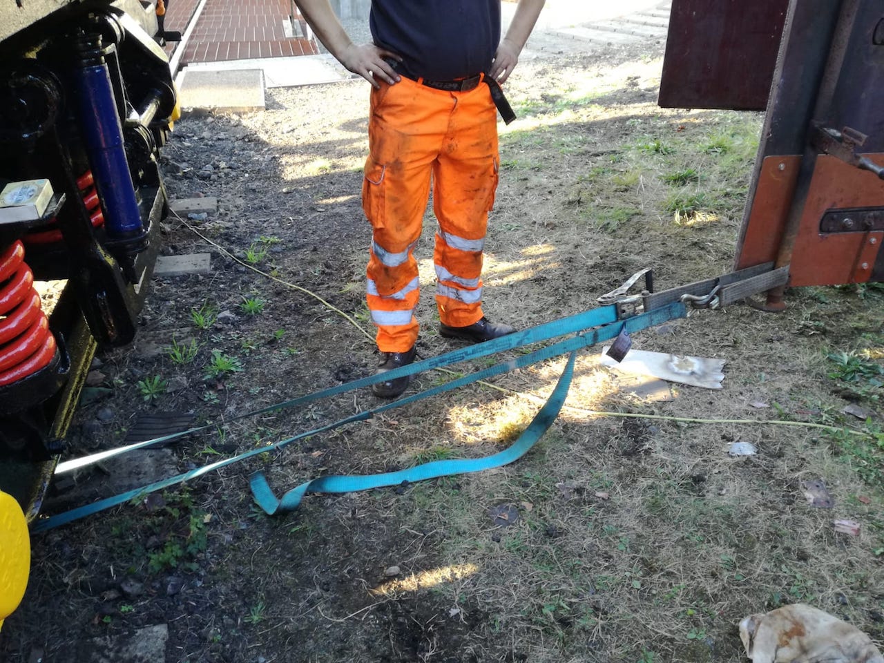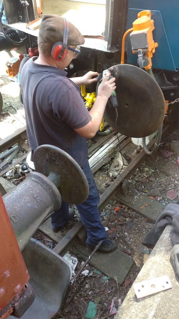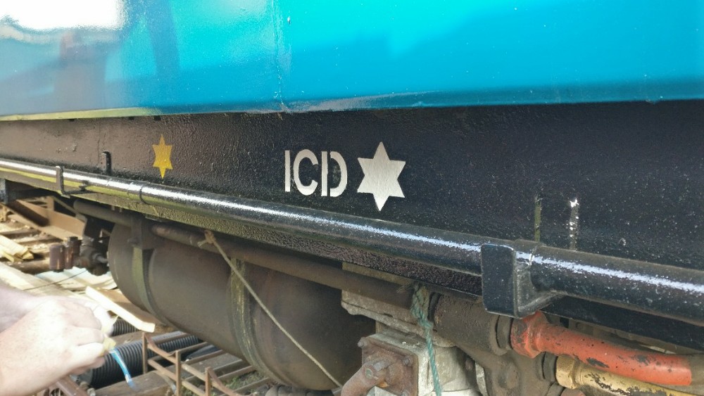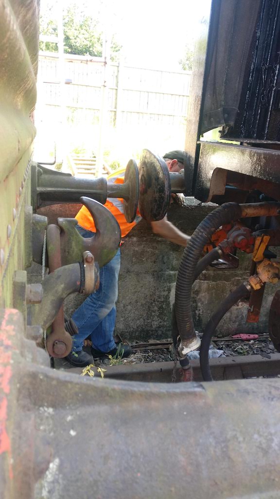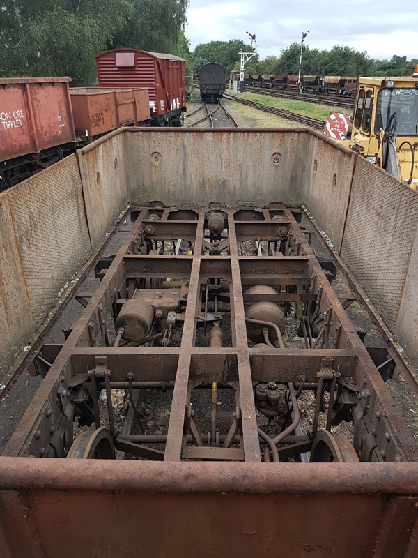 Stopping to observed the two minute silence, I continued until 11:45 when I had finished spraying the container. From then, it was a waiting game to see if the paint would go off. Matt and I then began working on B505313, sanding the chain boxes and painting them in red oxide. Nick, now in attendance, painted the interior metal surfaces in Bauxite, and then the body ends. The red oxide sufficiently dry, I painted the chain boxes in undercoat, and then continued to the ends with assistance from Nick.