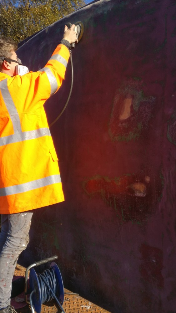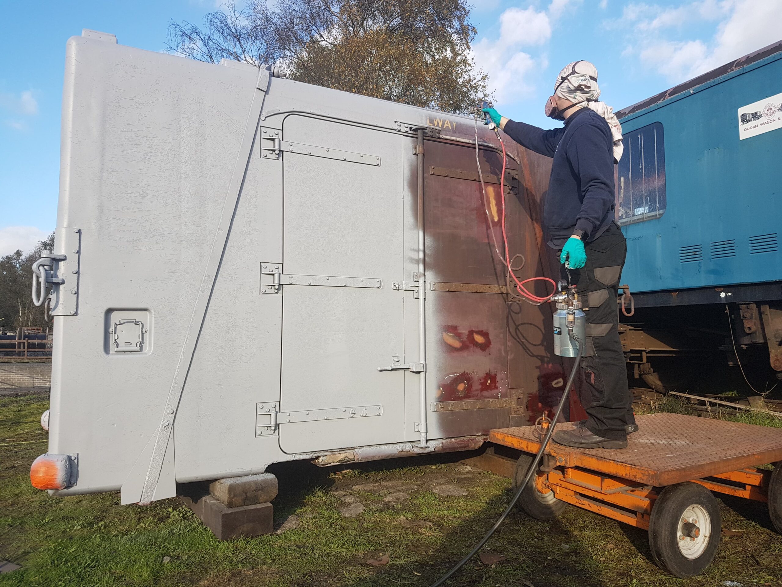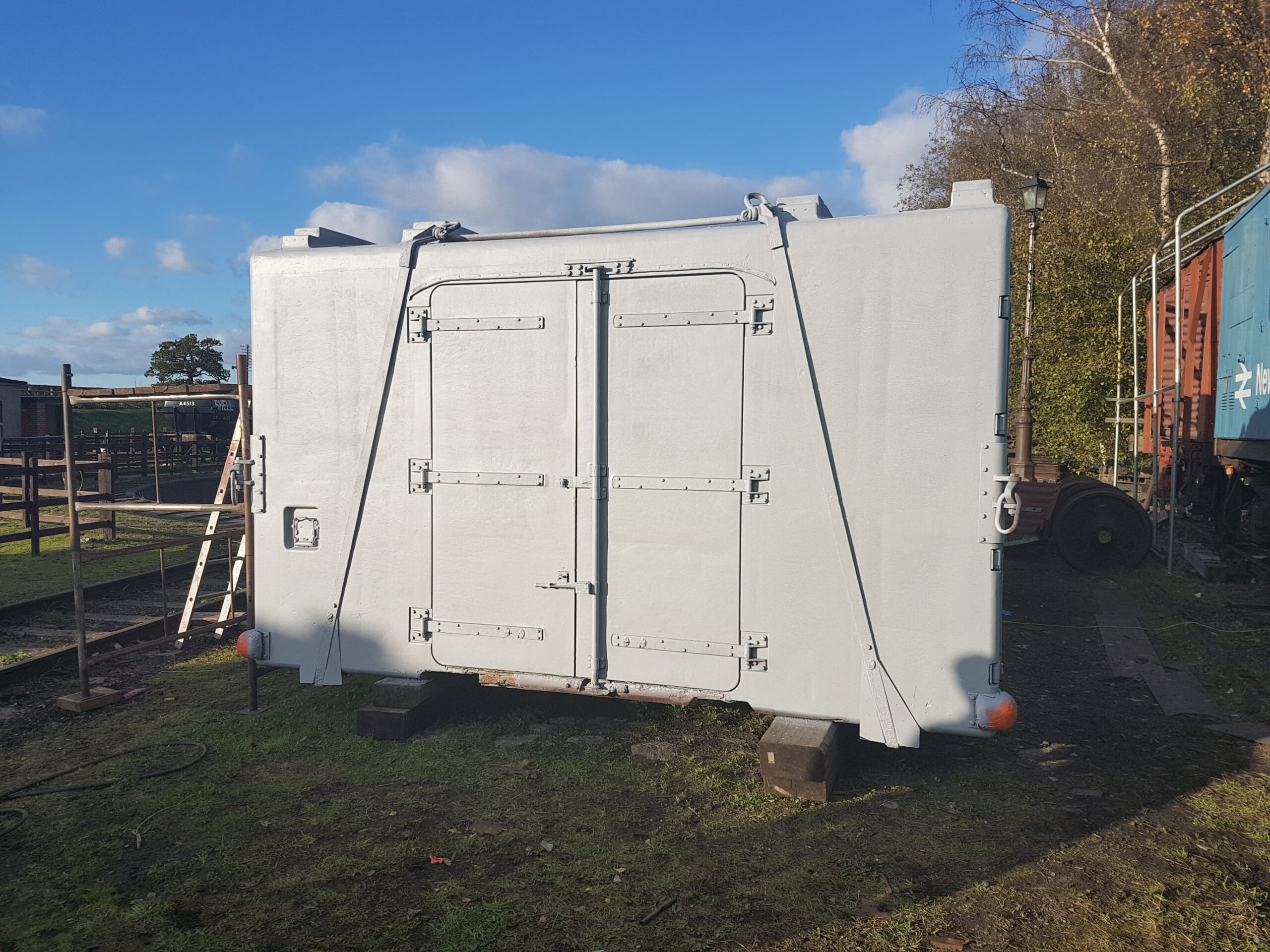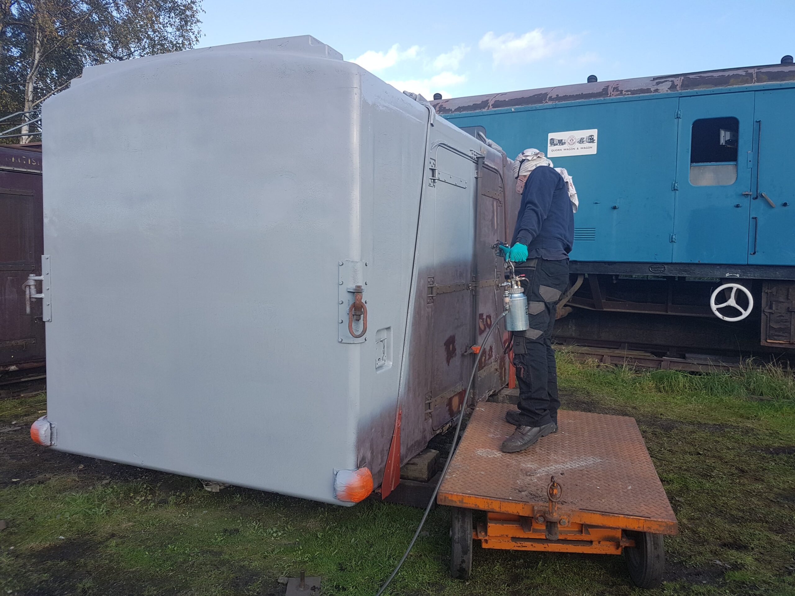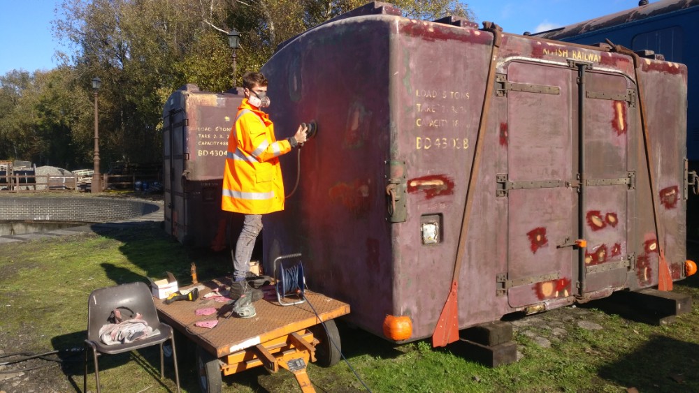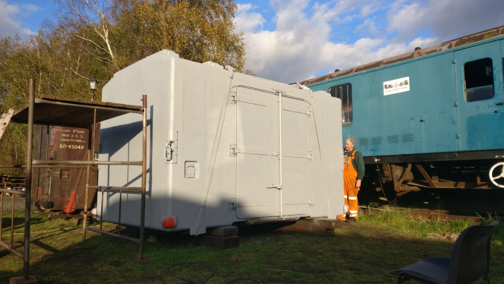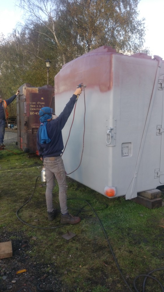 On to Sunday which was much less of a wash out, in fact quite the opposite! Nick was at the Loughborough Remembrance Day Parade, which left Matt and I to get on with the painting of the Container; BD4303B. Painting is a bit of the gamble this time of the year, but we appear to have gotten away with it. We began by removing the sheet and drying off the container where necessary. Matt assembled the scaffold tower while I thinned the paint and assembled the gun and pot. Once dried I began spraying.
