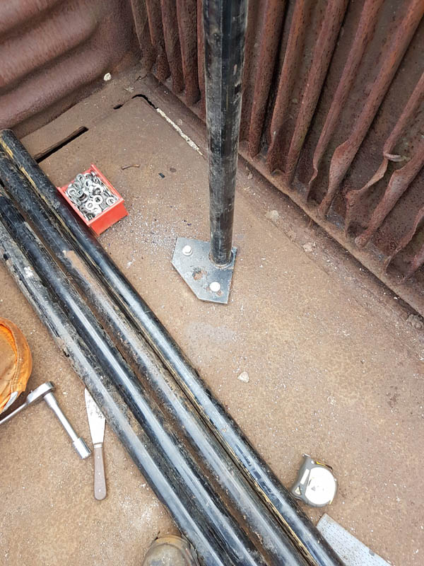 So the day begins, we began by building up the door frame with all the bits of steel framework to enable the door to be refitted to the van. Taking advantage of the good weather, Matt and Nick set up shop on the dock. Before mounting anything to the frame, areas where things were to be mounted had a generous coating of wood primer. A tea was consumed to allow the paint to dry a little bit, and then the top and bottom angle irons were fitted.