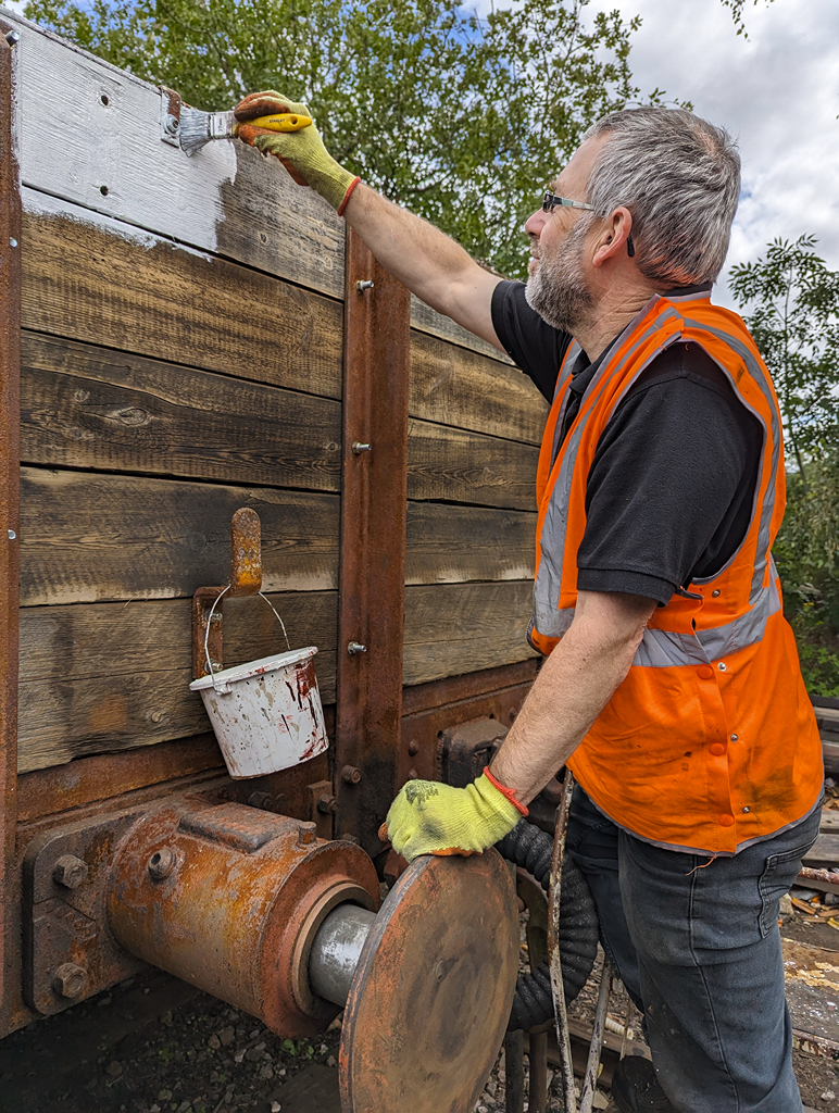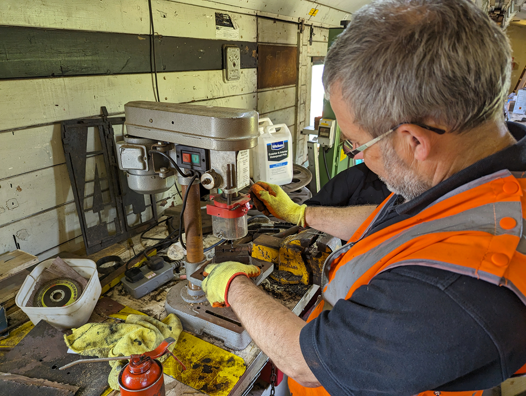Nick, Richard, Mark and Dan sequestered themselves under and around A6090 to begin the big scraped down of the underframe. We think the paint on the tank has been affected by being stored in a tunnel as it was coming off it large chunks.