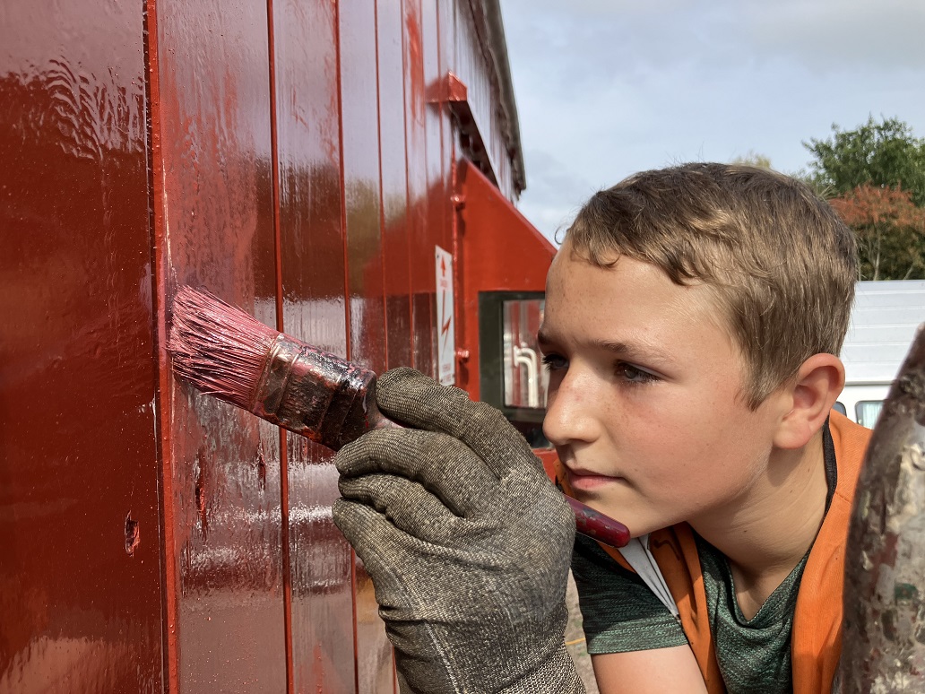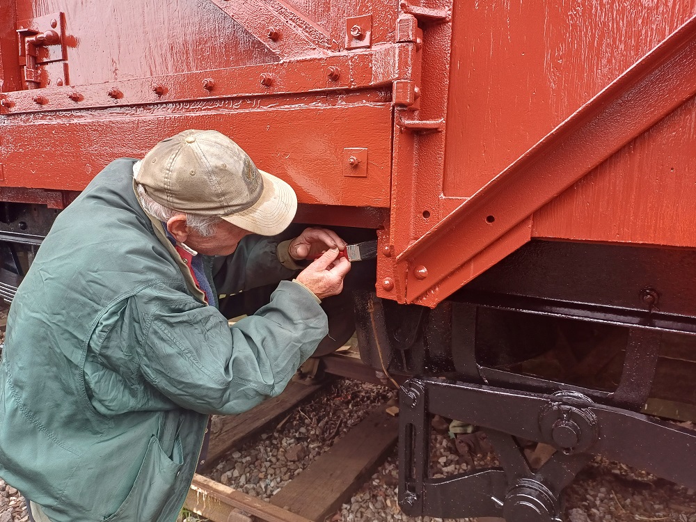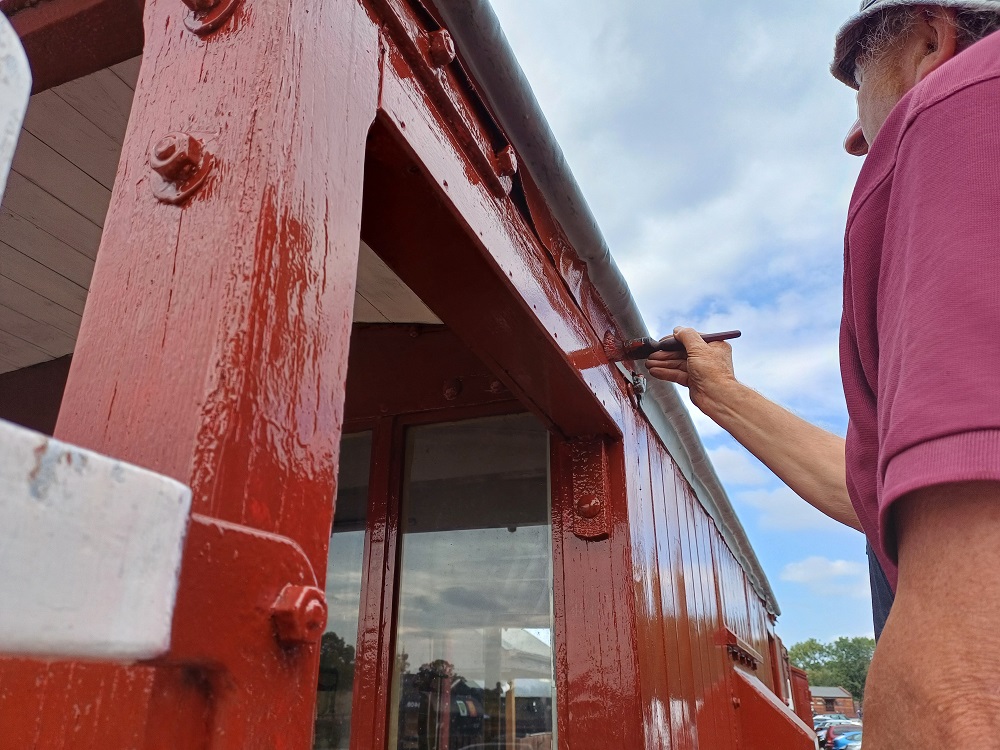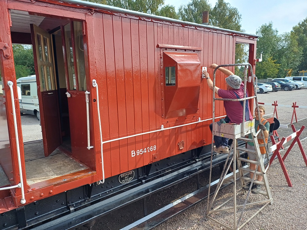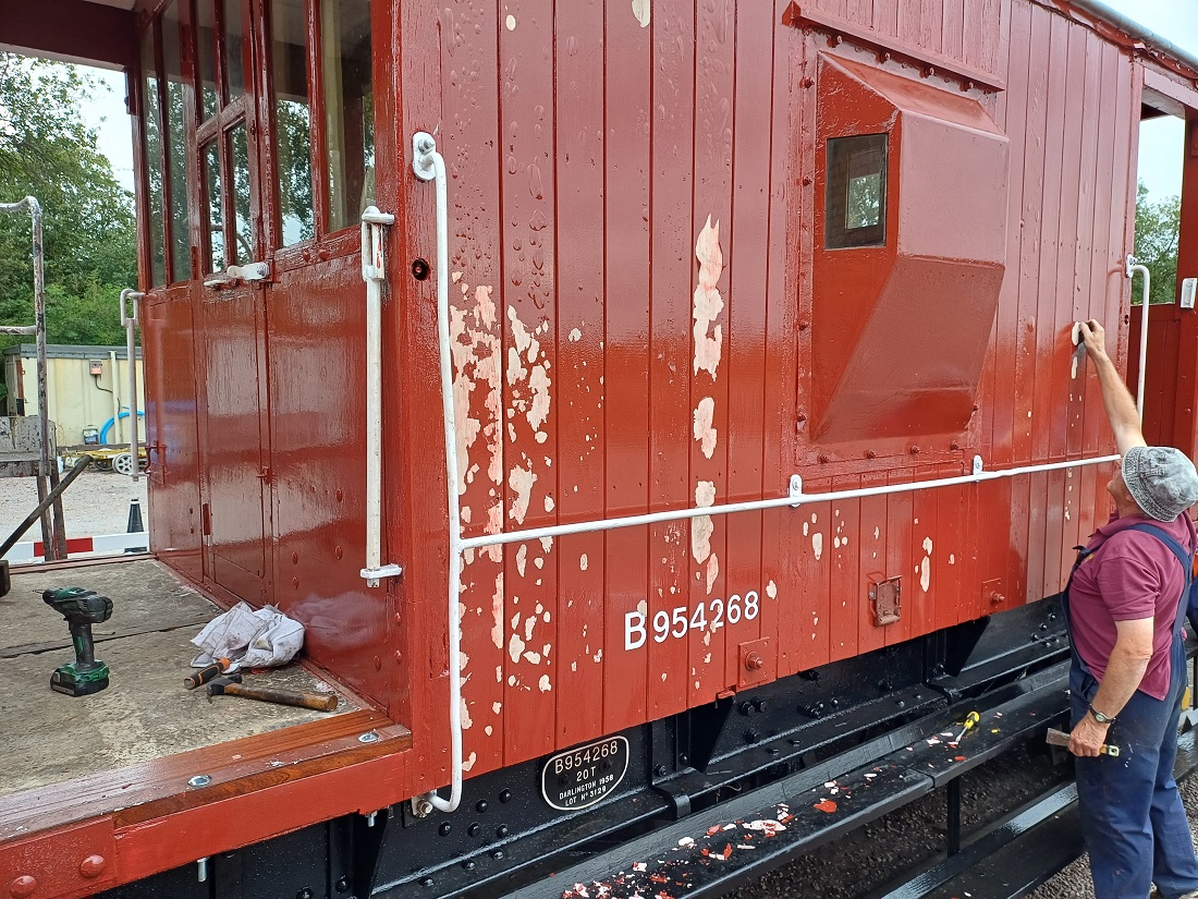 24th Dec – Nick, Ross, Mark and Tom fixed down the roof sheet at each end and along the sides of B777171. The top door frame was refitted to both sides and the roof sheet fully fitted and finished. The roof coverings of P18422 were removed down to the bare wood. Oliver and Charlie assisting tiding up the old roof coverings then cleaning and painting the roof hoops.
