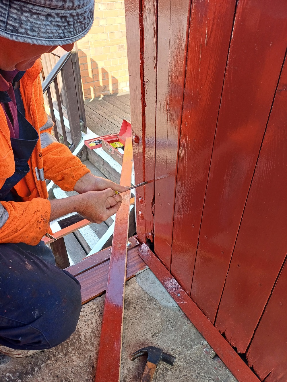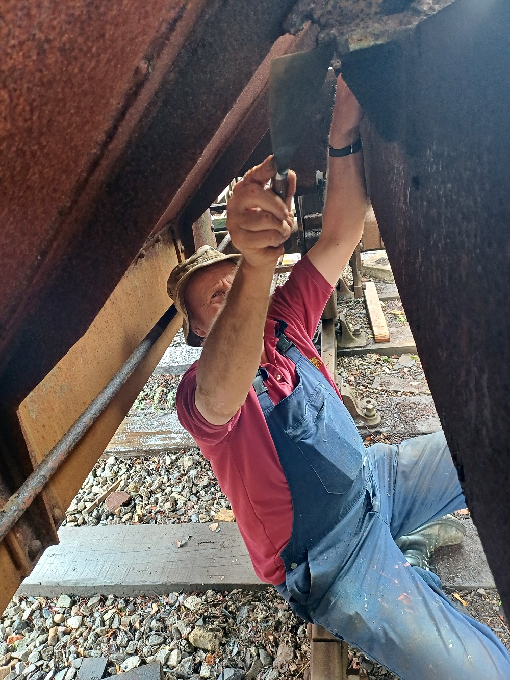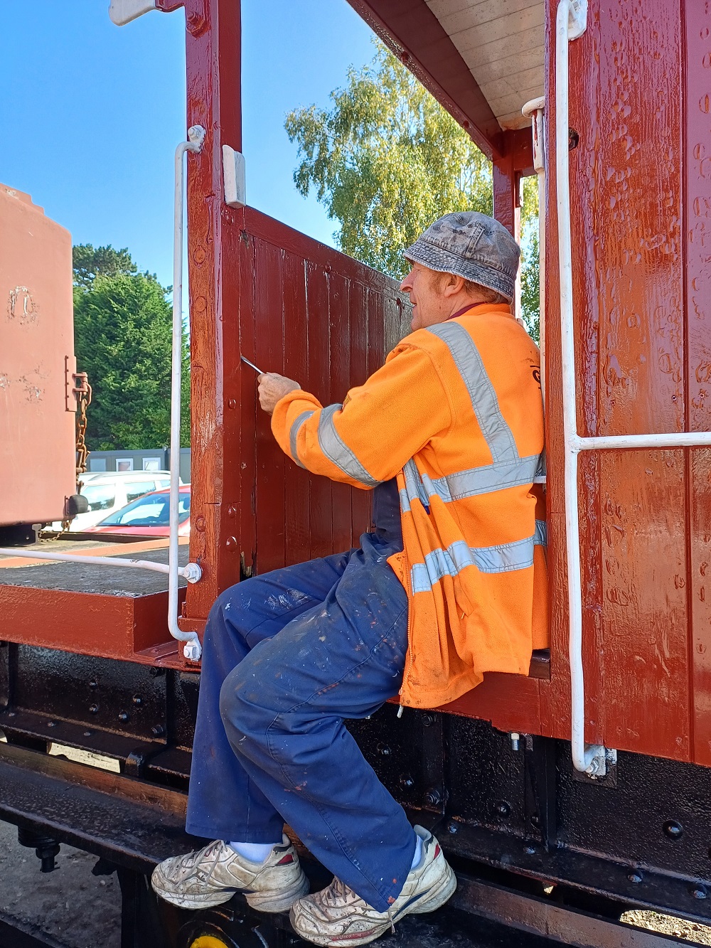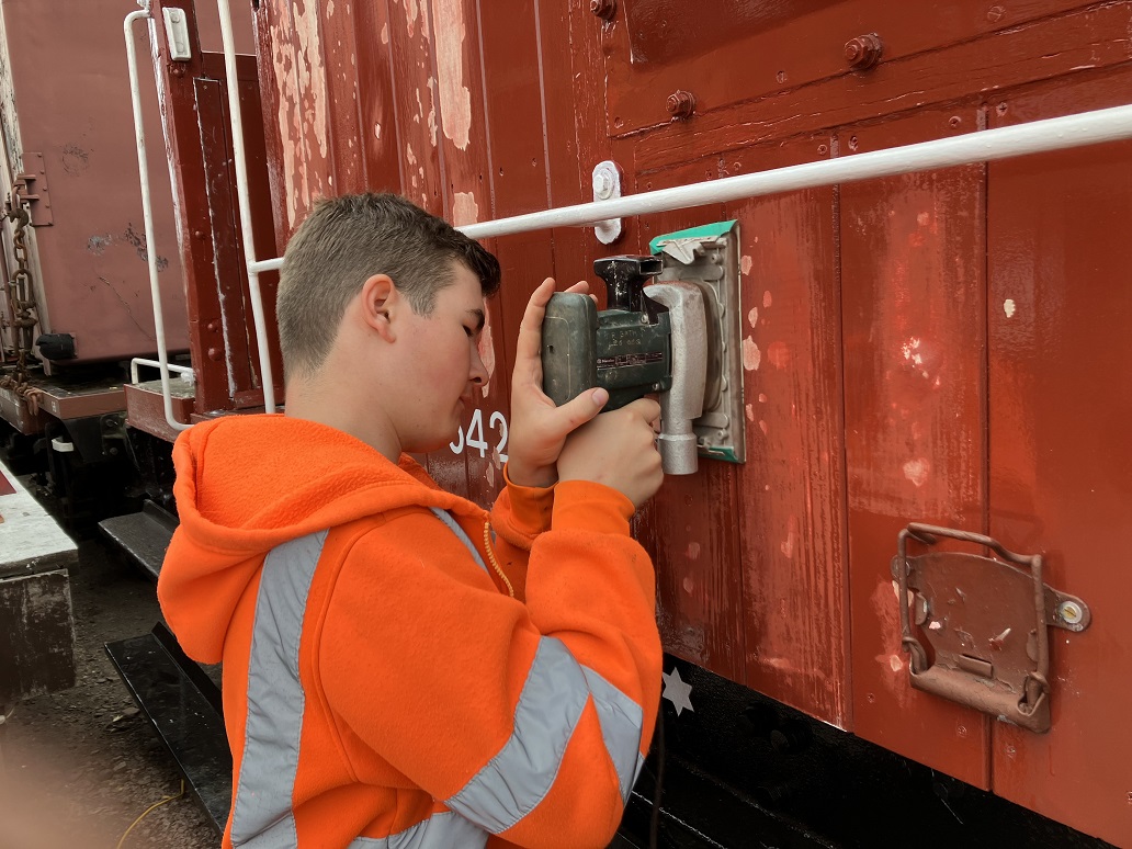 24th Dec – Nick, Ross, Mark and Tom fixed down the roof sheet at each end and along the sides of B777171. The top door frame was refitted to both sides and the roof sheet fully fitted and finished. The roof coverings of P18422 were removed down to the bare wood. Oliver and Charlie assisting tiding up the old roof coverings then cleaning and painting the roof hoops.