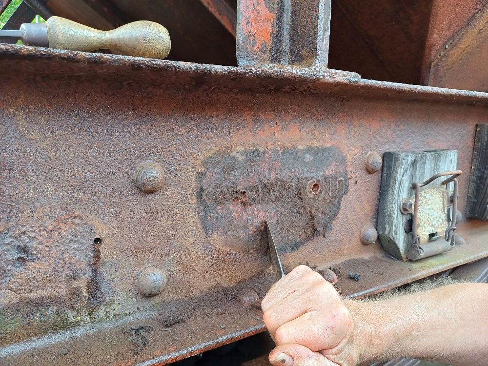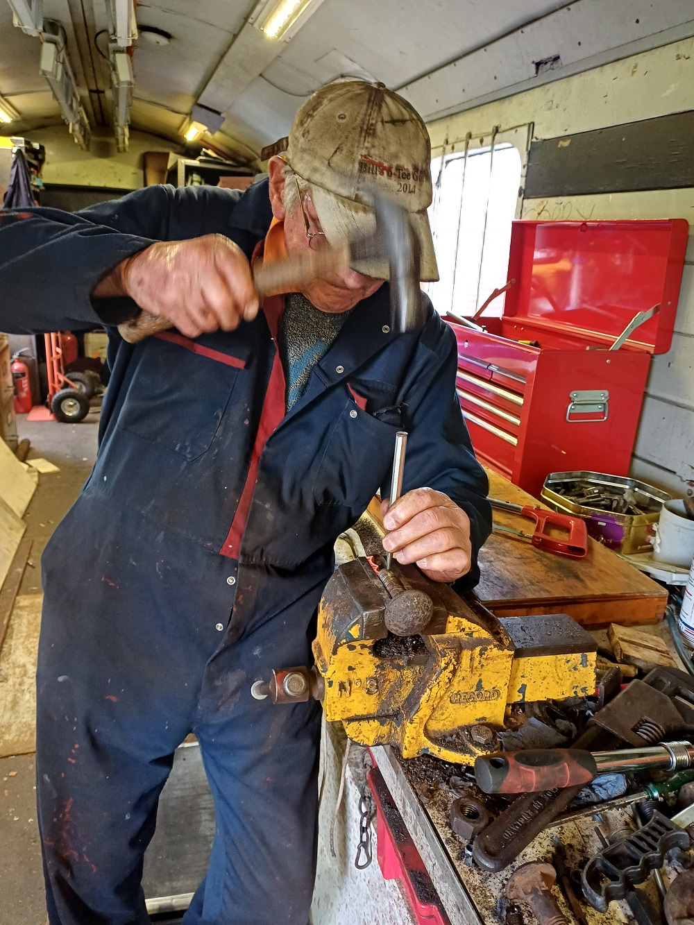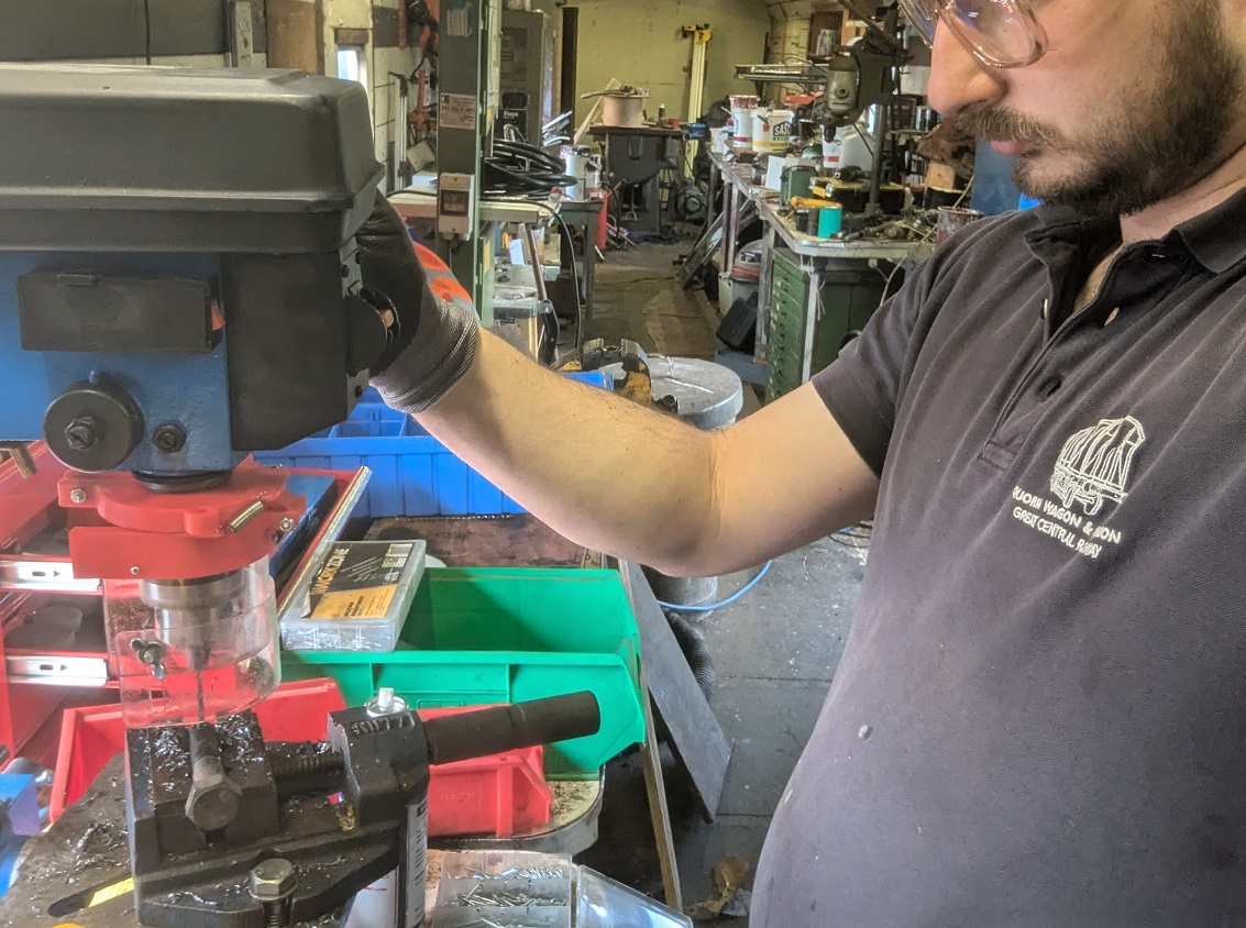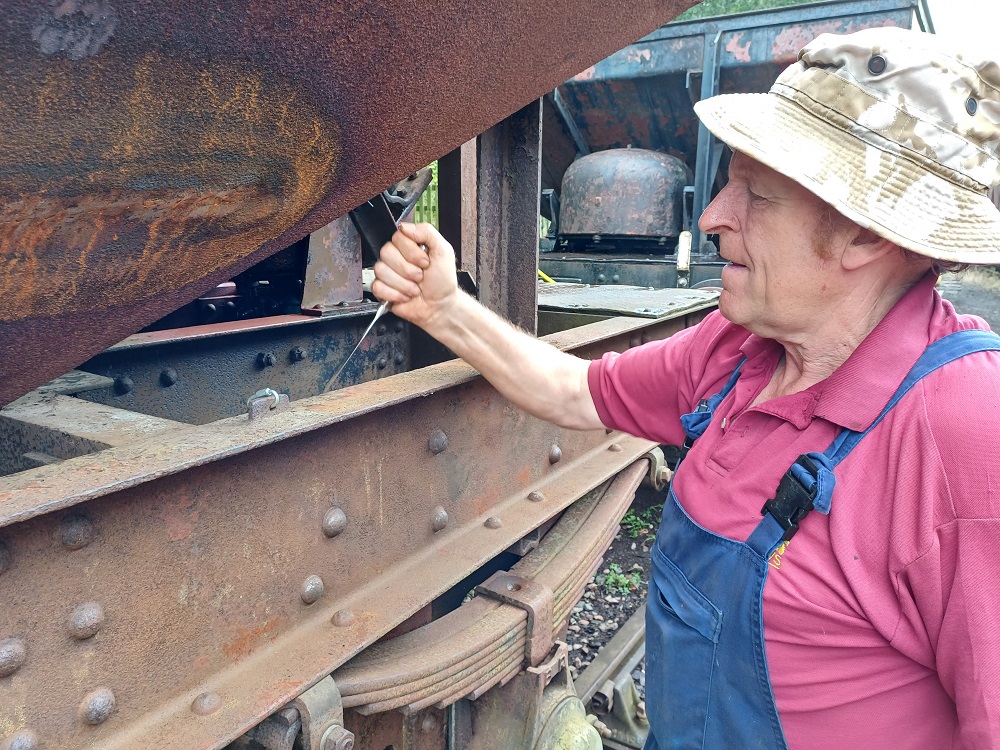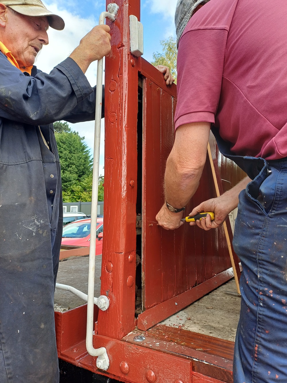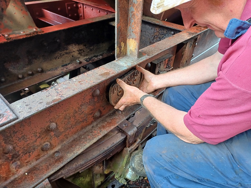 Ernie finished off drilling the split pin hole in a new door hinge pin that he had made to replace a missing one on the Lowfit. The new pin was then fitted to the wagon.