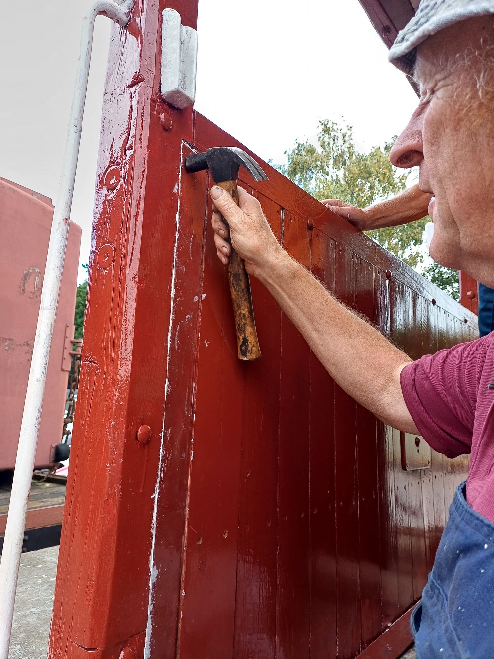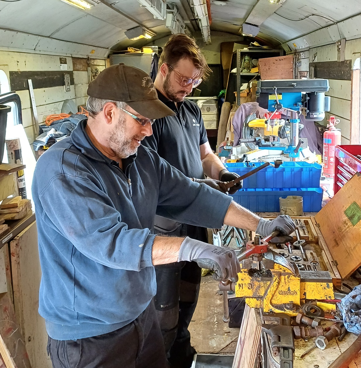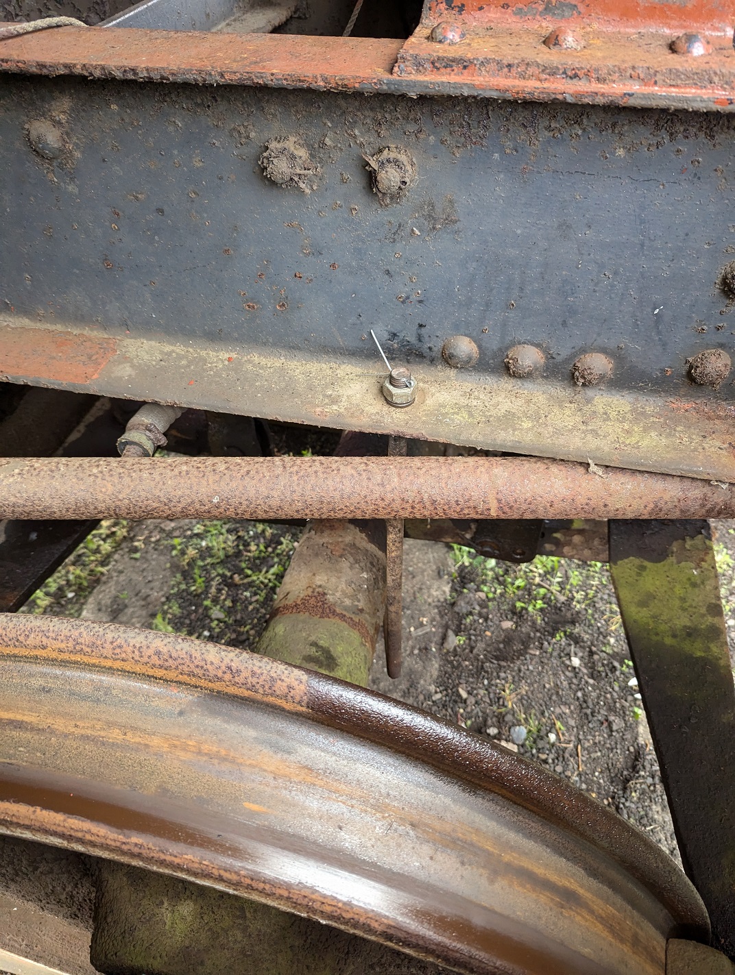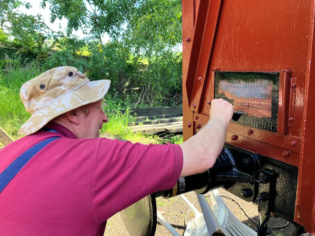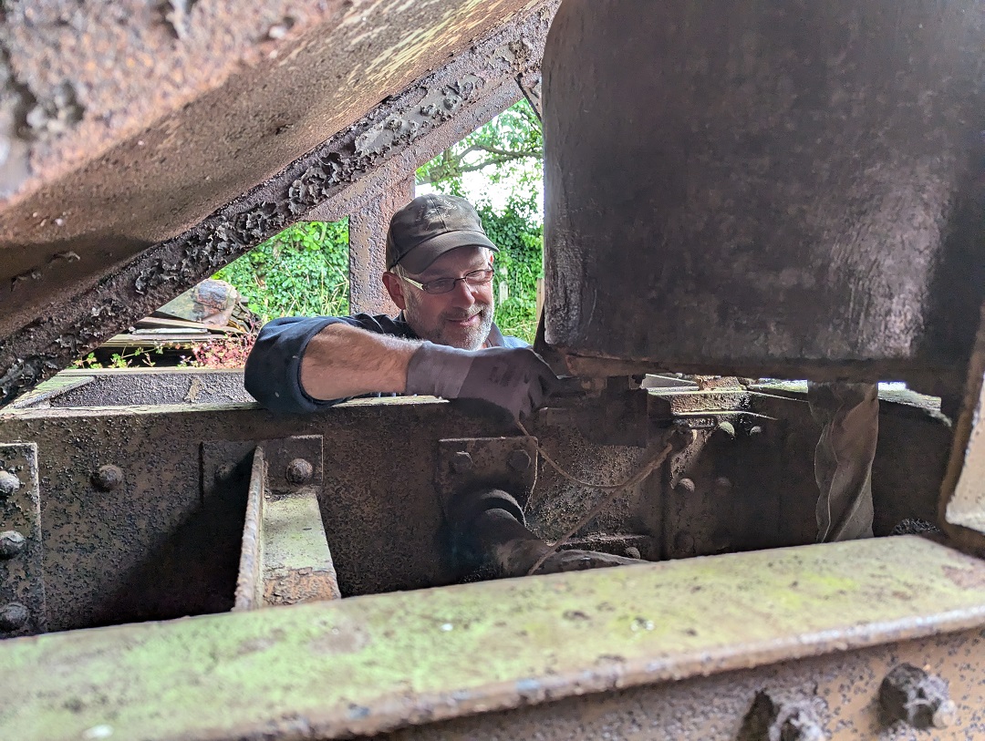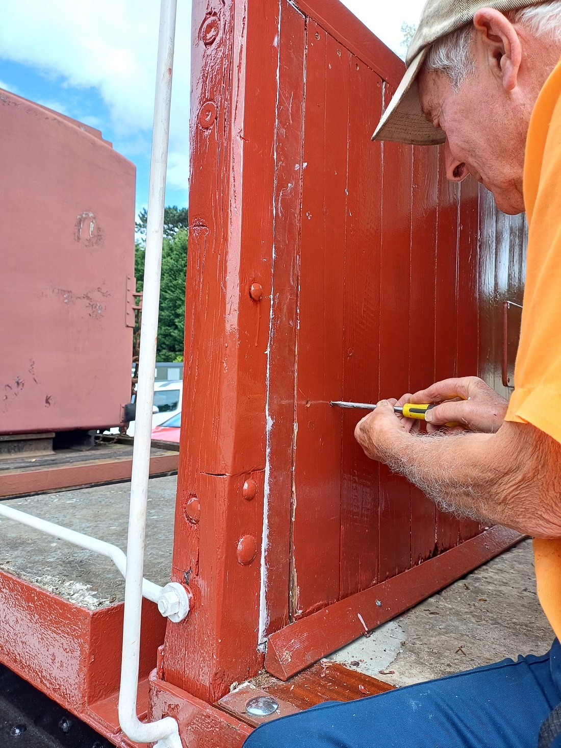 Ernie finished off drilling the split pin hole in a new door hinge pin that he had made to replace a missing one on the Lowfit. The new pin was then fitted to the wagon.