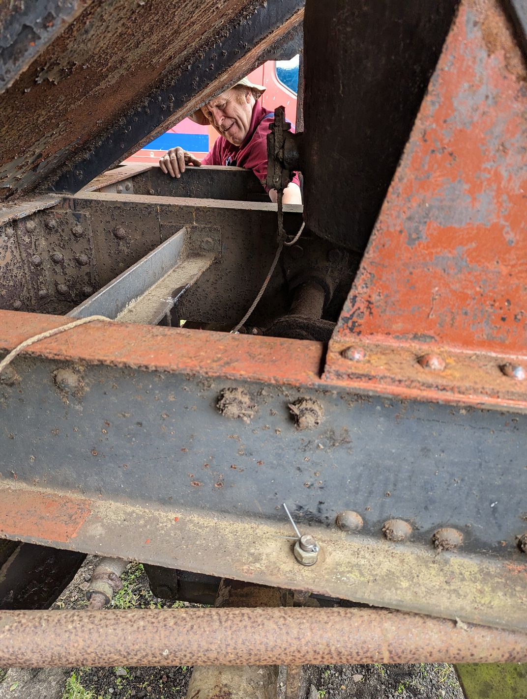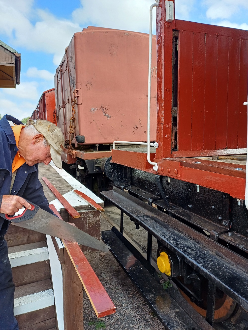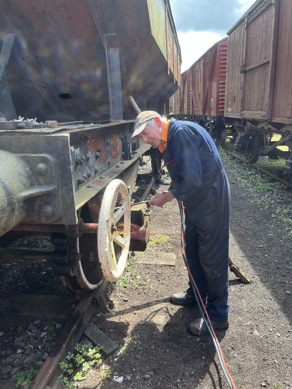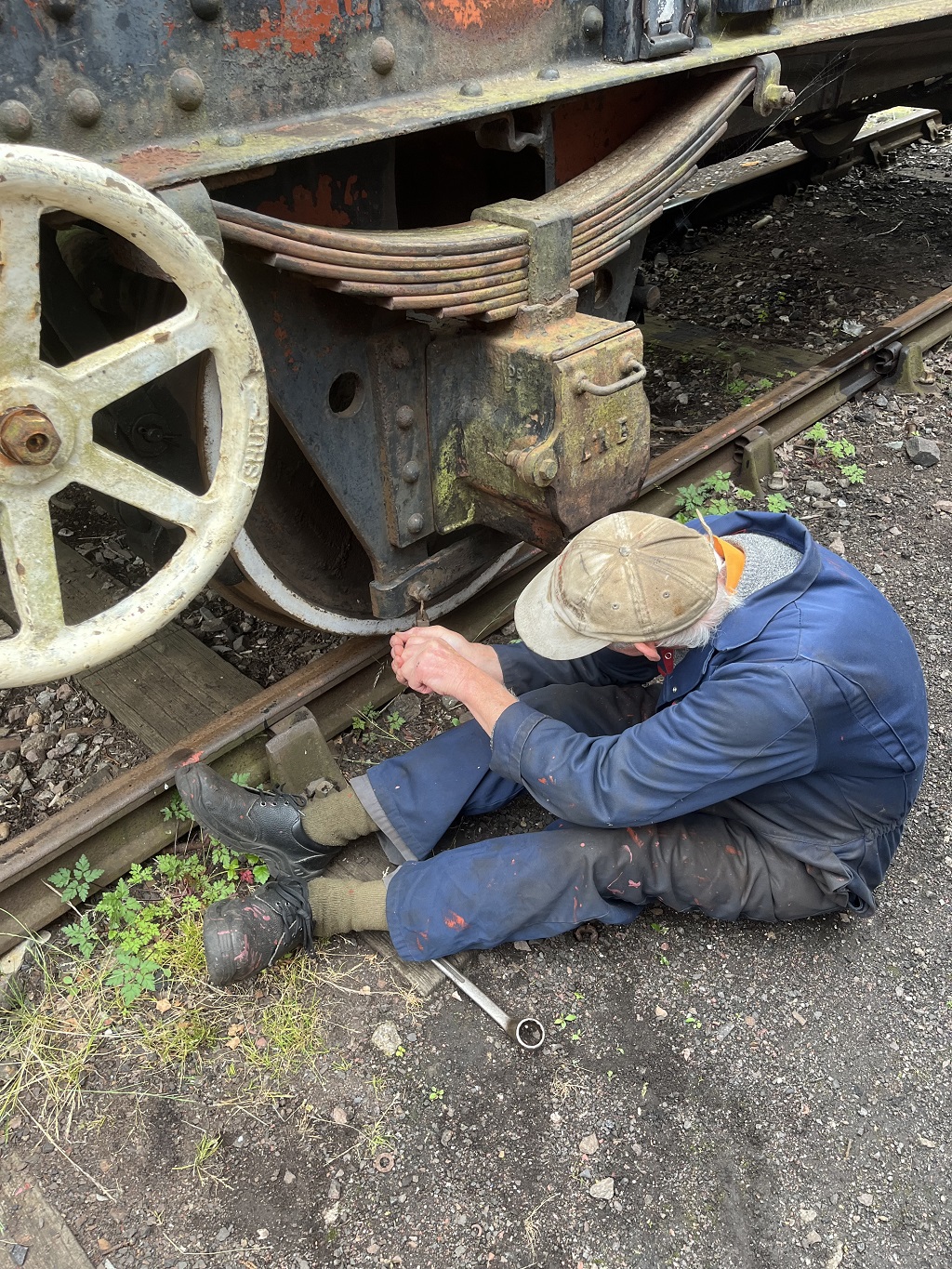 Ernie finished off drilling the split pin hole in a new door hinge pin that he had made to replace a missing one on the Lowfit. The new pin was then fitted to the wagon.