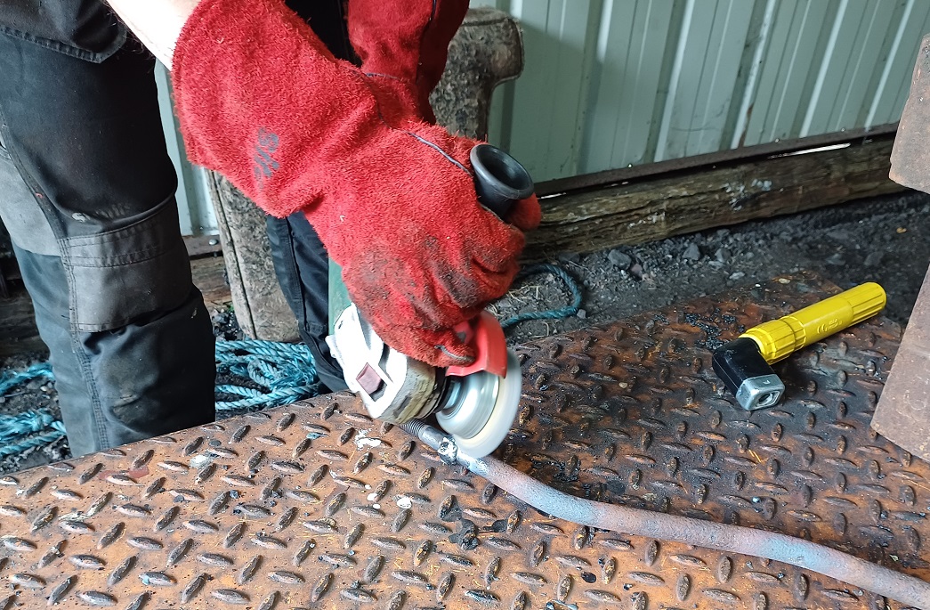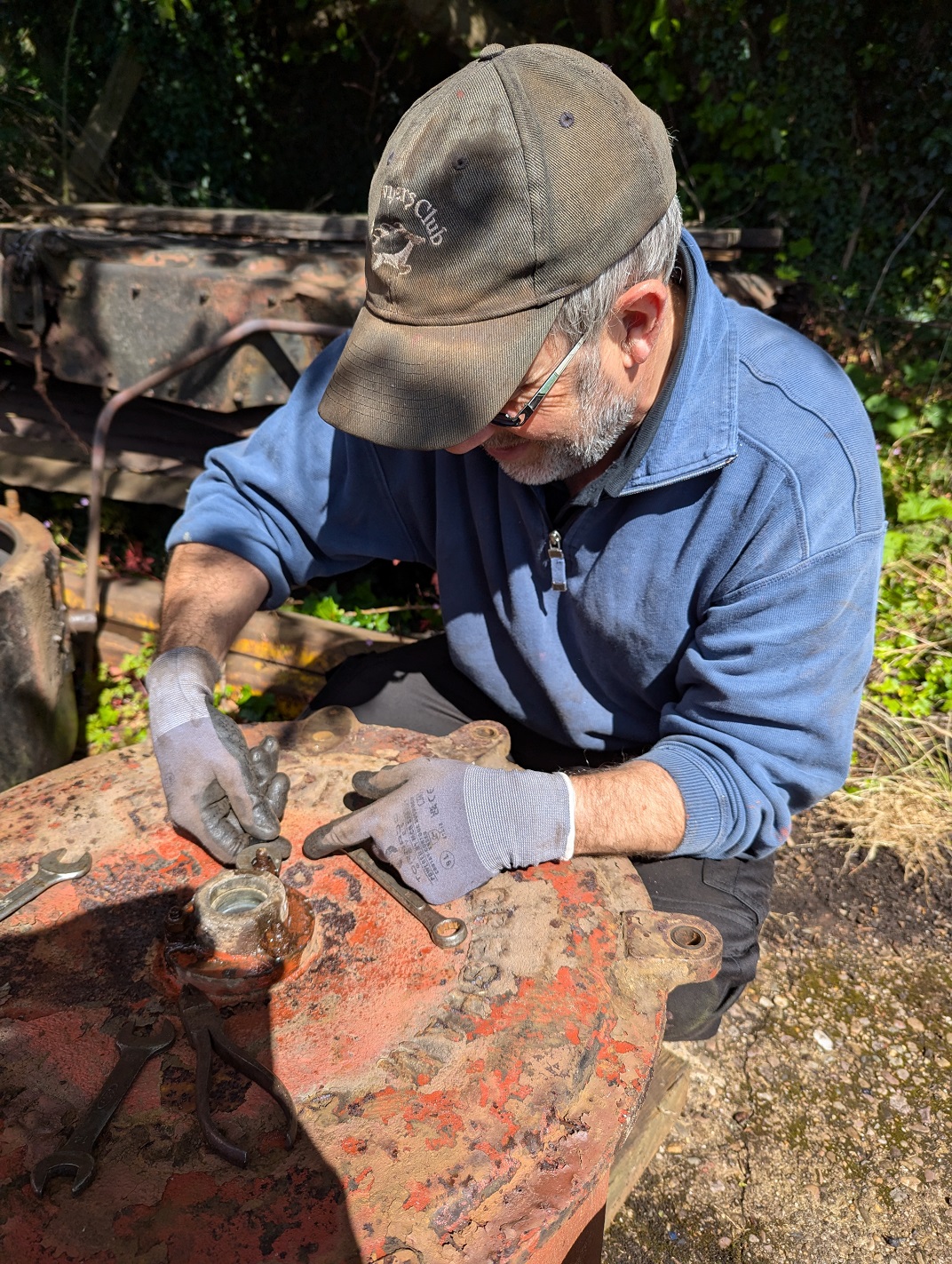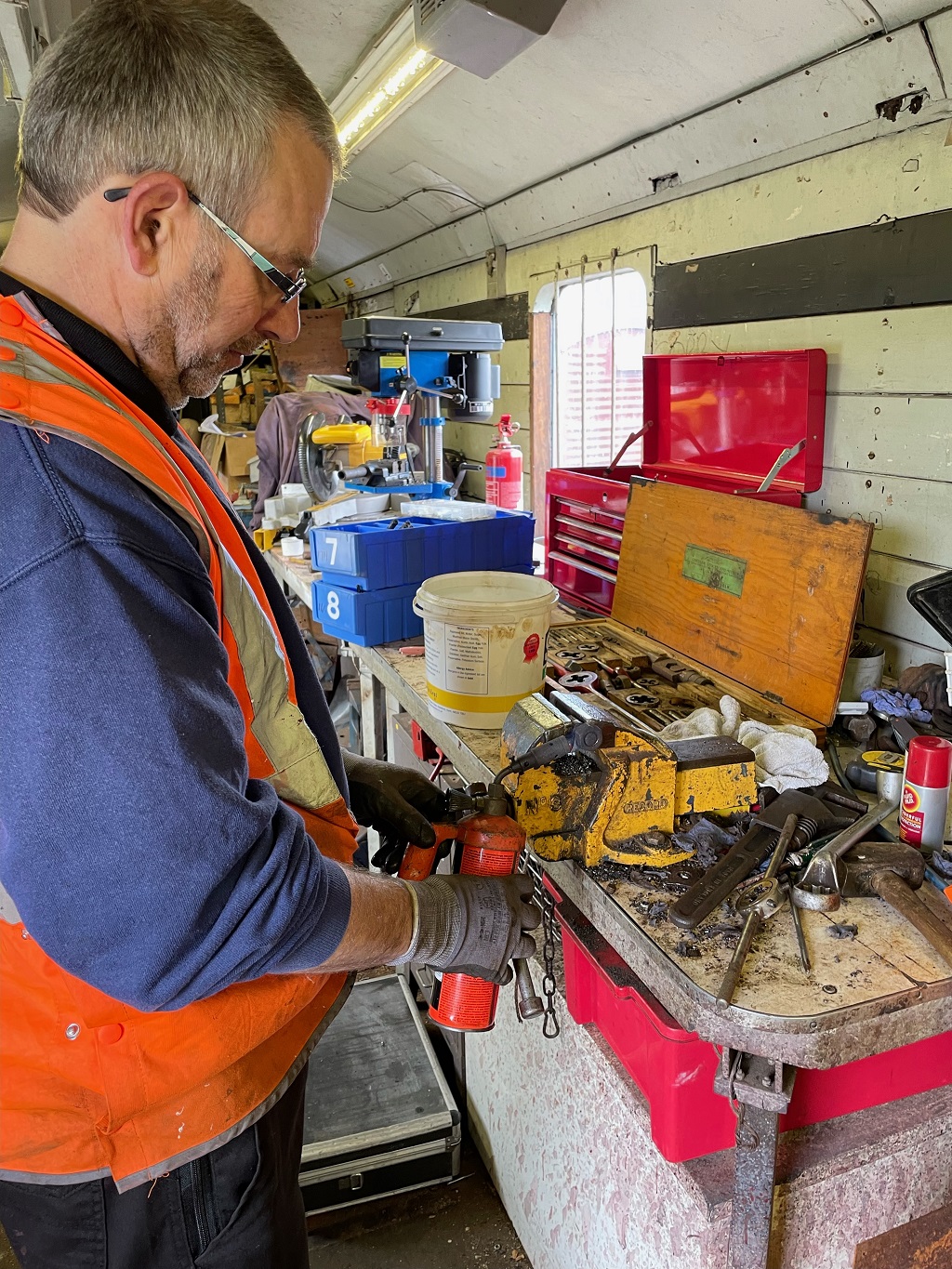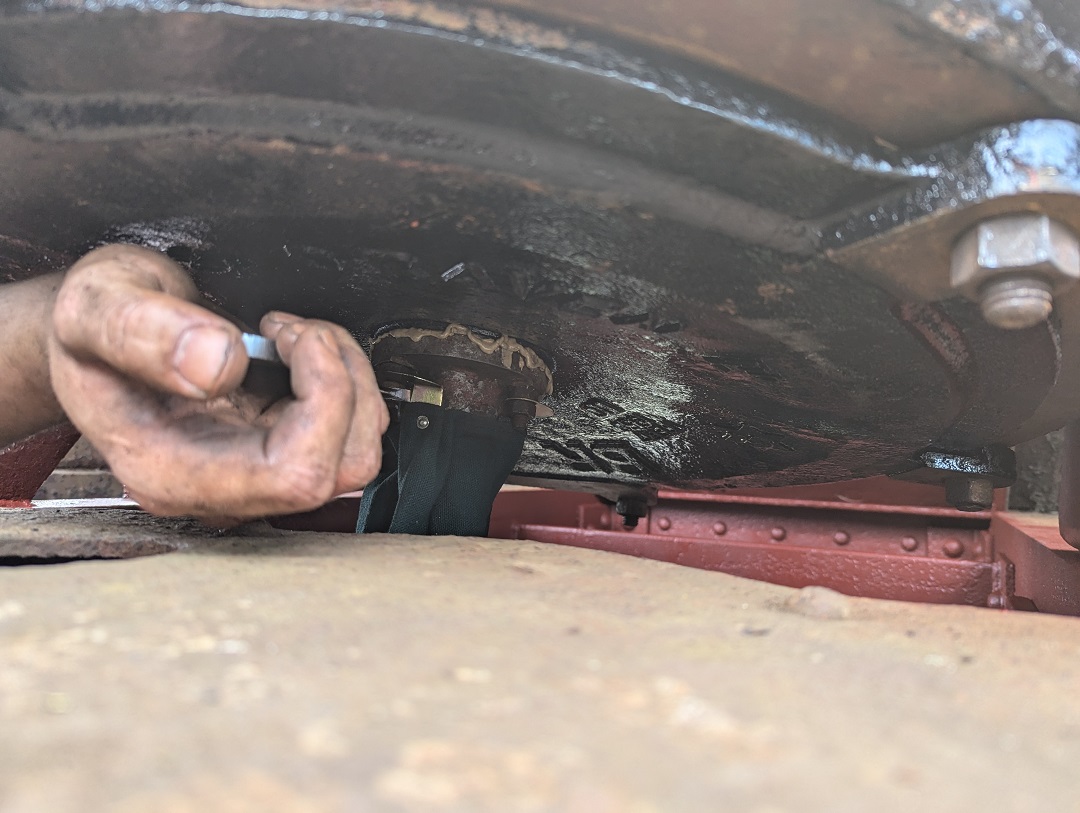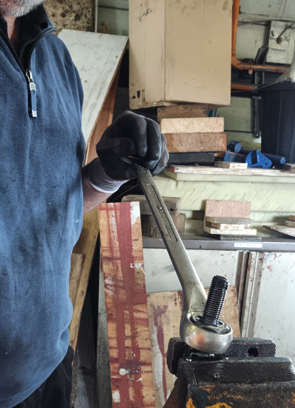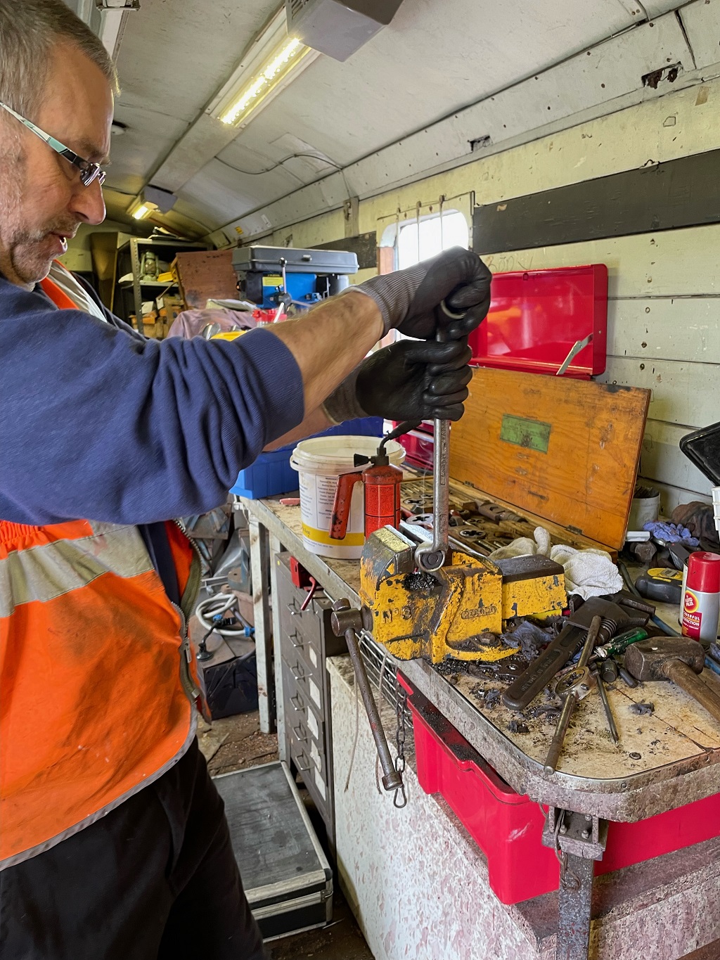 Ernie finished off drilling the split pin hole in a new door hinge pin that he had made to replace a missing one on the Lowfit. The new pin was then fitted to the wagon.