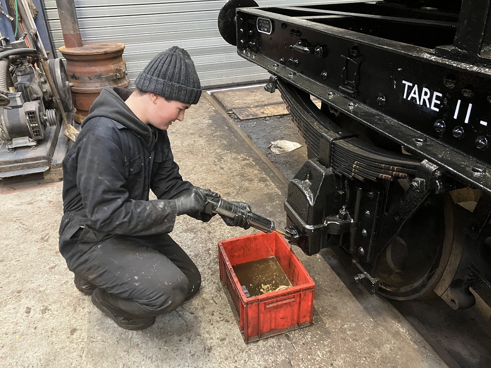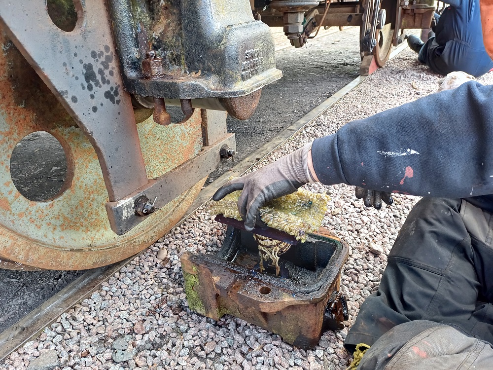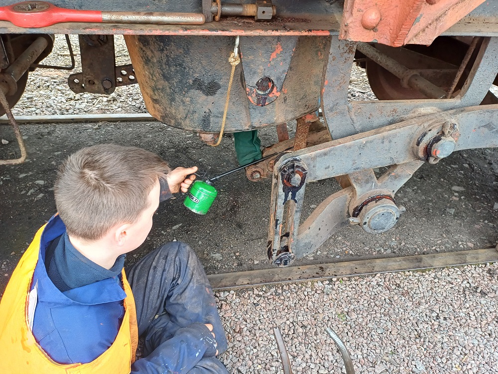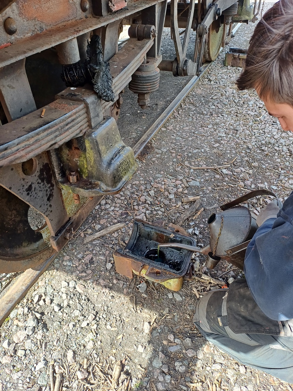 With the new wheelsets in place Ross, Richard, Ernie, Nick and myself set about removing the axlebox oil pans to clean out, check the oil pads & journals and replenish with new oil. The axlebox keep plates were also re-fitted, and Charlie helped out oiling all the brake rigging.