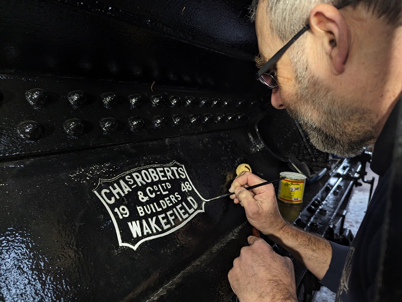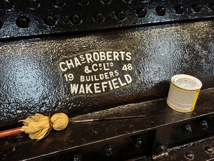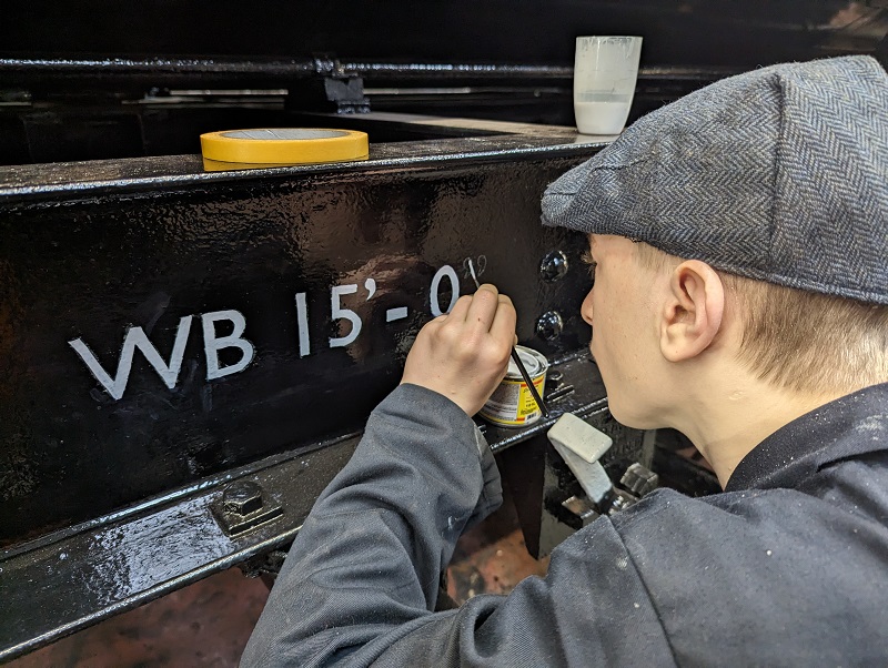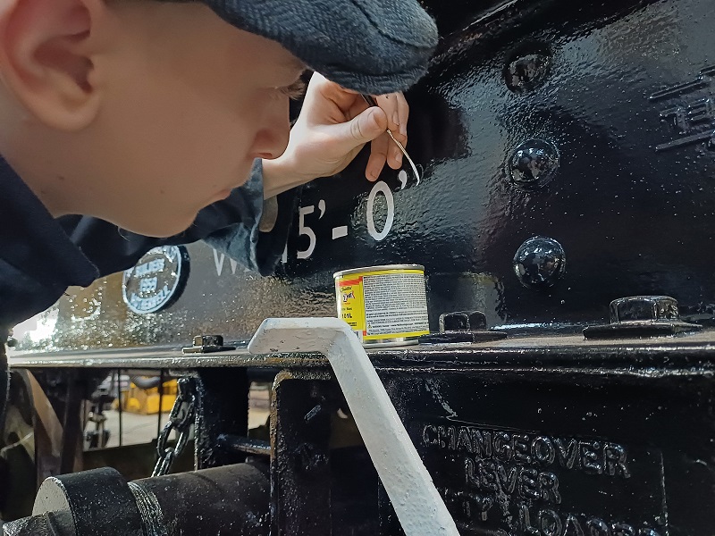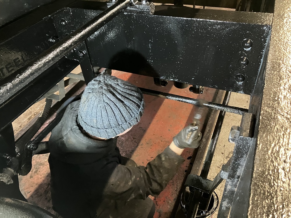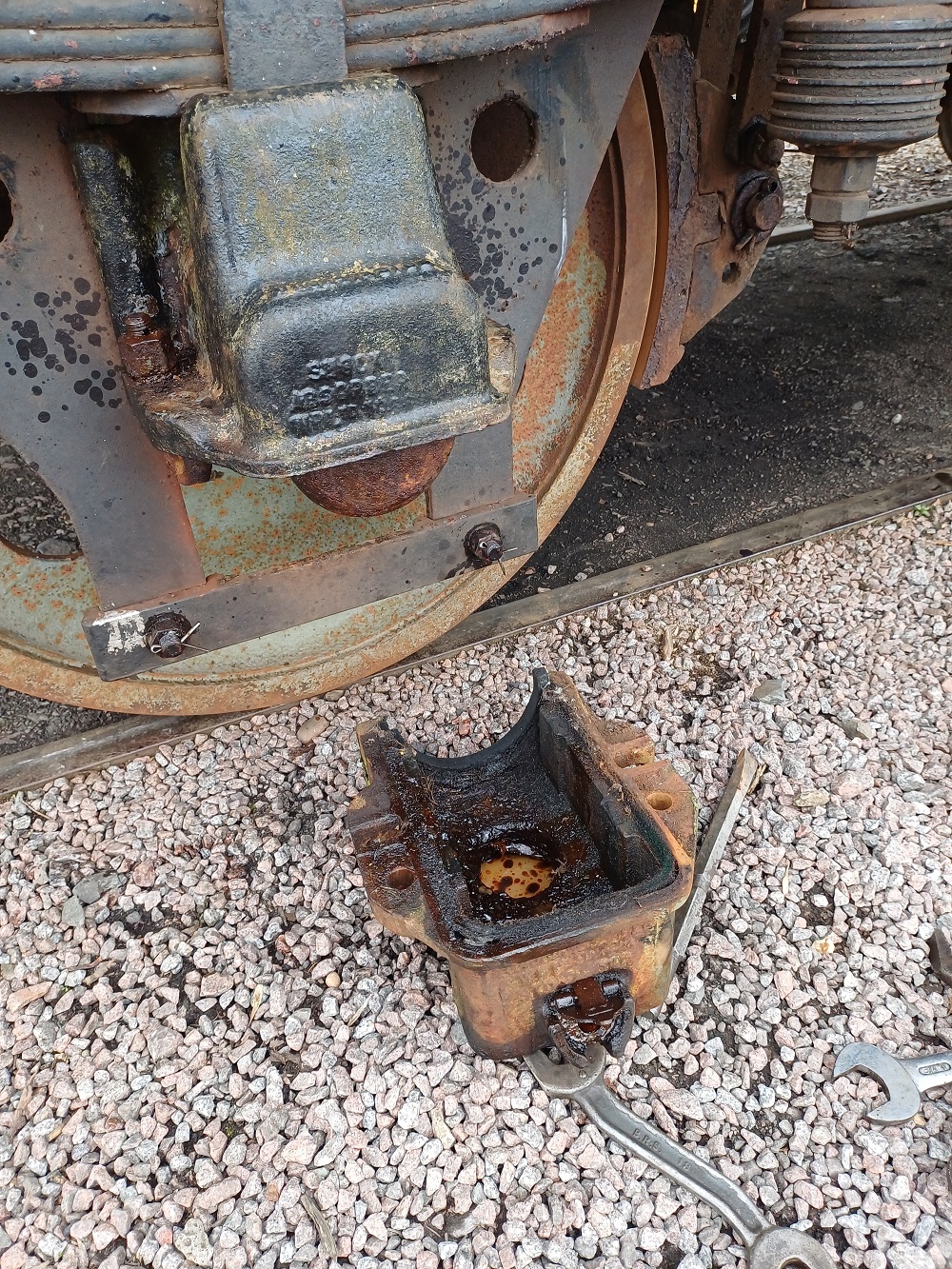 With the new wheelsets in place Ross, Richard, Ernie, Nick and myself set about removing the axlebox oil pans to clean out, check the oil pads & journals and replenish with new oil. The axlebox keep plates were also re-fitted, and Charlie helped out oiling all the brake rigging.