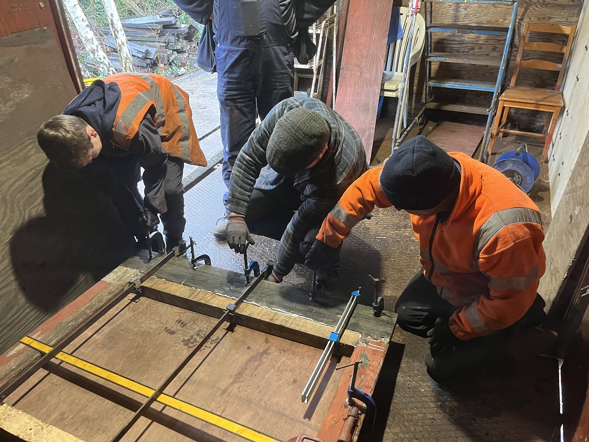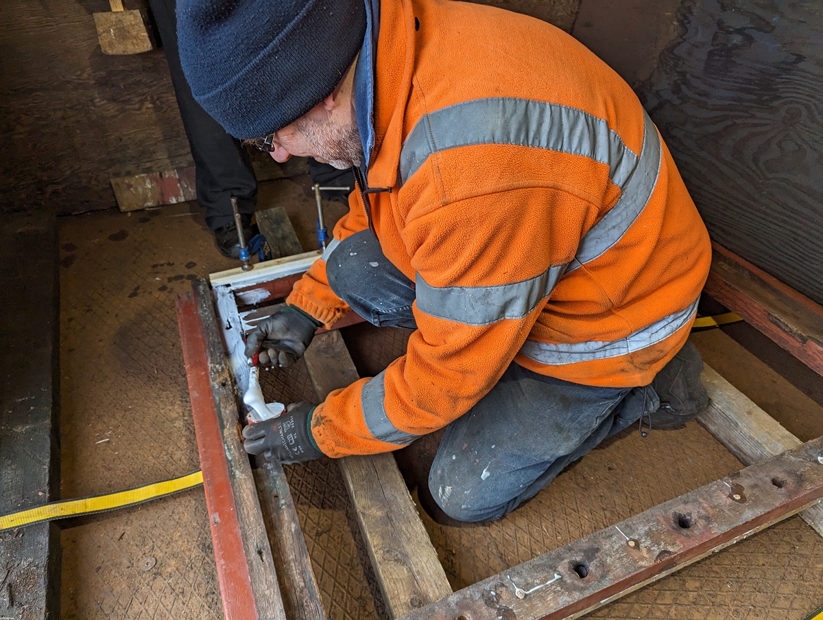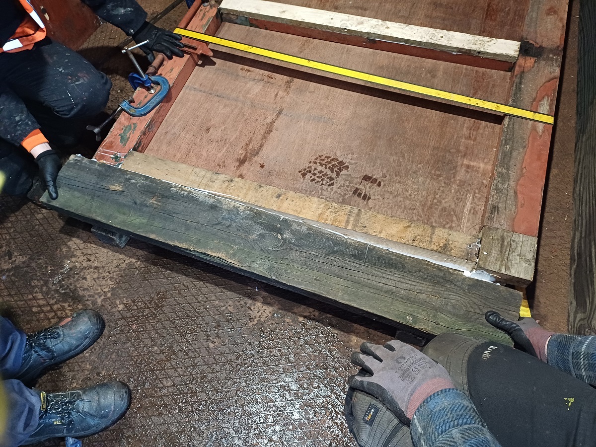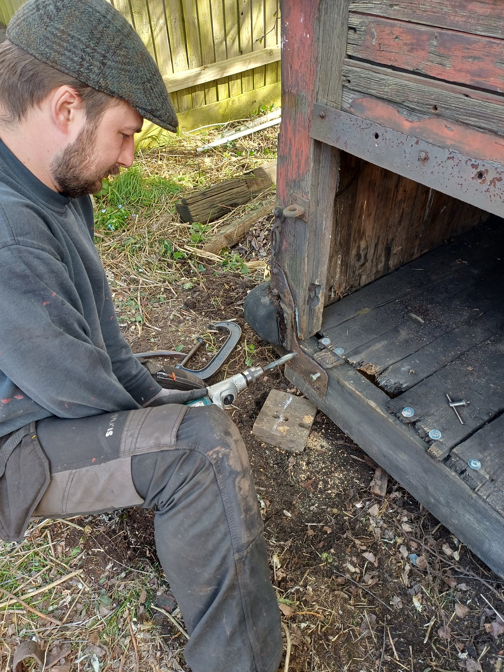 A new steel corner plate was cut and bent to shape by Ross, then fitted in place by Tom and Dan to replace the rotted one.