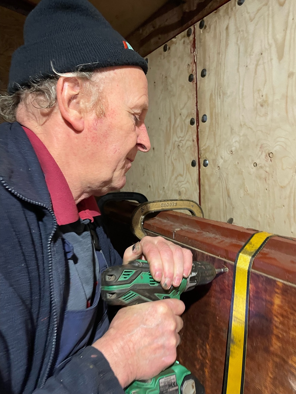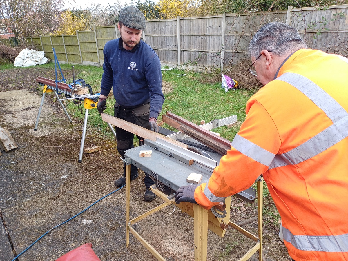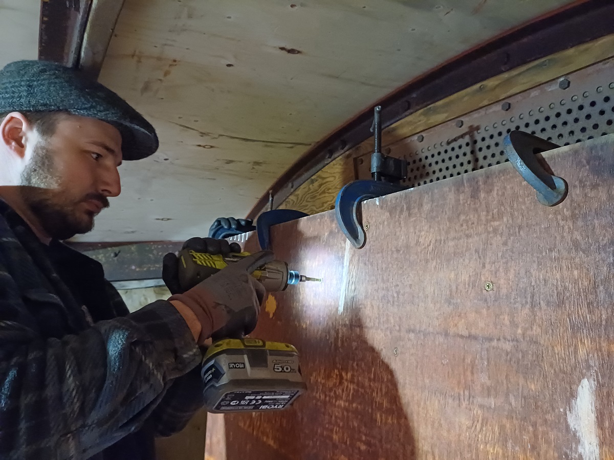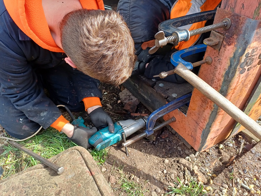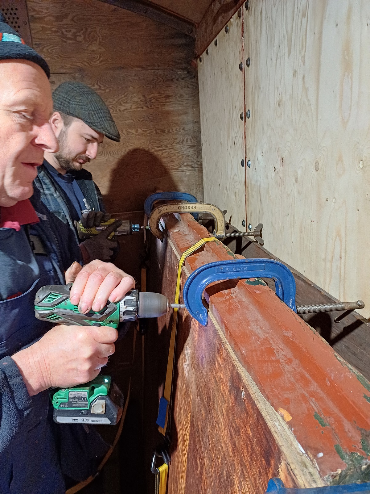 A new steel corner plate was cut and bent to shape by Ross, then fitted in place by Tom and Dan to replace the rotted one.