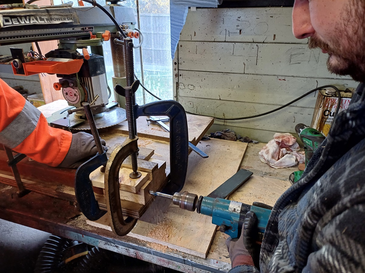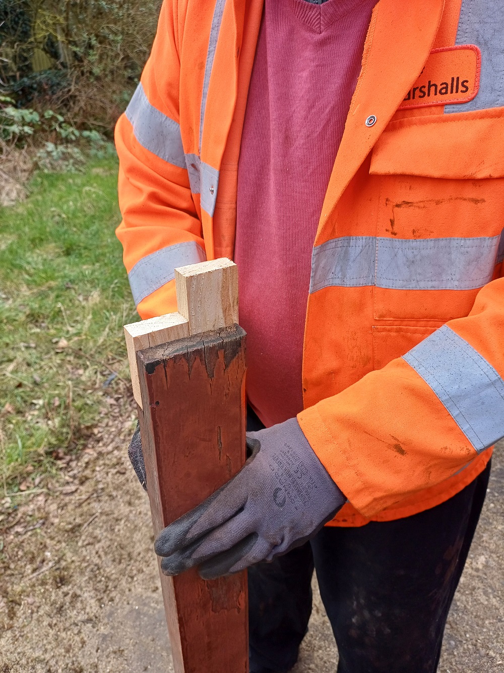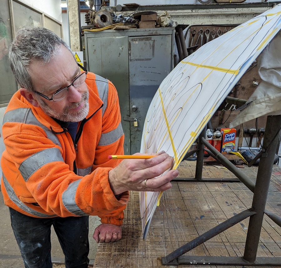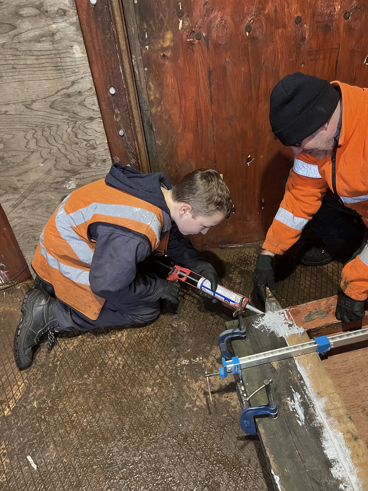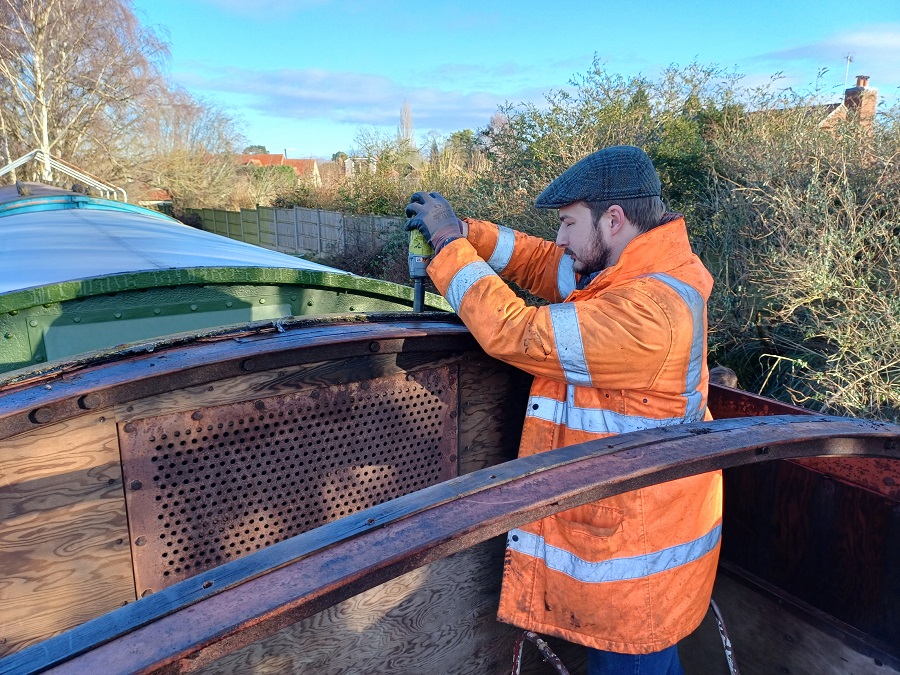 A new steel corner plate was cut and bent to shape by Ross, then fitted in place by Tom and Dan to replace the rotted one.