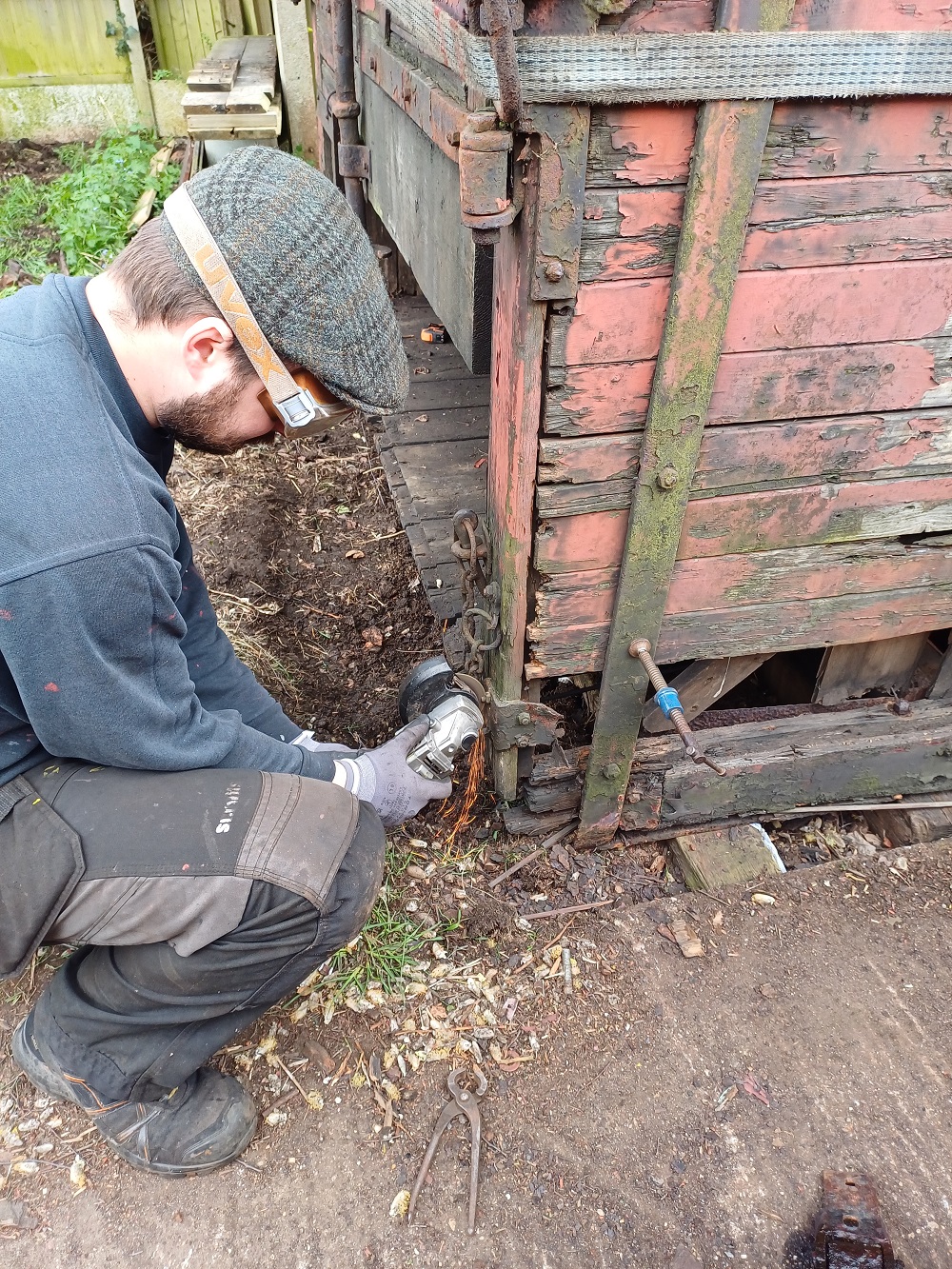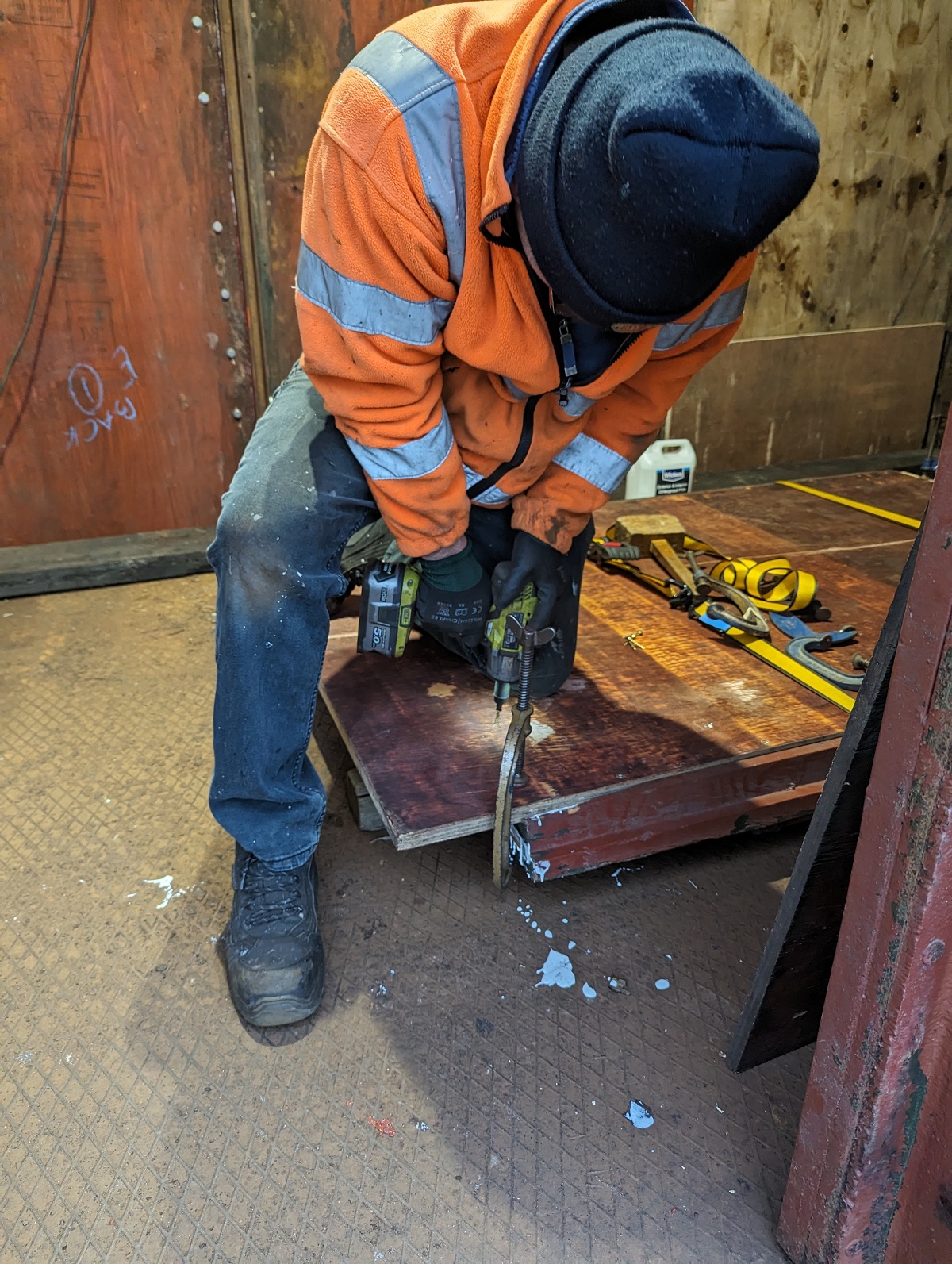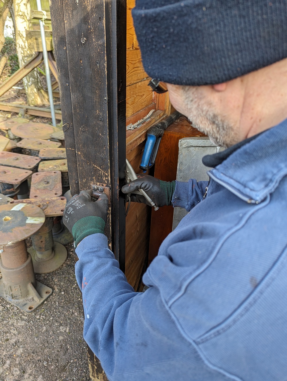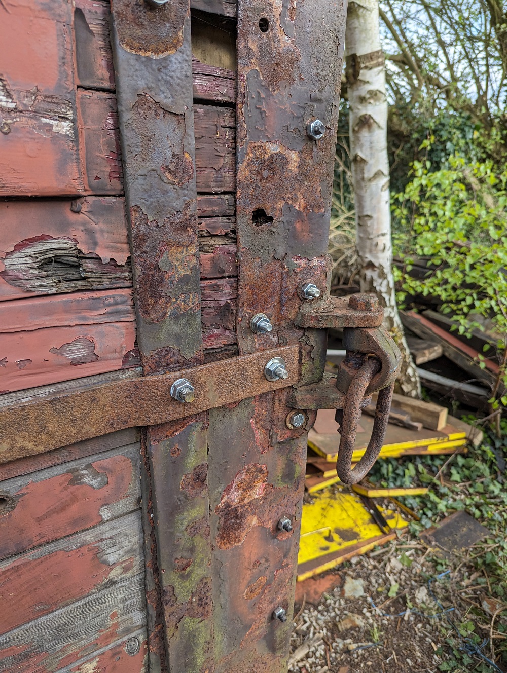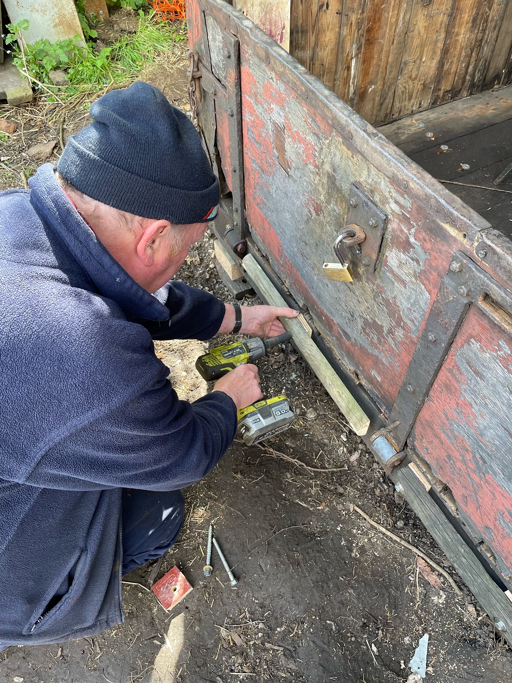 Nick, Ross, Oliver and Richard took a look at the A type container we had moved on Saturday. The hinges of the lower door section were freed off, and the outer edge of the floor secured to a new baton. Some adjustment was necessary with Nick’s favourite hammer and the grinder needed to remove the old corner rotted plate.