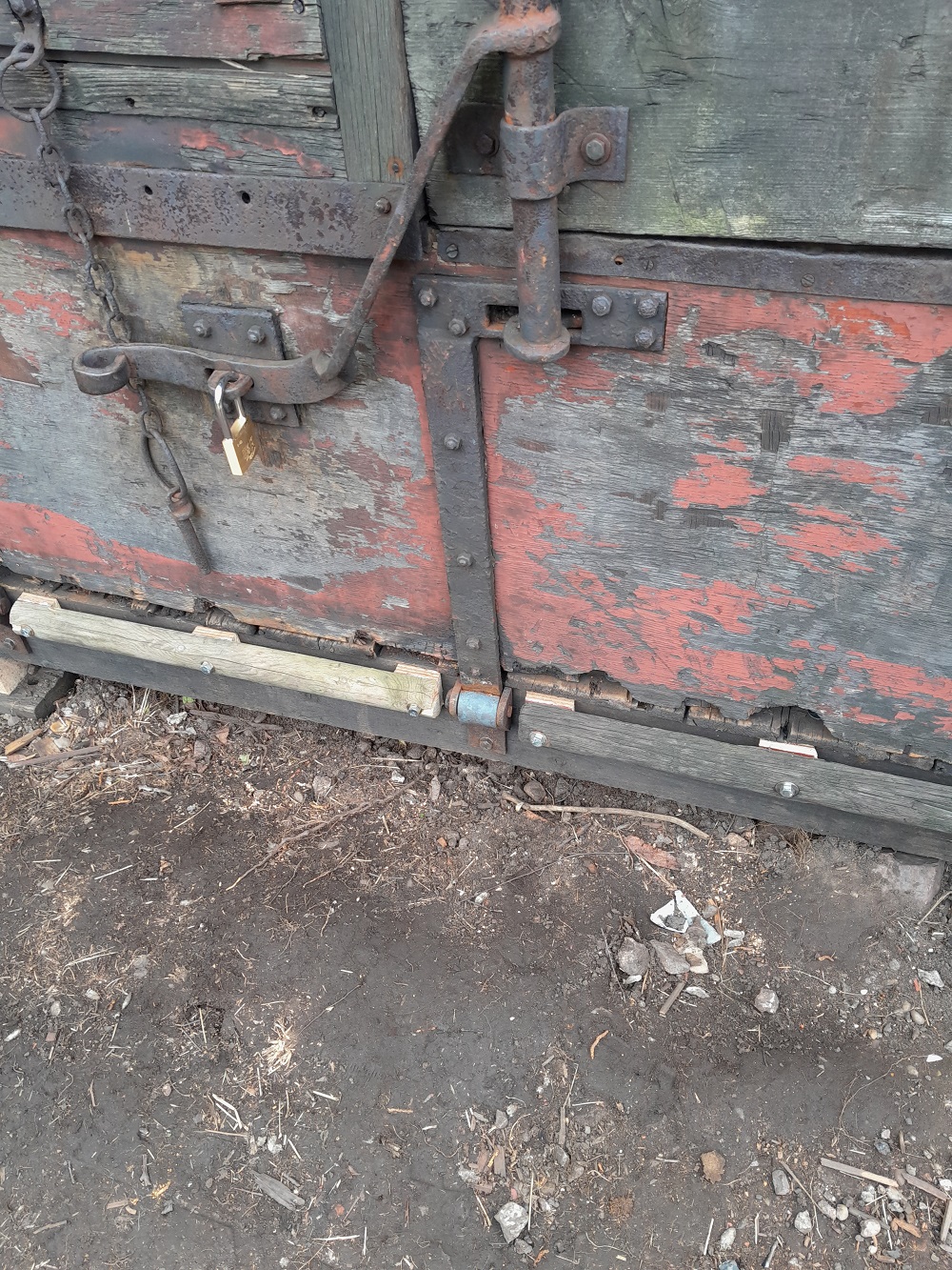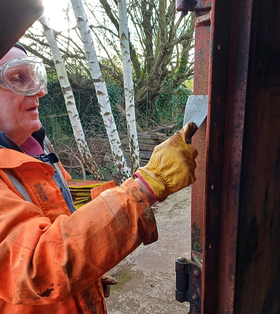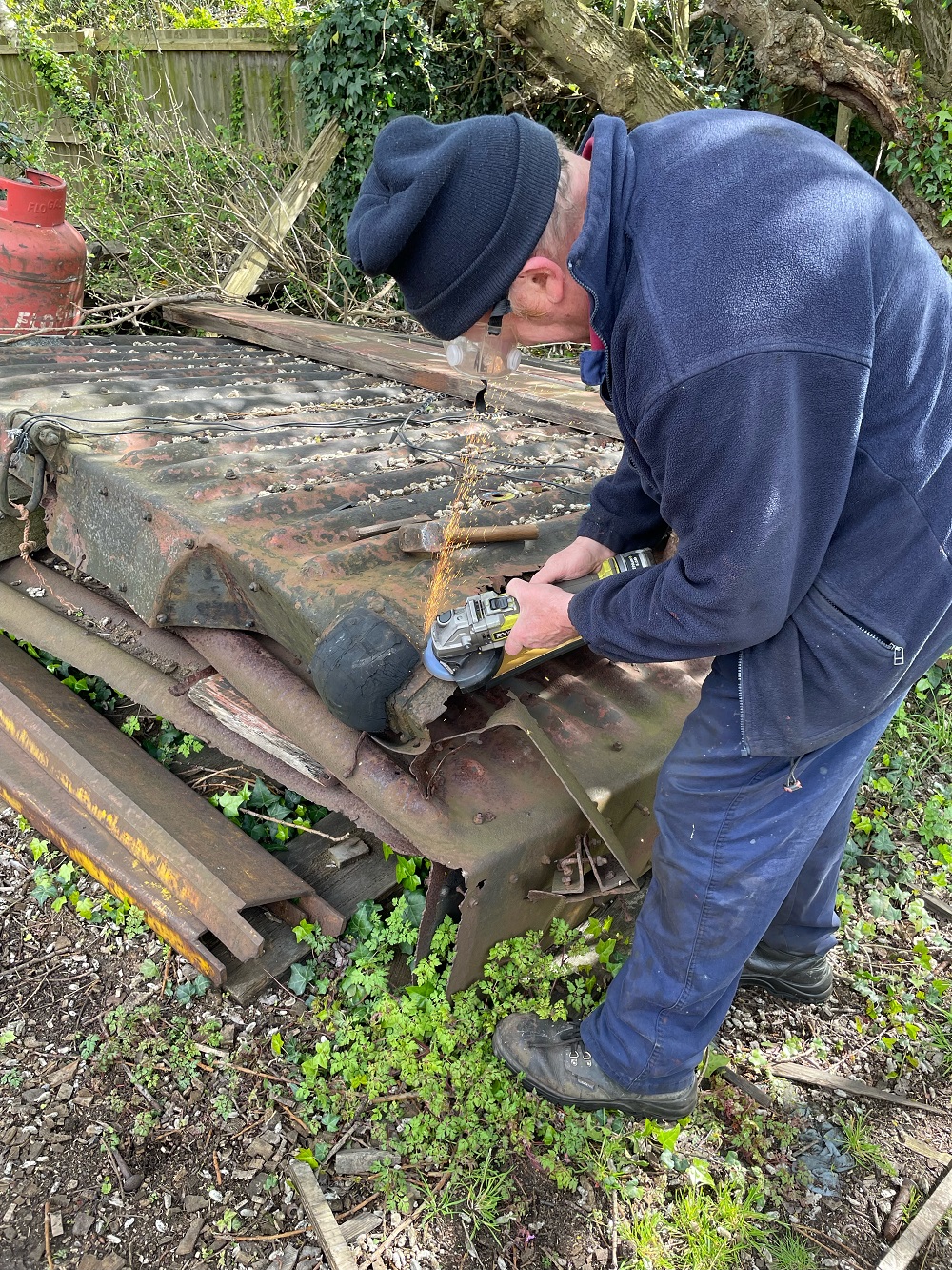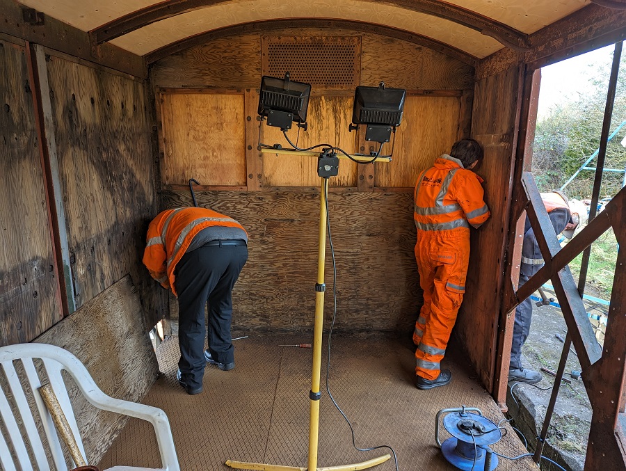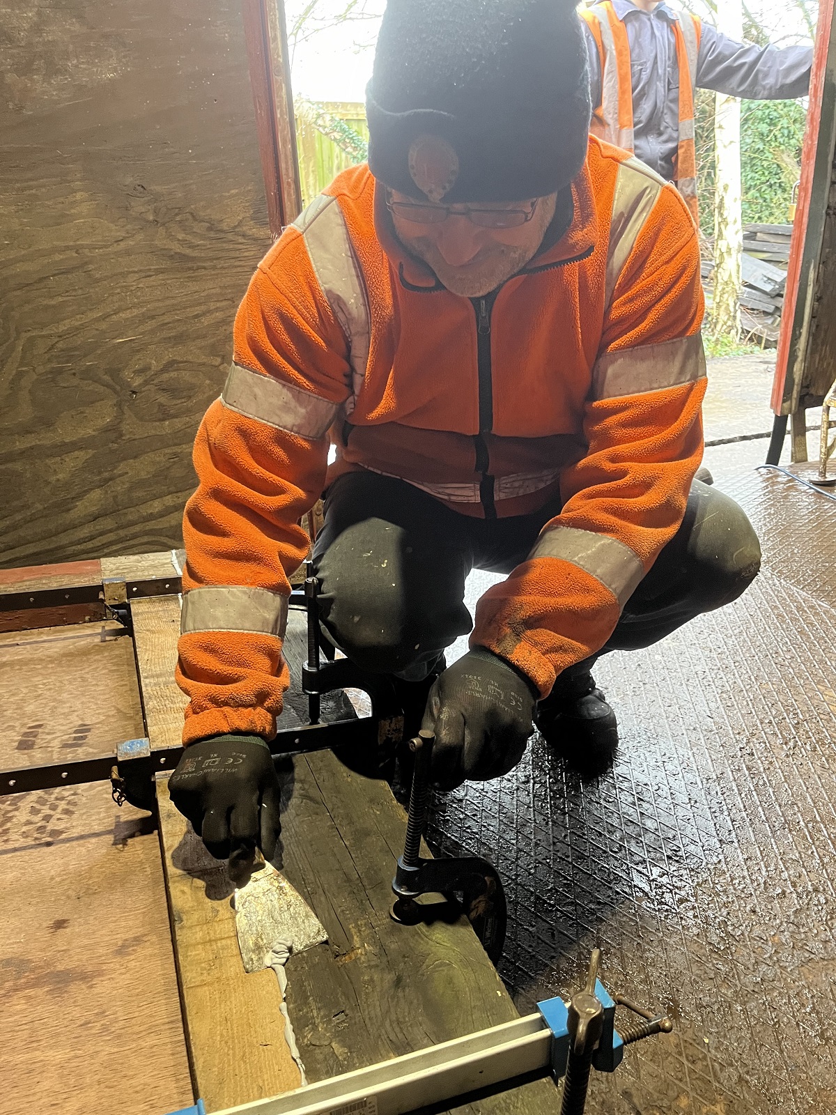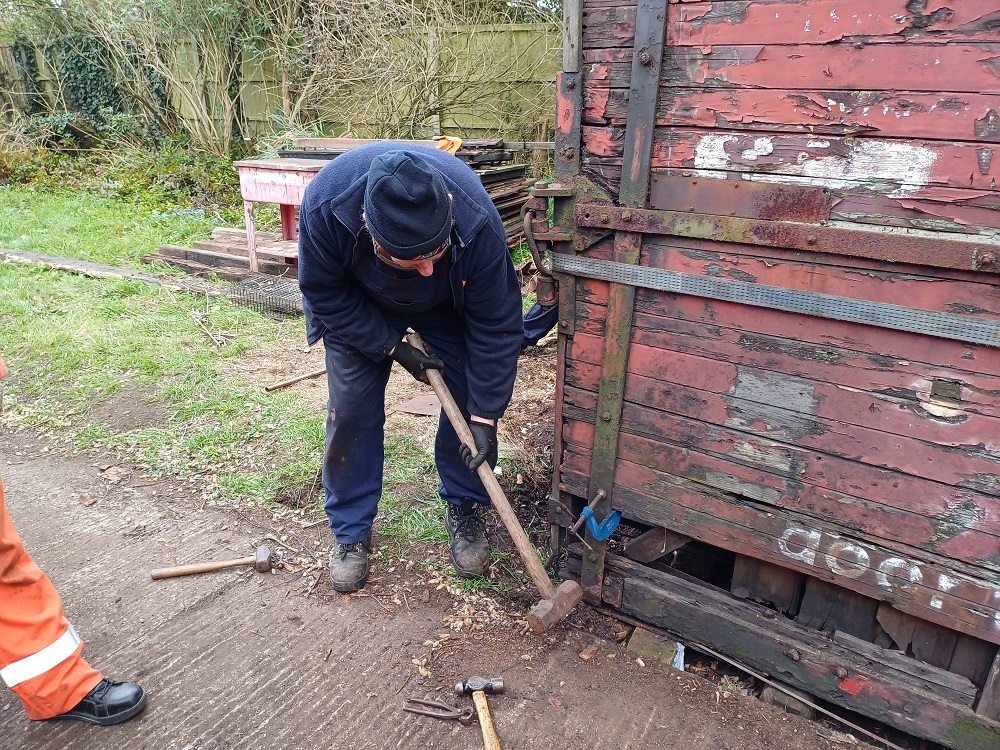 Nick, Ross, Oliver and Richard took a look at the A type container we had moved on Saturday. The hinges of the lower door section were freed off, and the outer edge of the floor secured to a new baton. Some adjustment was necessary with Nick’s favourite hammer and the grinder needed to remove the old corner rotted plate.