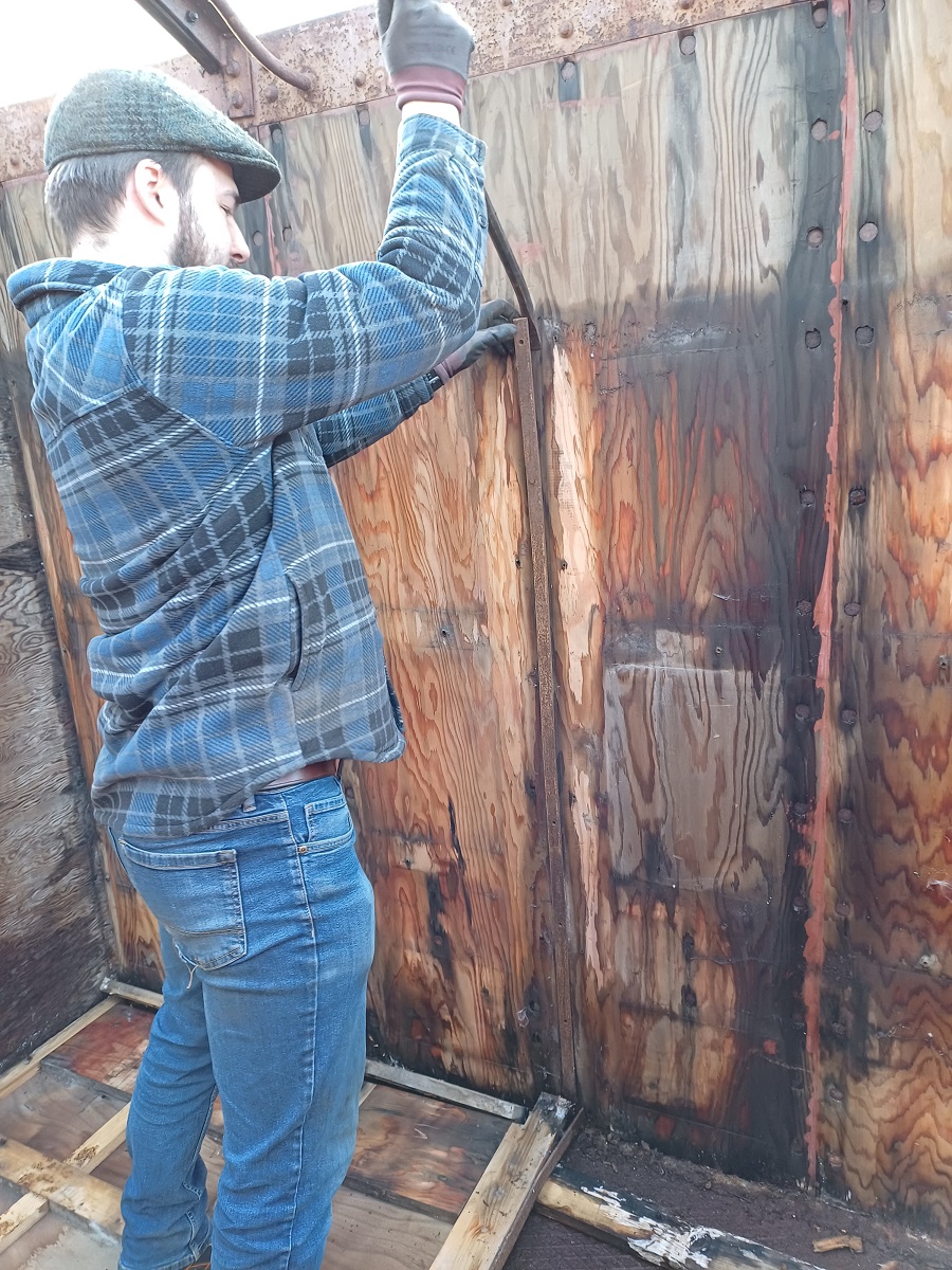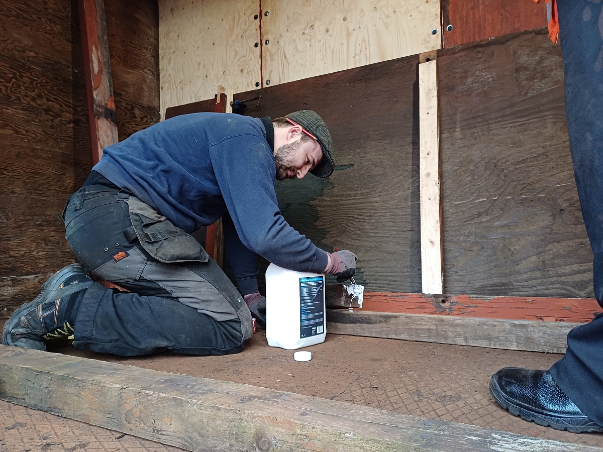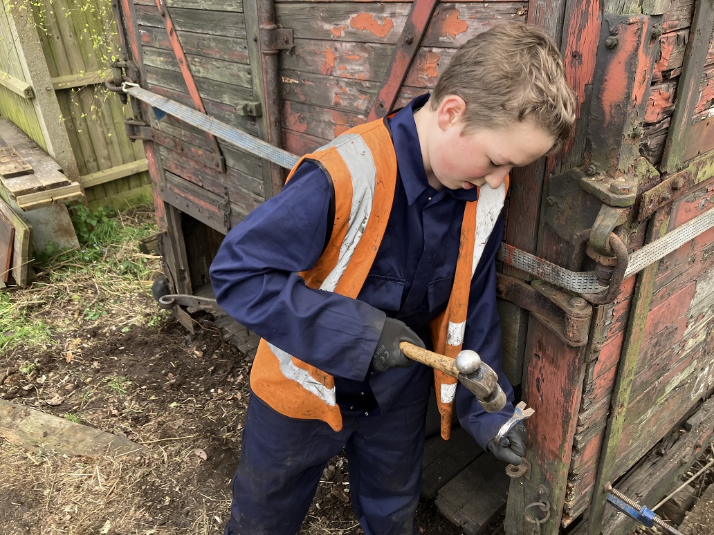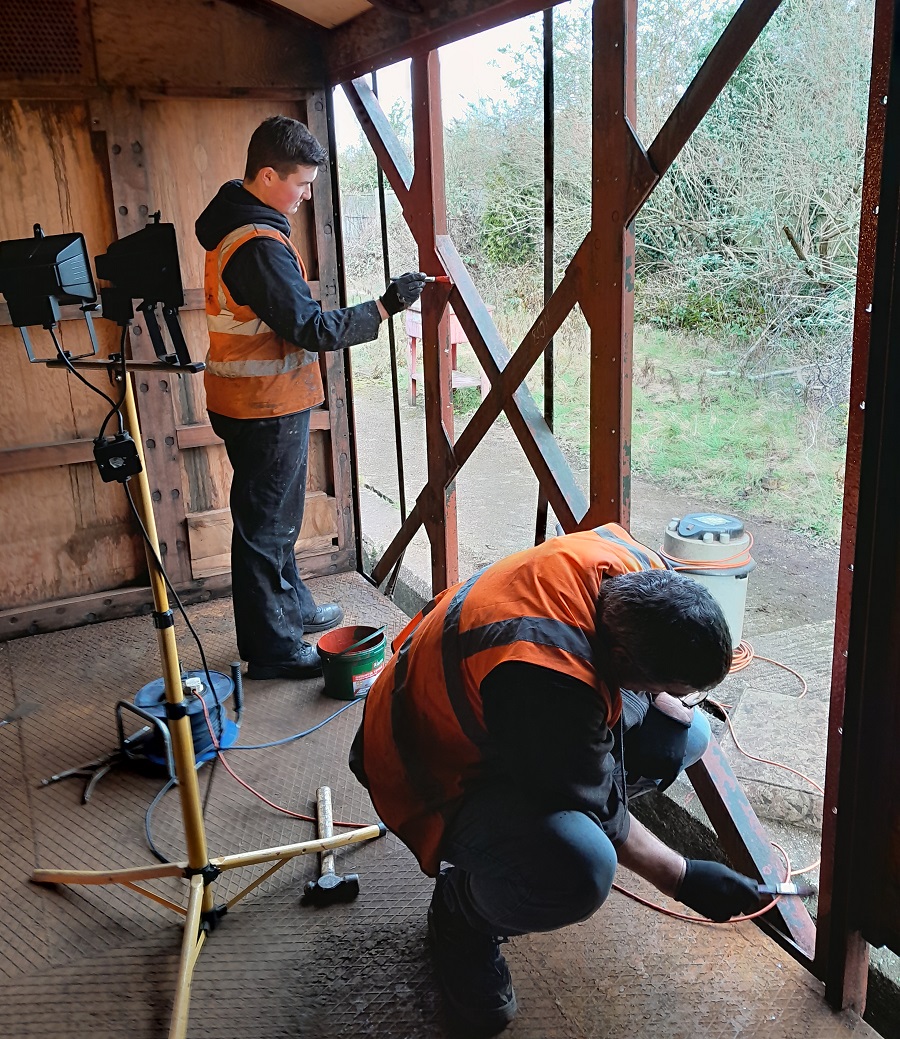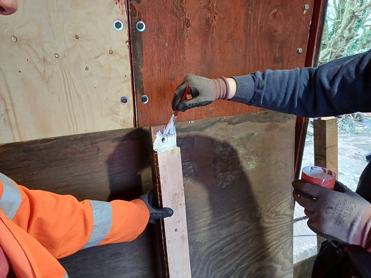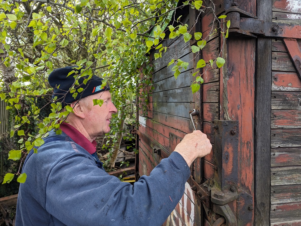Nick, Ross, Oliver and Richard took a look at the A type container we had moved on Saturday. The hinges of the lower door section were freed off, and the outer edge of the floor secured to a new baton. Some adjustment was necessary with Nick’s favourite hammer and the grinder needed to remove the old corner rotted plate.