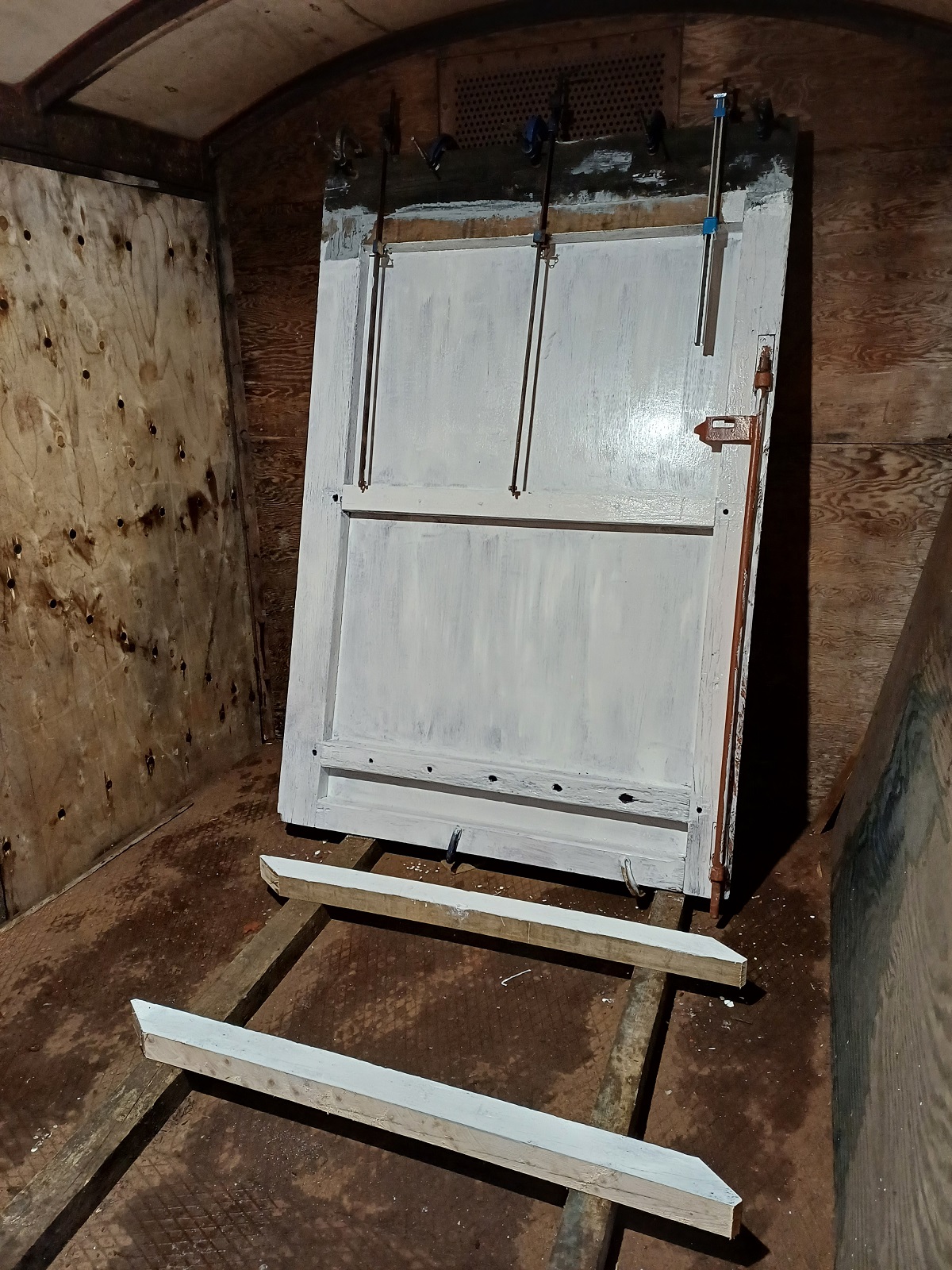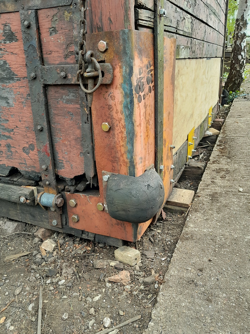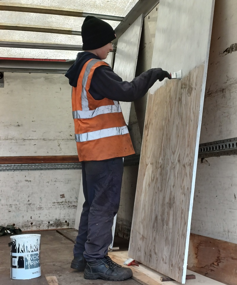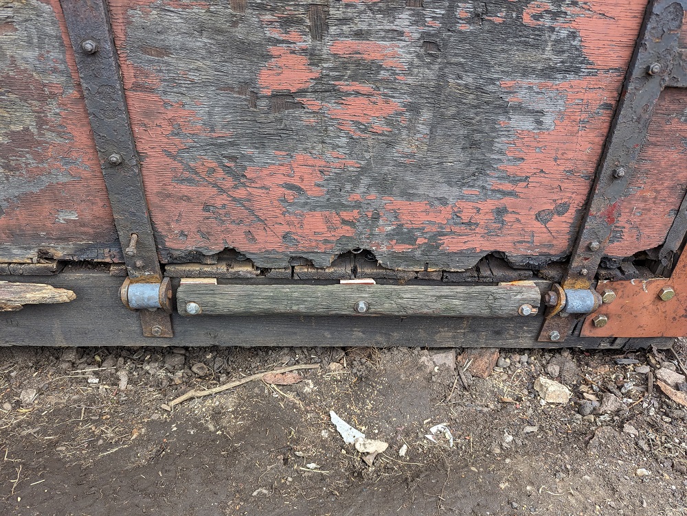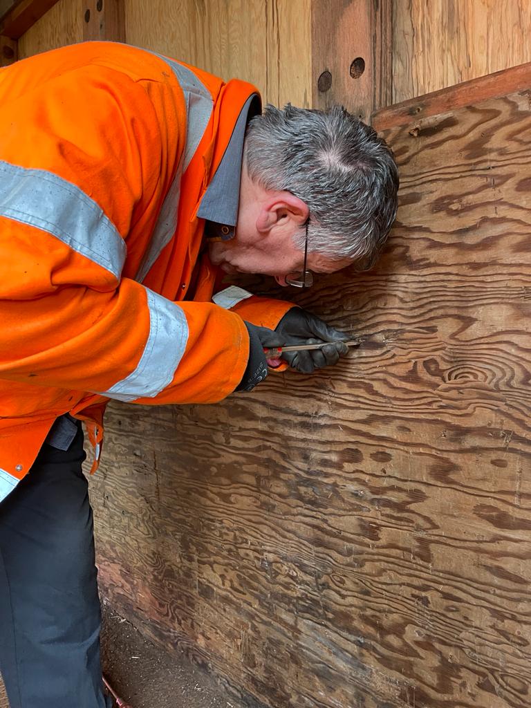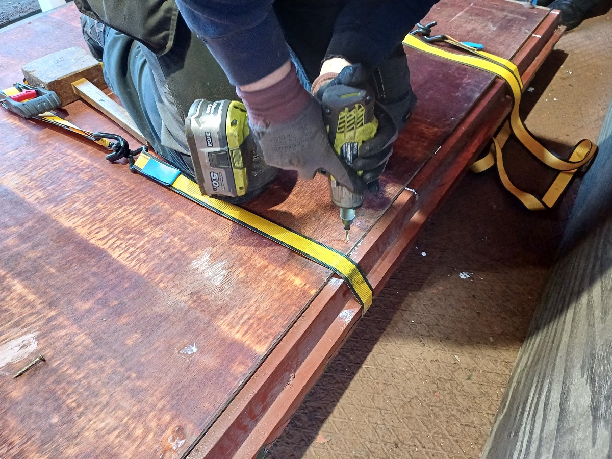 Nick, Ross, Oliver and Richard took a look at the A type container we had moved on Saturday. The hinges of the lower door section were freed off, and the outer edge of the floor secured to a new baton. Some adjustment was necessary with Nick’s favourite hammer and the grinder needed to remove the old corner rotted plate.