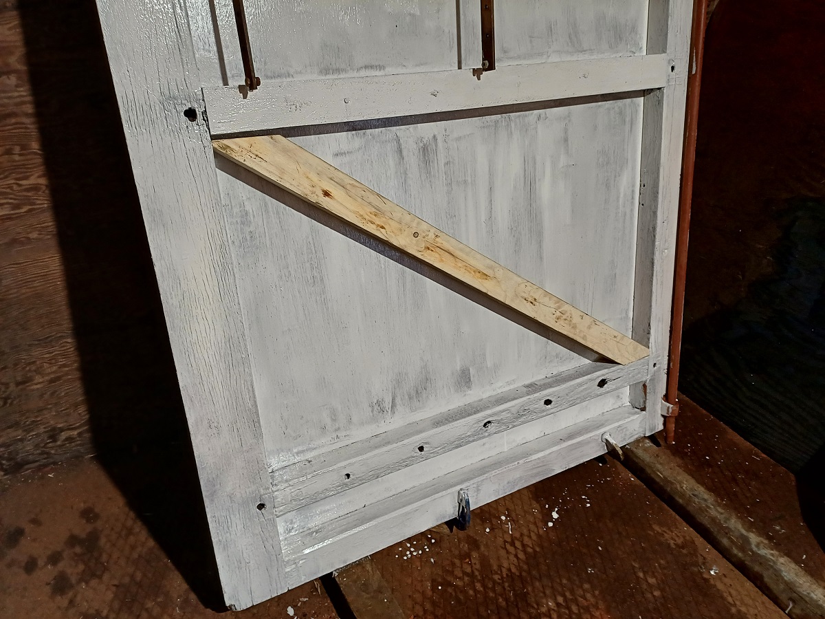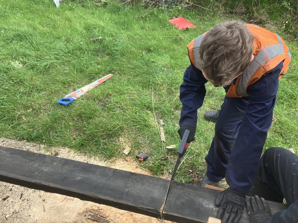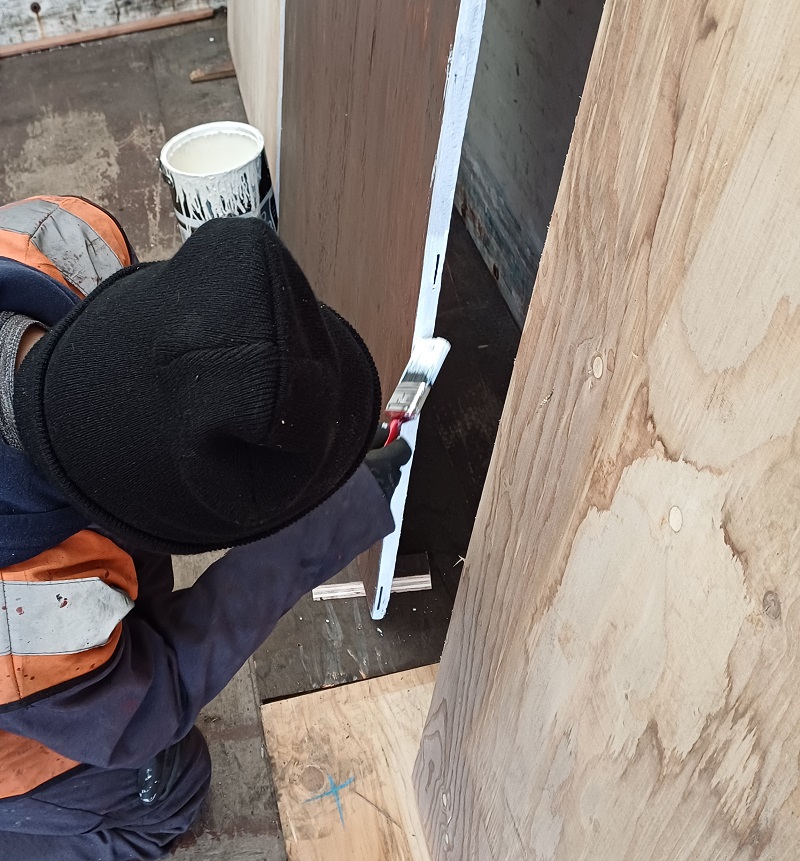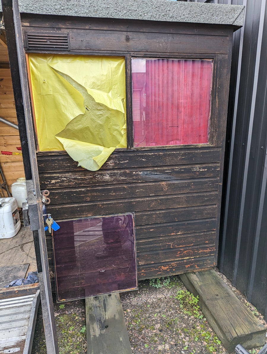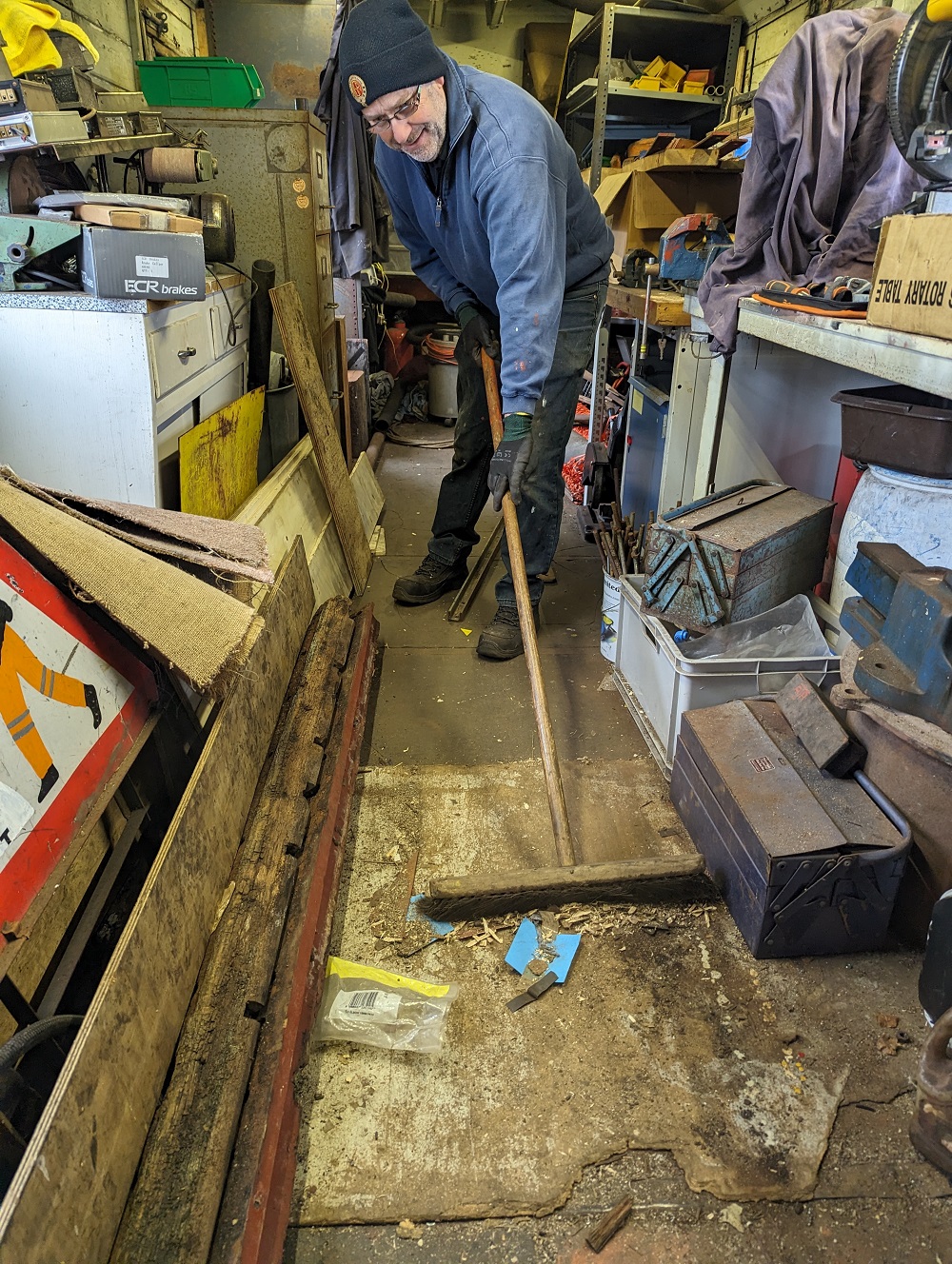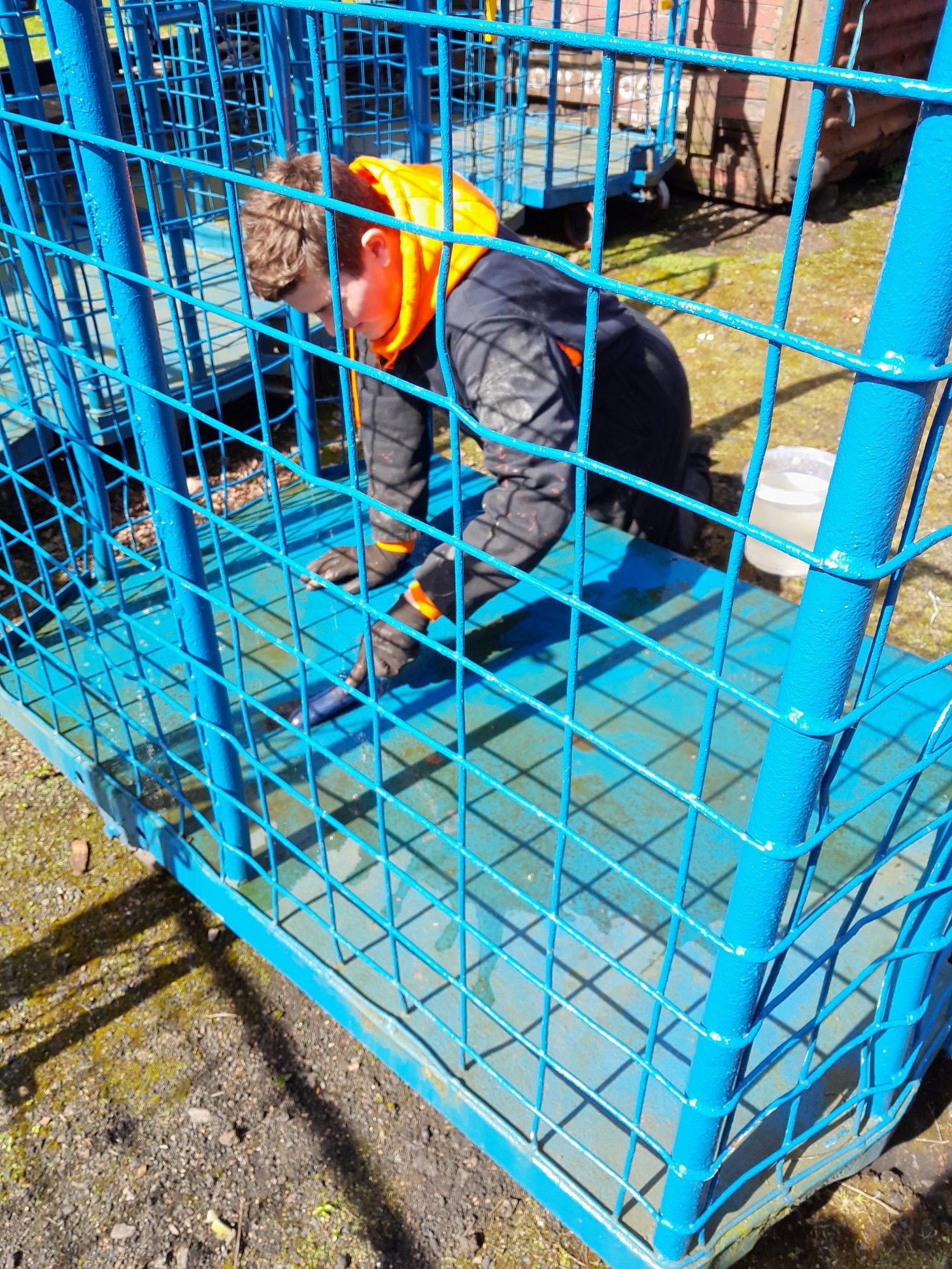 Nick, Ross, Oliver and Richard took a look at the A type container we had moved on Saturday. The hinges of the lower door section were freed off, and the outer edge of the floor secured to a new baton. Some adjustment was necessary with Nick’s favourite hammer and the grinder needed to remove the old corner rotted plate.
