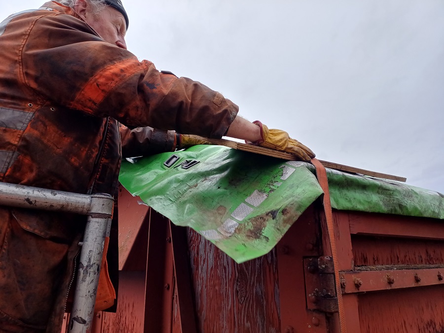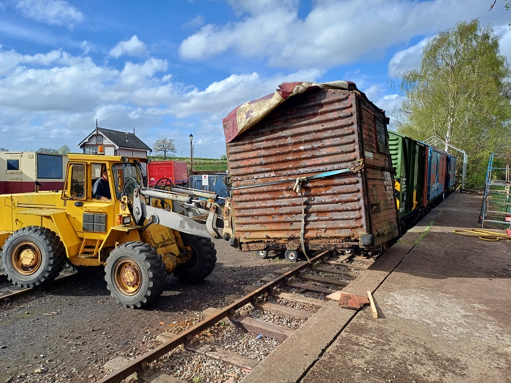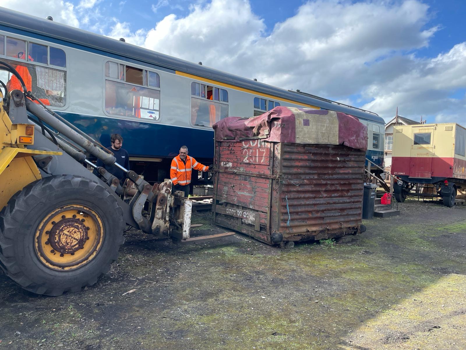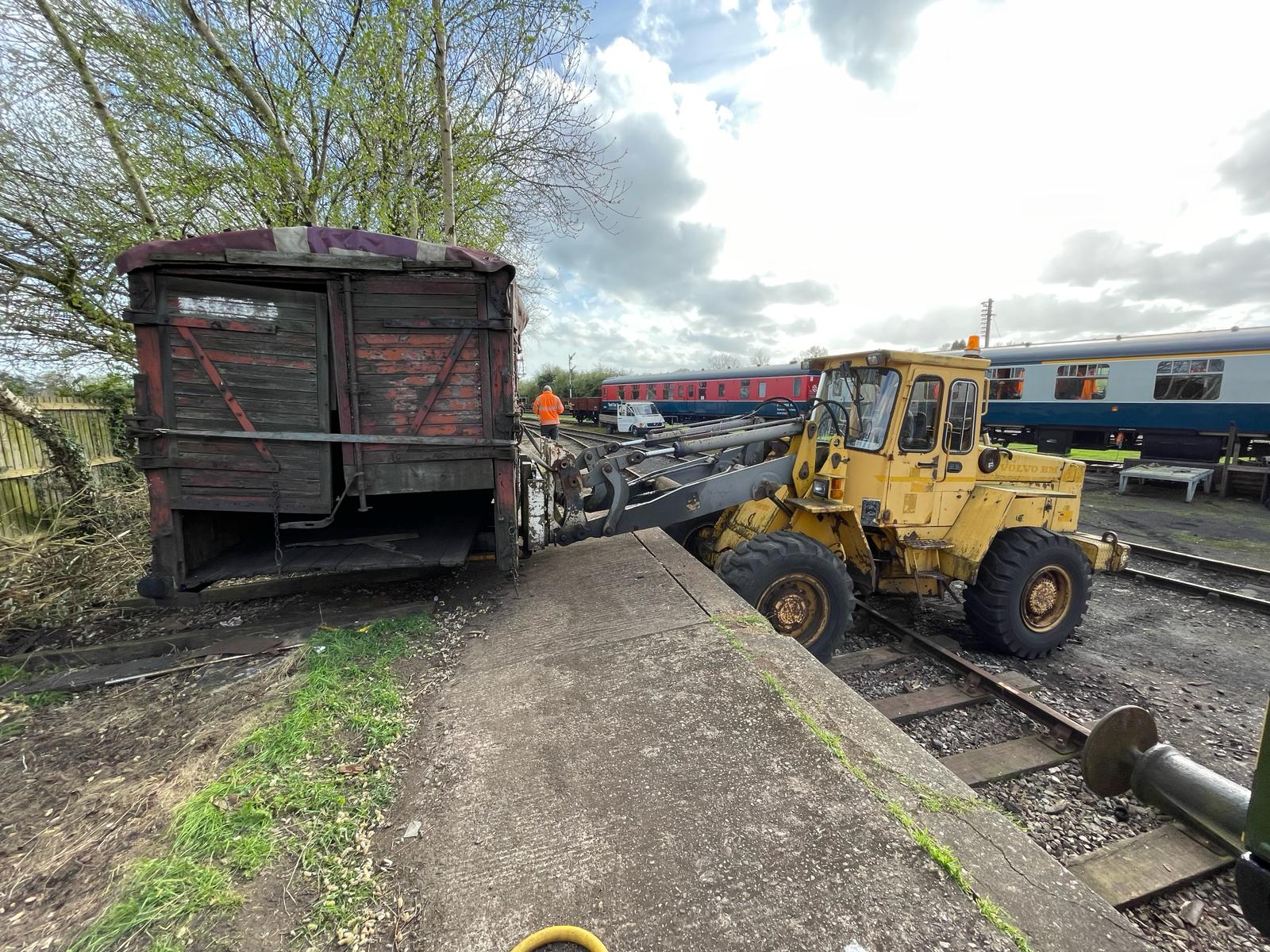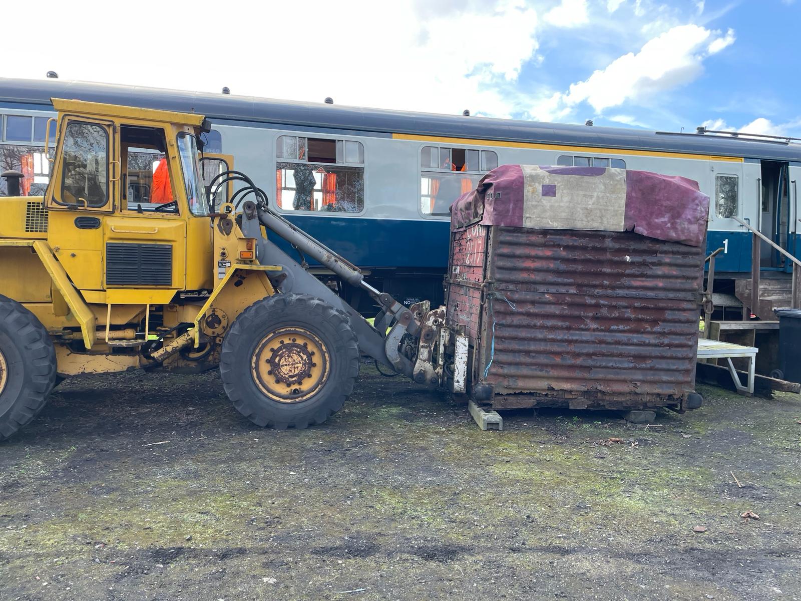 To round off Saturday the dilapidated A type container that was rescued from the Loco shed last in June year was carefully moved from beside the mess coach to it’s new home on the dock. The area on the dock was cleared and some strategically placed timbers were laid out for the container to sit on. A ratchet strap was used to hold the container together and secure it to the Volvo for movement.