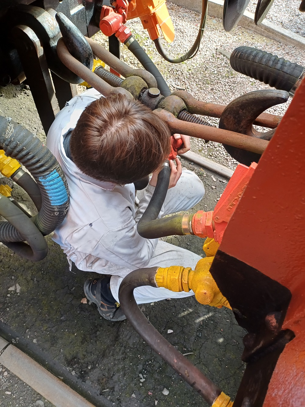 Sunday began with the decision to move Edward the Hydrovane compressor trailer from the back of the pick-up truck onto the BEV stillage; this will make it more movable and accessible, and also free-up the pick-up for other duties. Kiki was woken up to provide a lift for the stillage, however she needed a hydraulic oil top-up to get the lift to work.