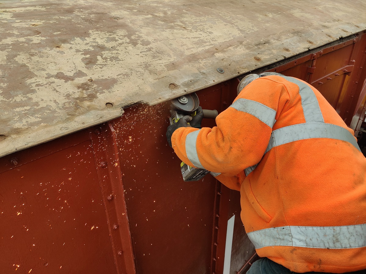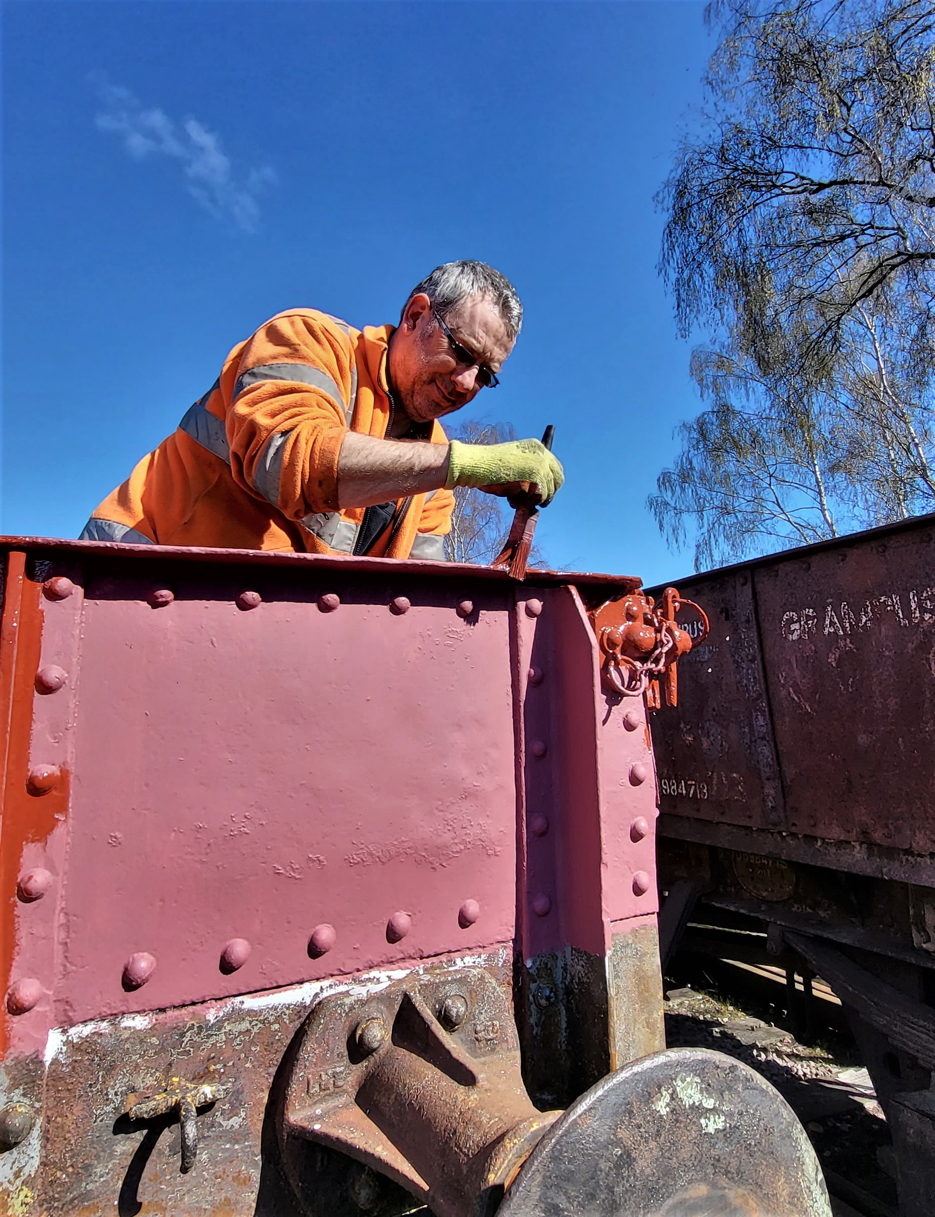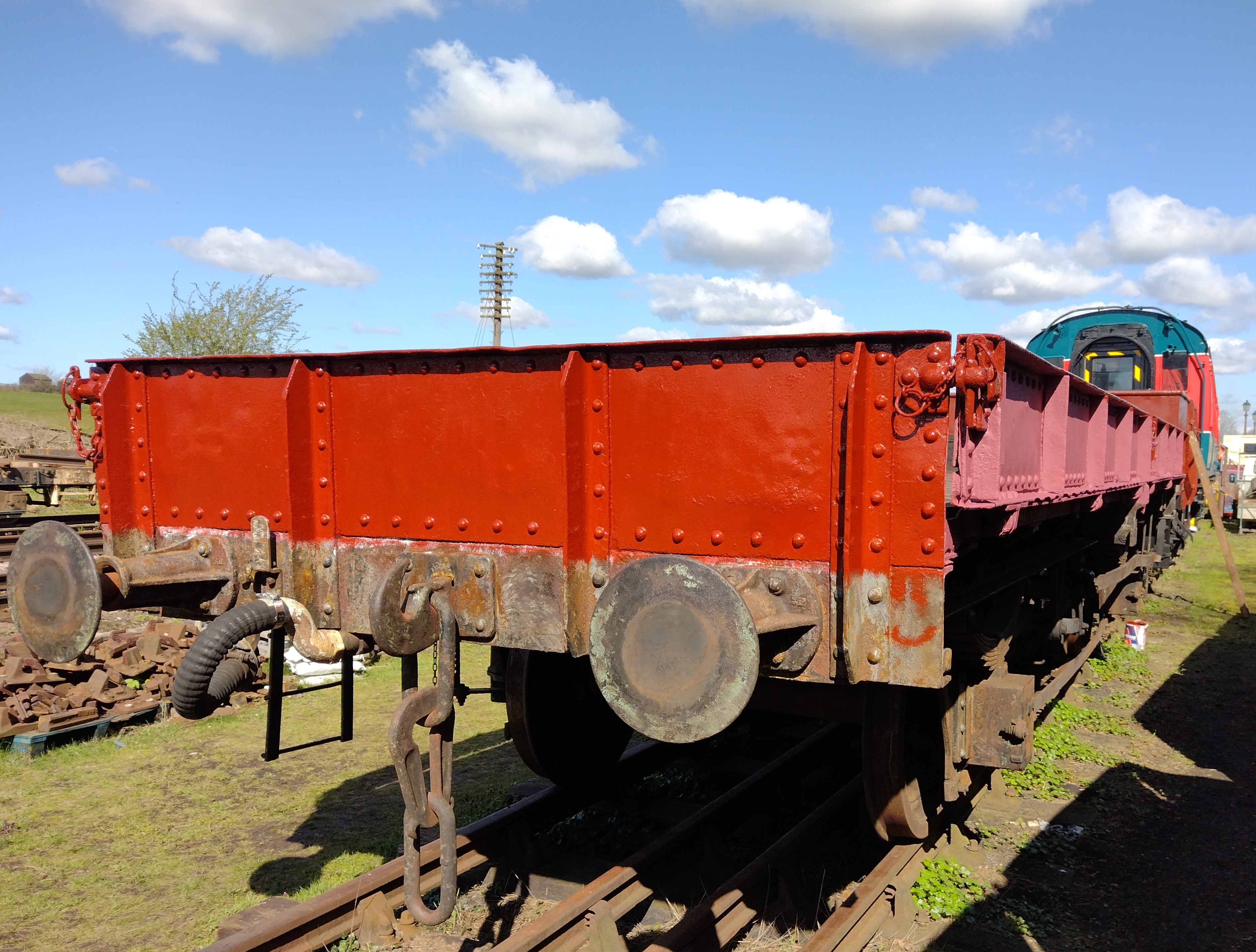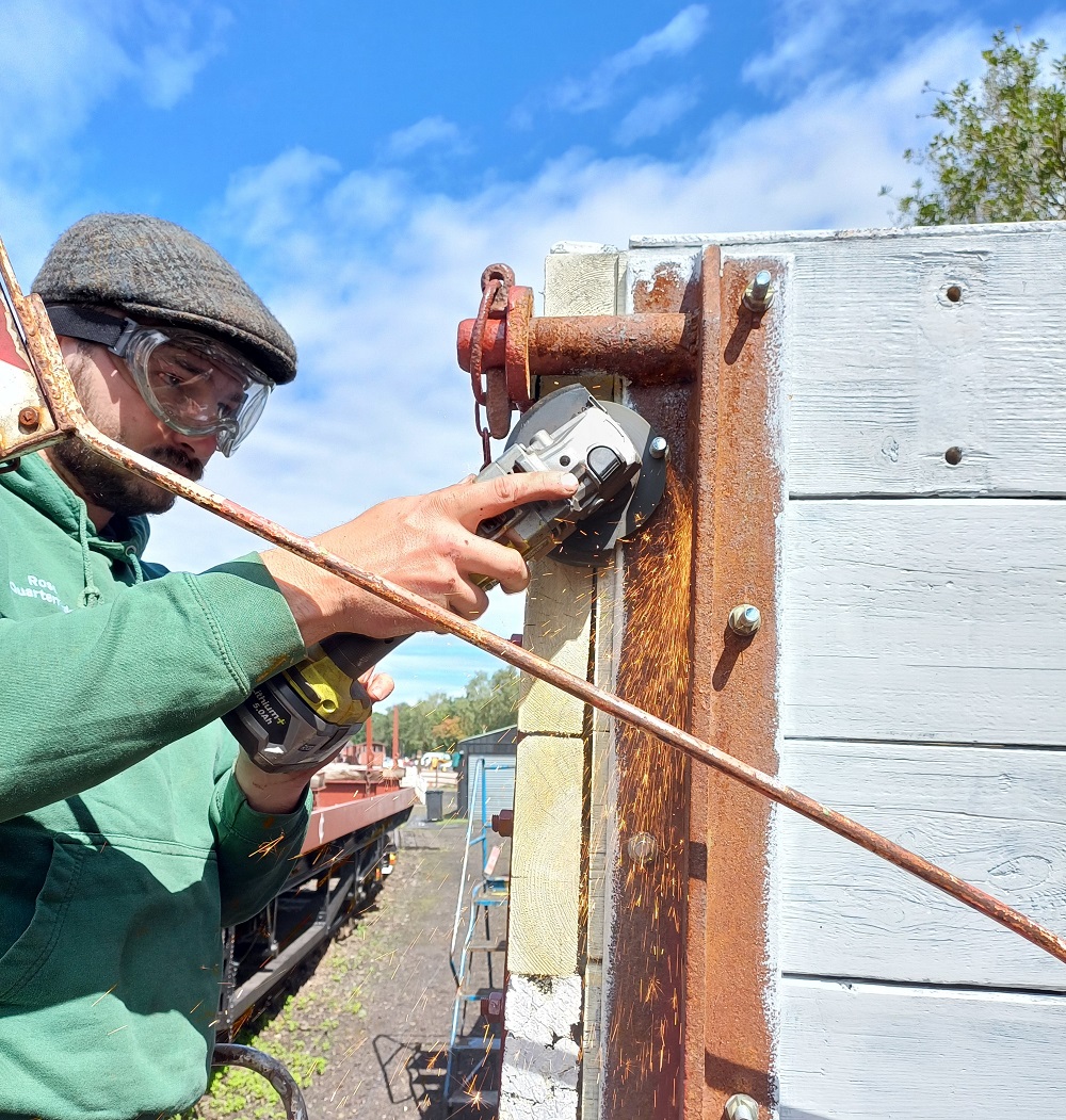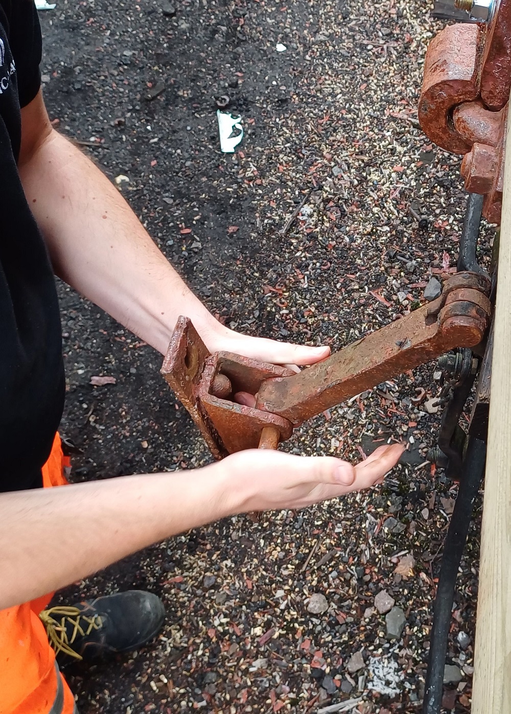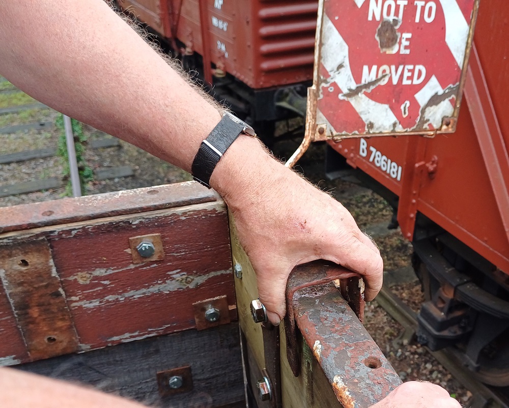 Whilst checking the wagons in preparation for railways at work, we came across a very reluctant drop-side door on steel high ADB280364. The cause was a lipped top latch post which was dressed lightly with a grinder and some red-oxide paint applied. This will make the door much easier to open and shut during the loading/unloading demonstrations.