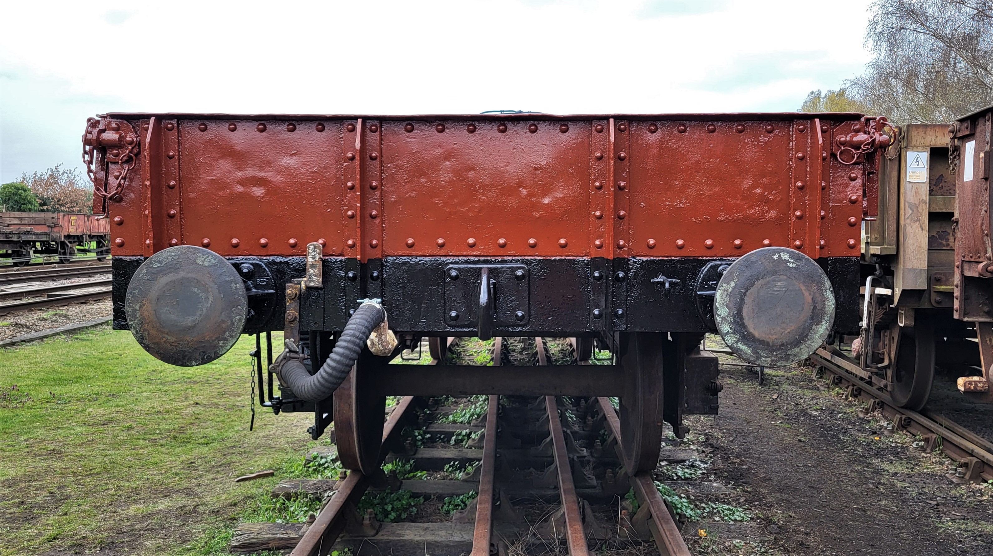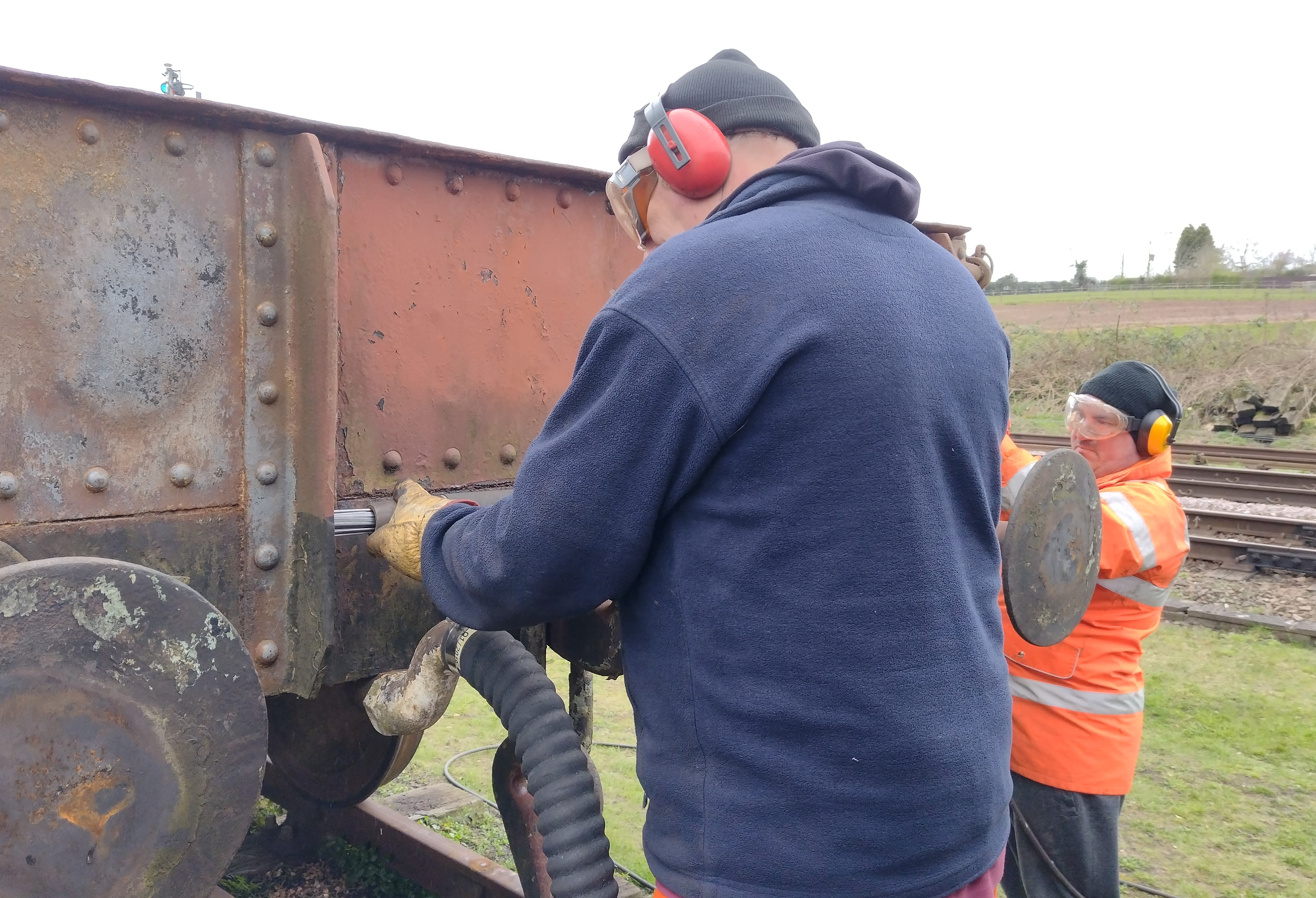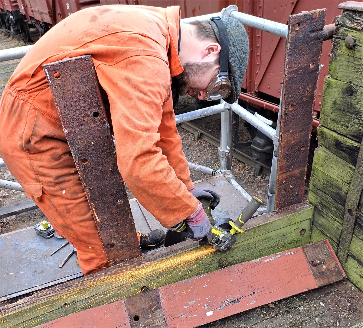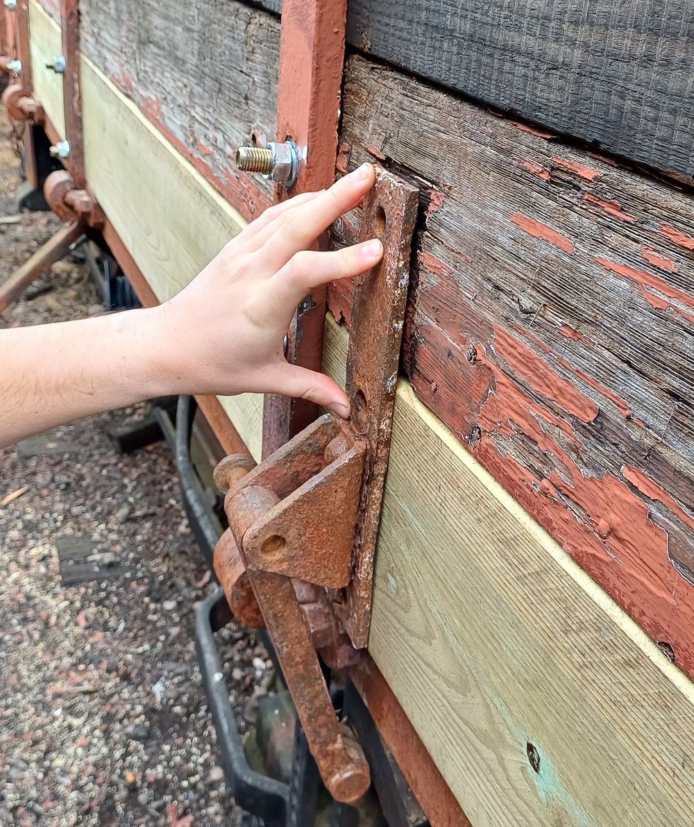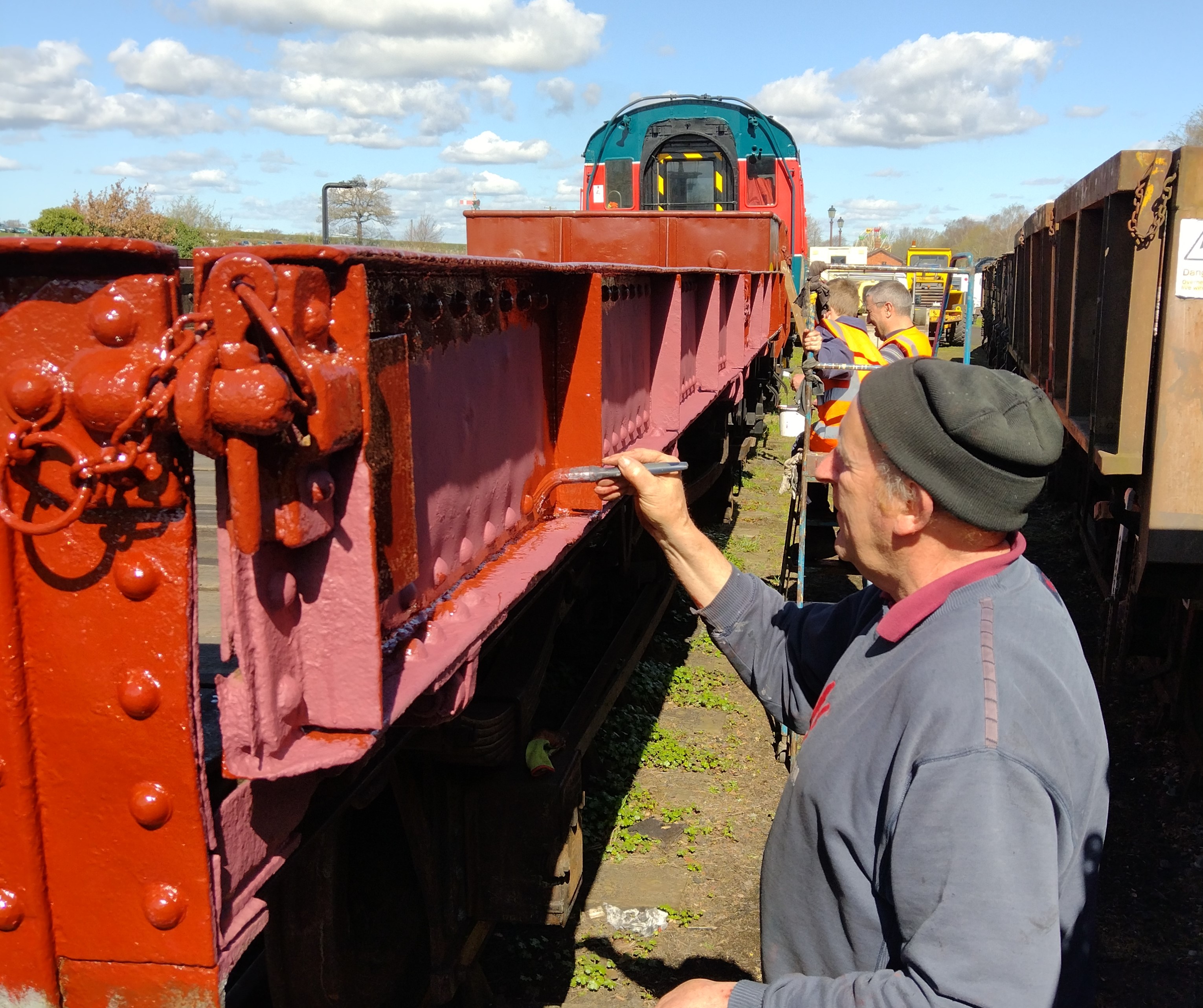 Whilst checking the wagons in preparation for railways at work, we came across a very reluctant drop-side door on steel high ADB280364. The cause was a lipped top latch post which was dressed lightly with a grinder and some red-oxide paint applied. This will make the door much easier to open and shut during the loading/unloading demonstrations.
