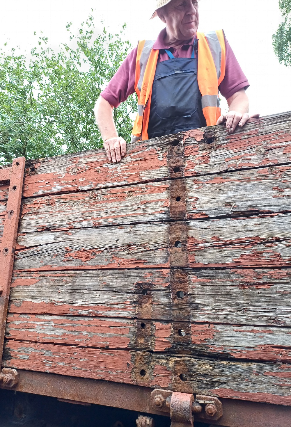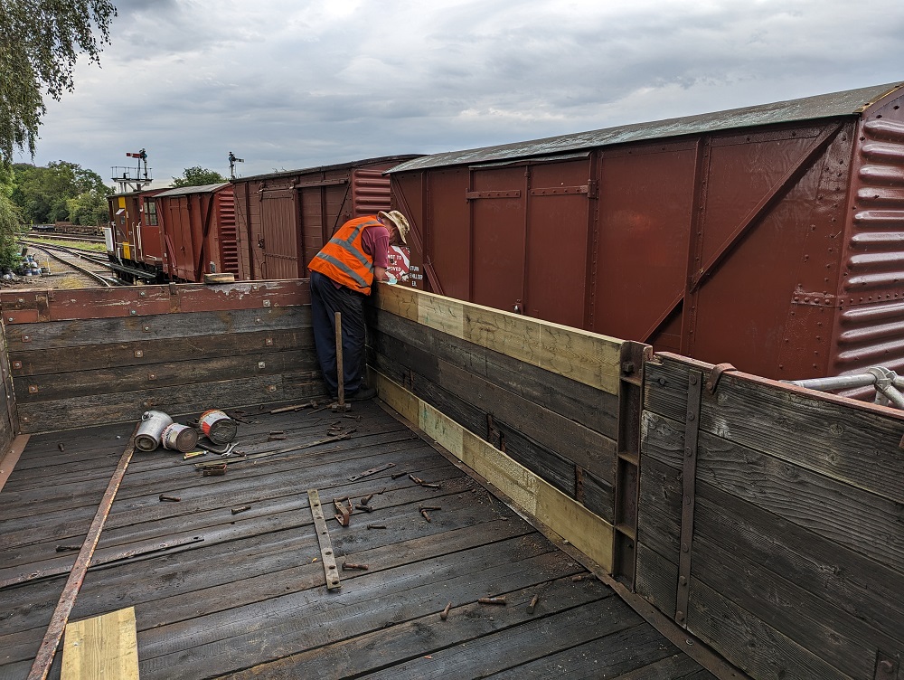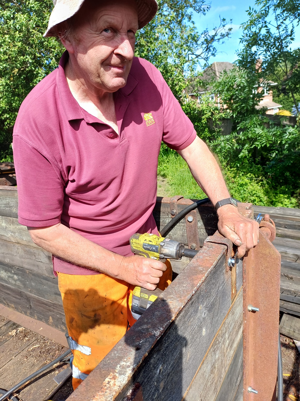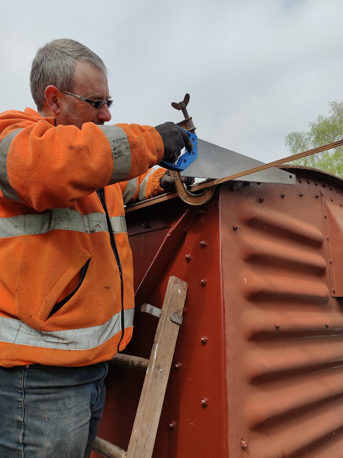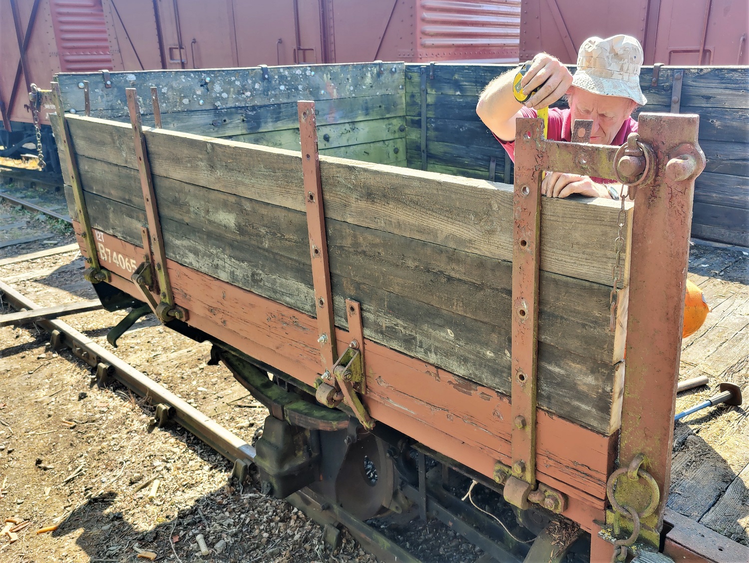 Sunday and the weather improved allowing us to work on the Pipe wagon B740654; after a couple of weeks for the planks to settle we tightened all the door bolts on the west side & south end, and trimmed a couple of slightly long ones.