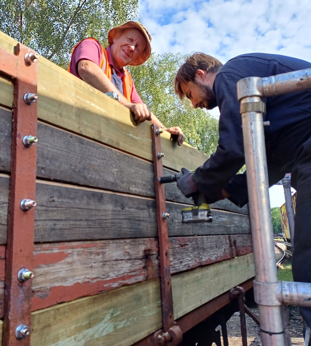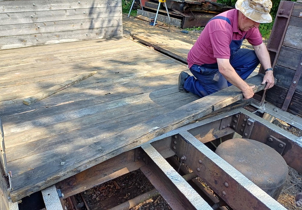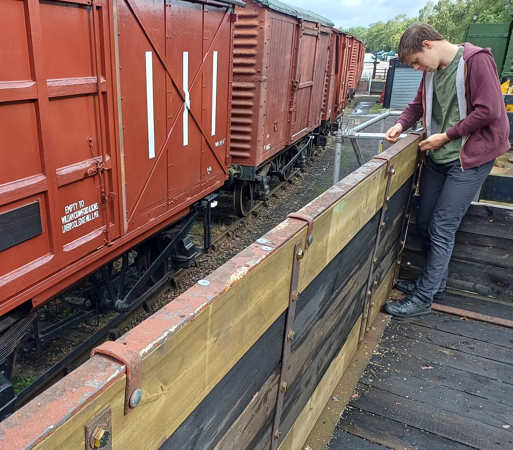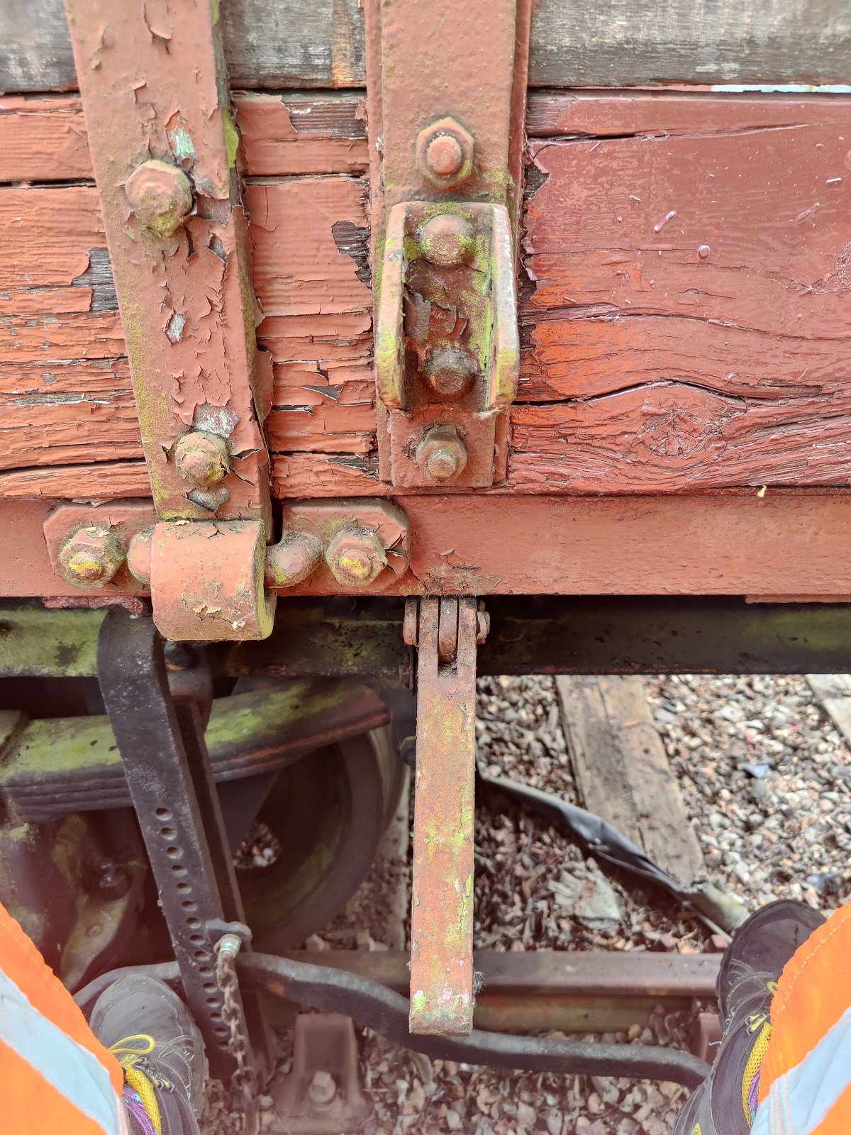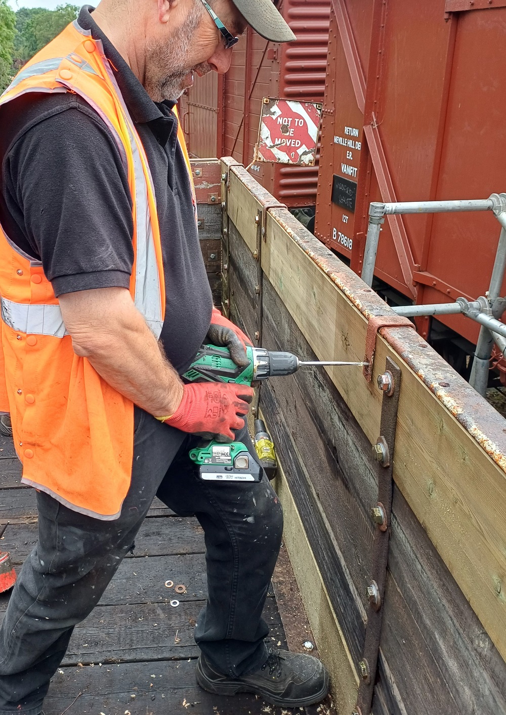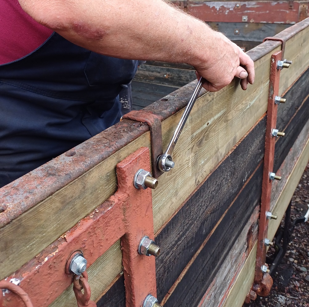 Sunday and the weather improved allowing us to work on the Pipe wagon B740654; after a couple of weeks for the planks to settle we tightened all the door bolts on the west side & south end, and trimmed a couple of slightly long ones.