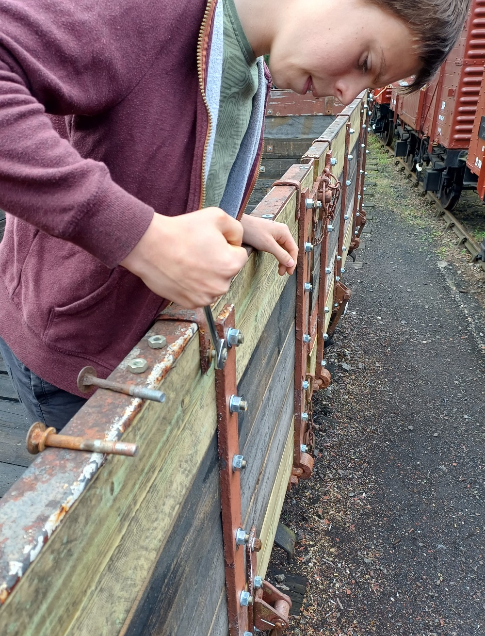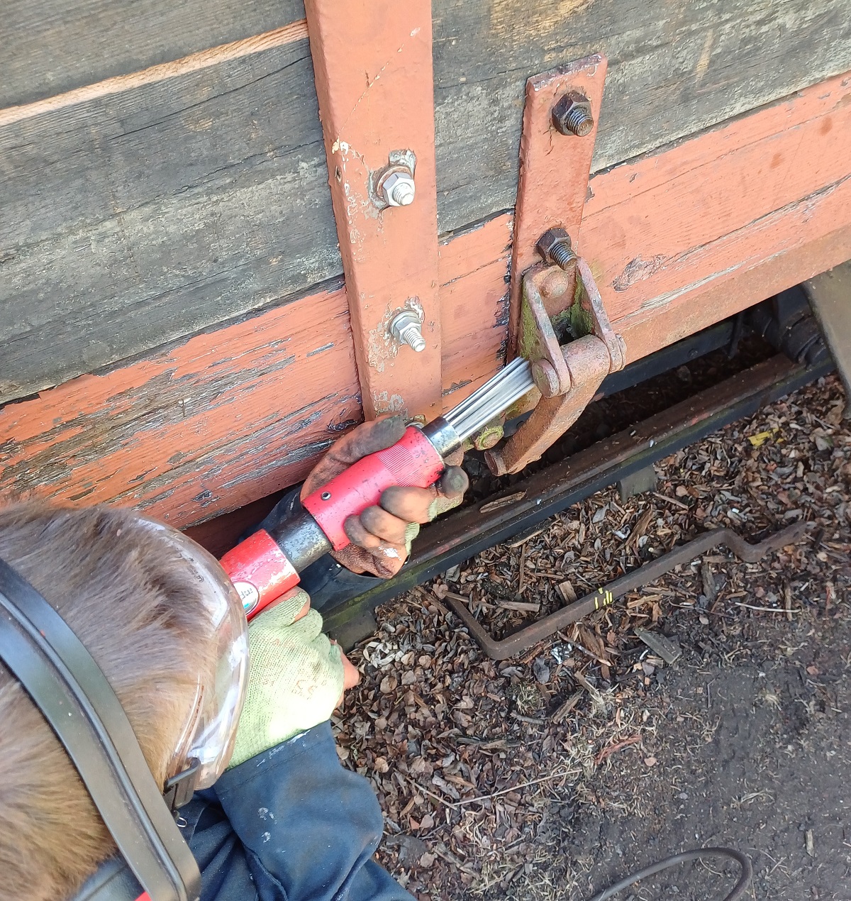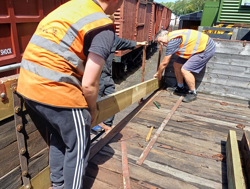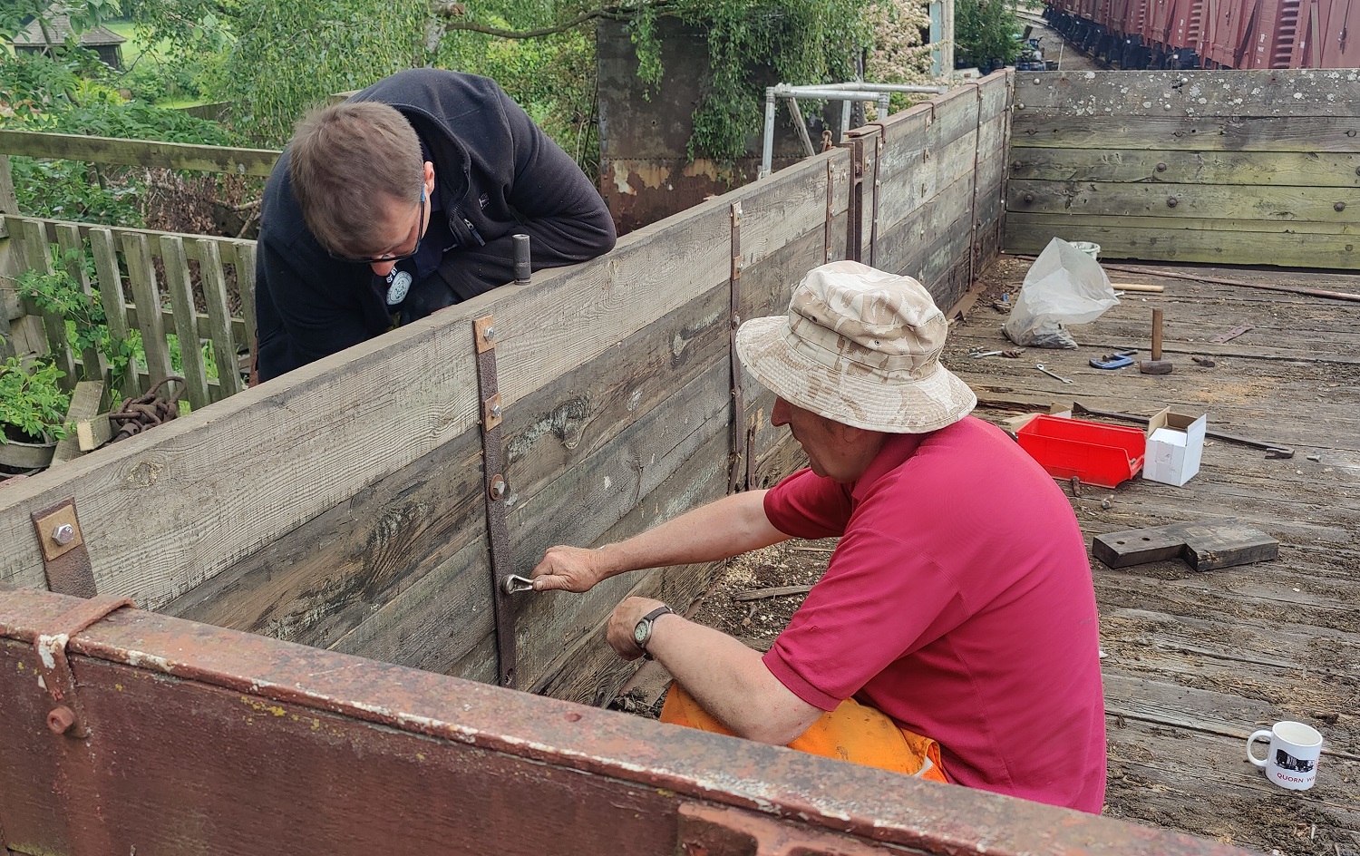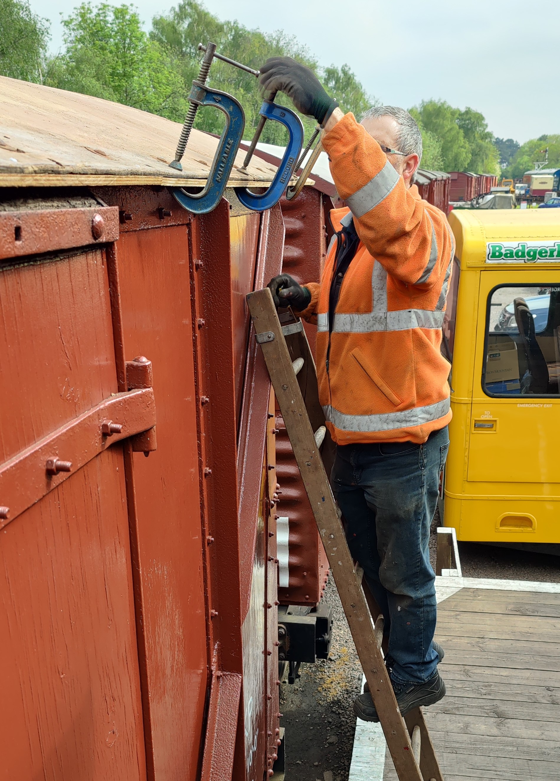 Sunday and the weather improved allowing us to work on the Pipe wagon B740654; after a couple of weeks for the planks to settle we tightened all the door bolts on the west side & south end, and trimmed a couple of slightly long ones.