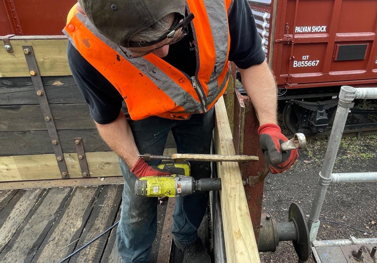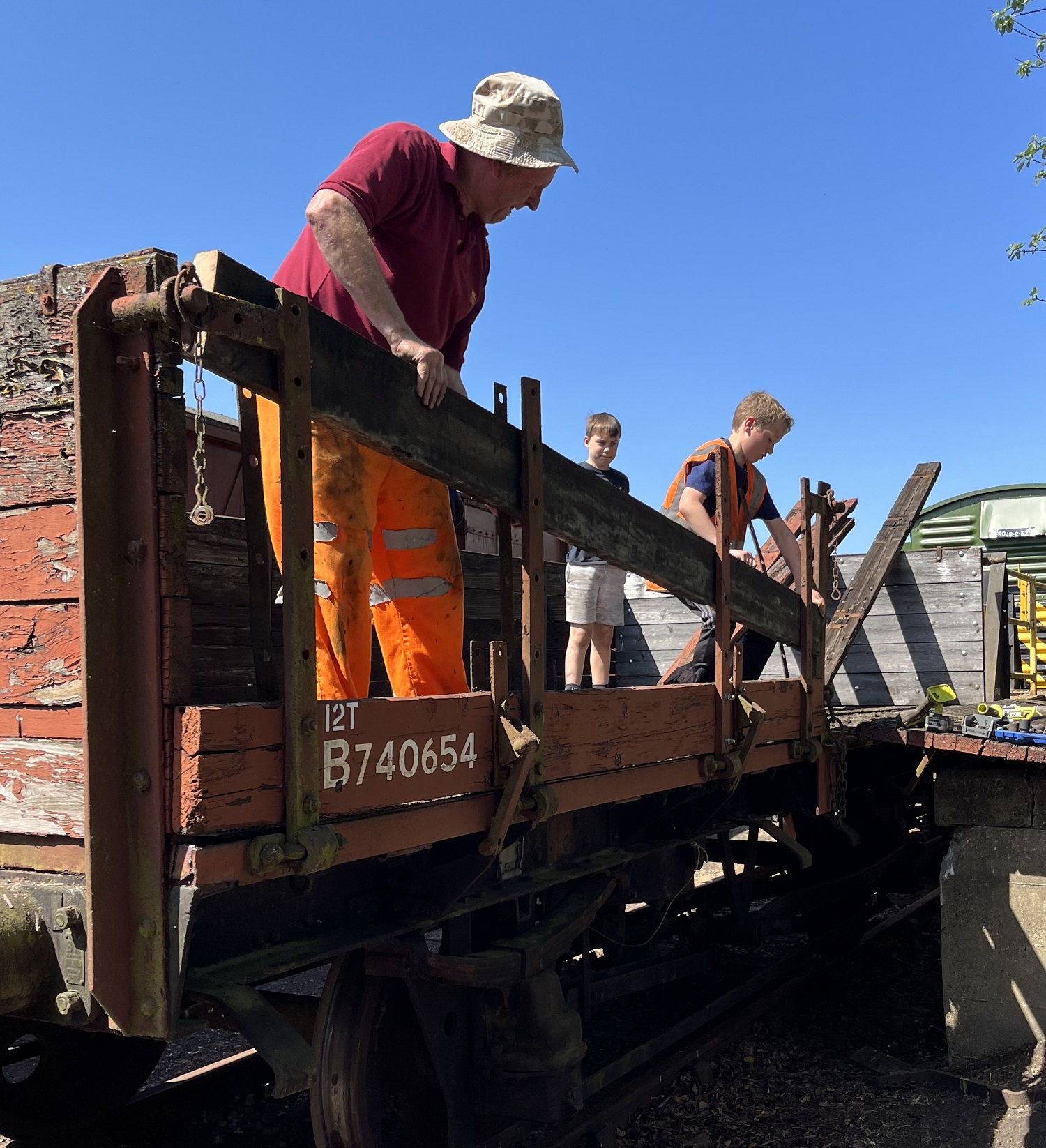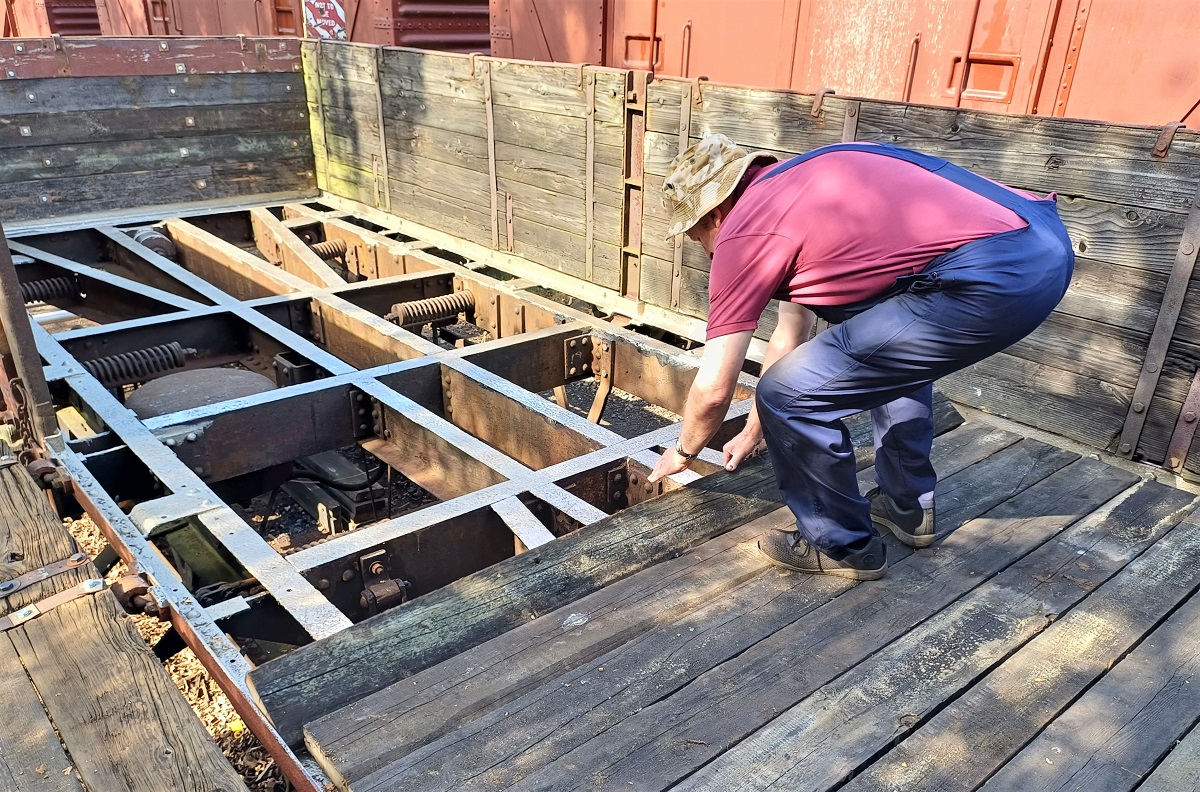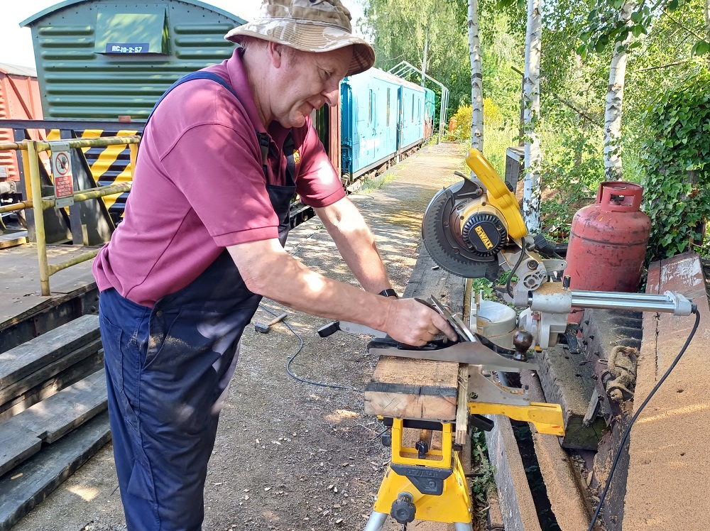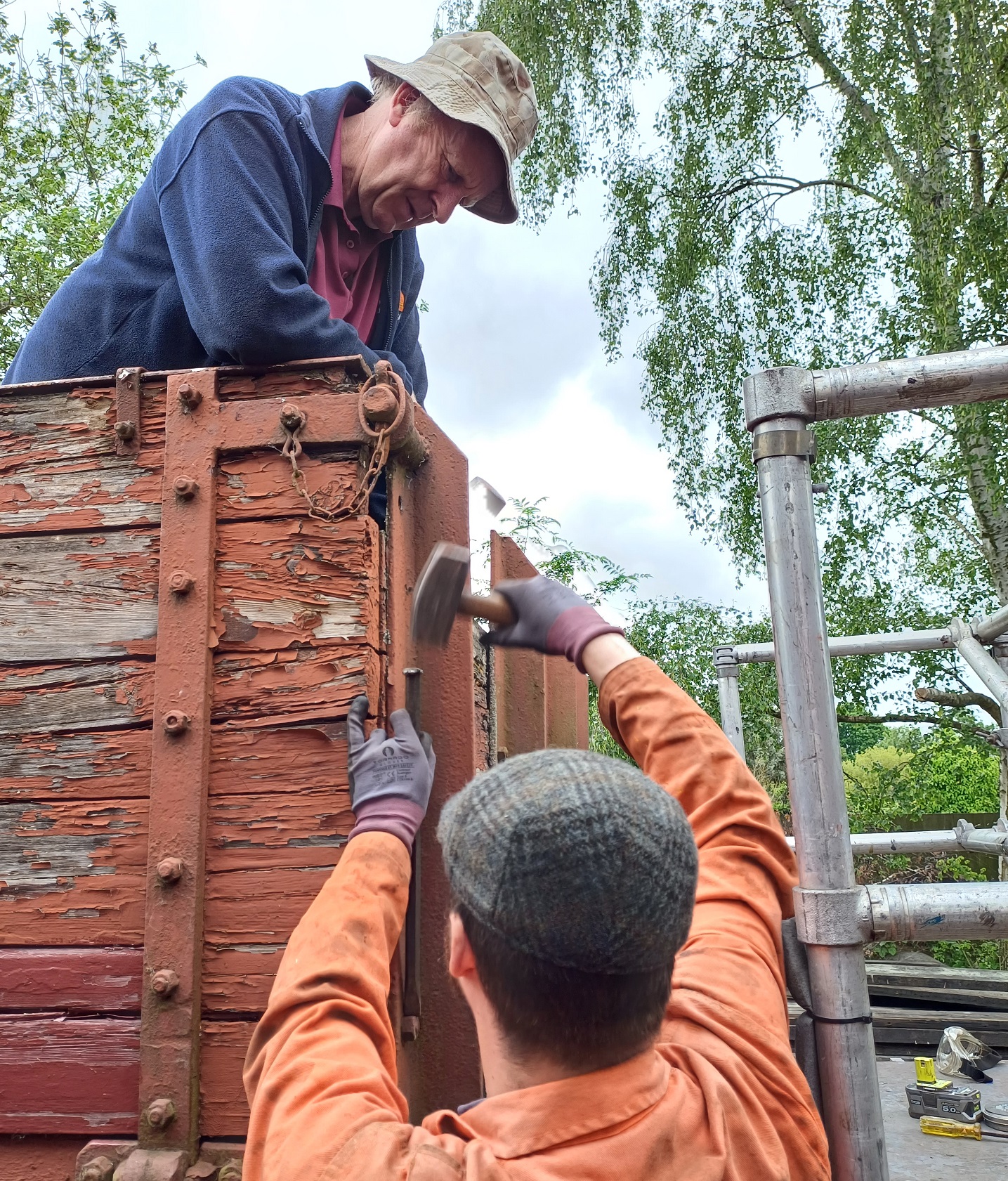 Sunday and the weather improved allowing us to work on the Pipe wagon B740654; after a couple of weeks for the planks to settle we tightened all the door bolts on the west side & south end, and trimmed a couple of slightly long ones.