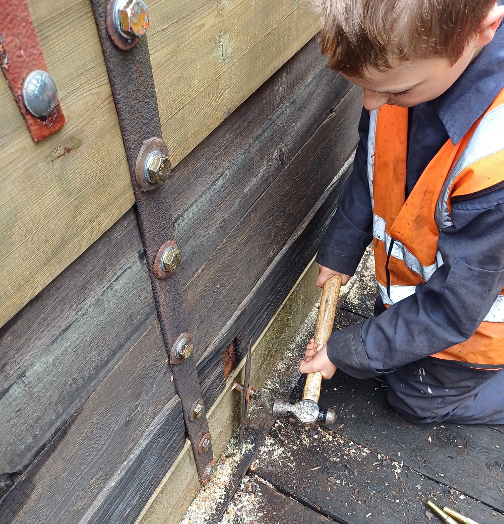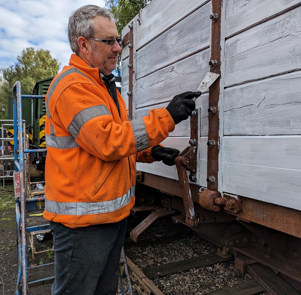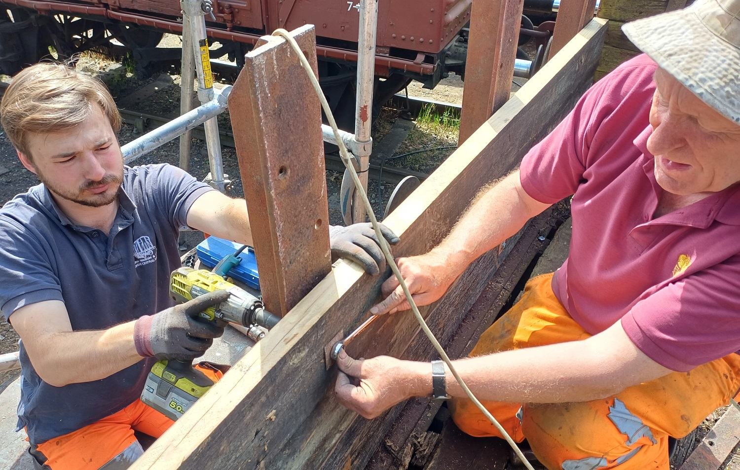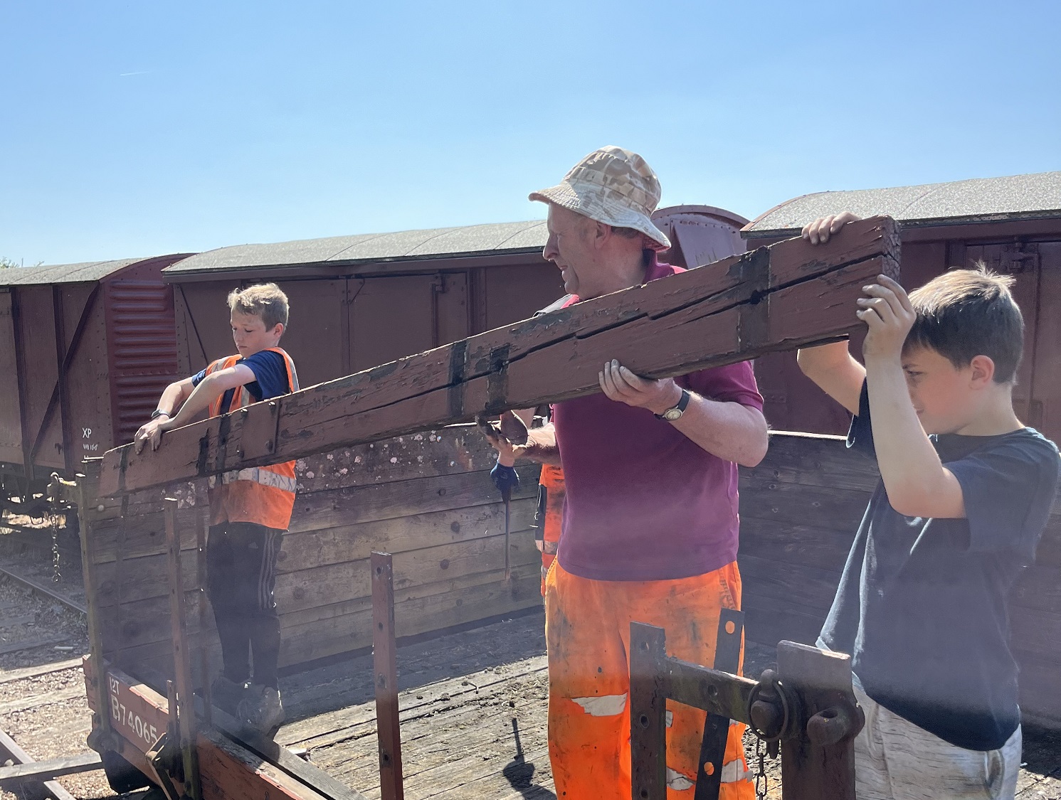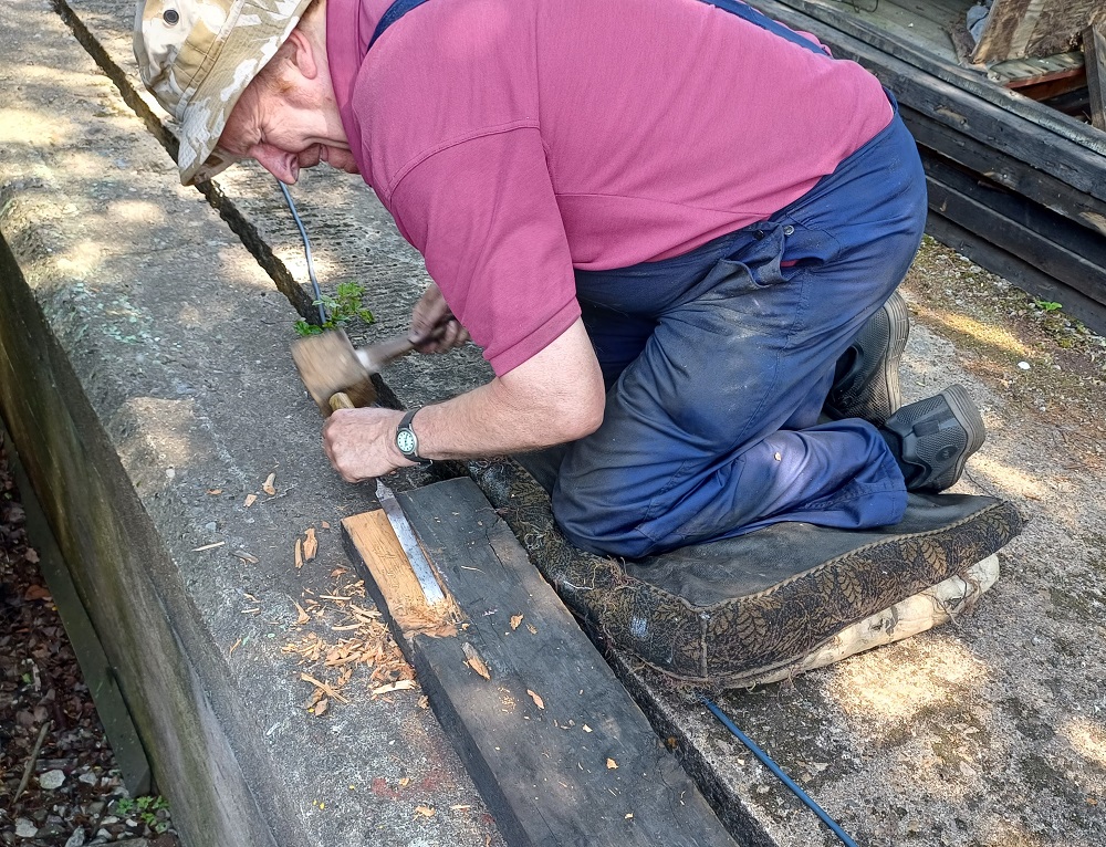 Sunday and the weather improved allowing us to work on the Pipe wagon B740654; after a couple of weeks for the planks to settle we tightened all the door bolts on the west side & south end, and trimmed a couple of slightly long ones.