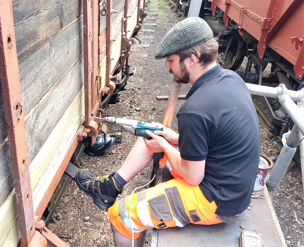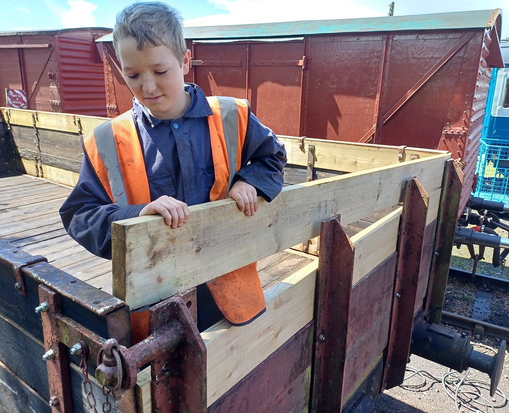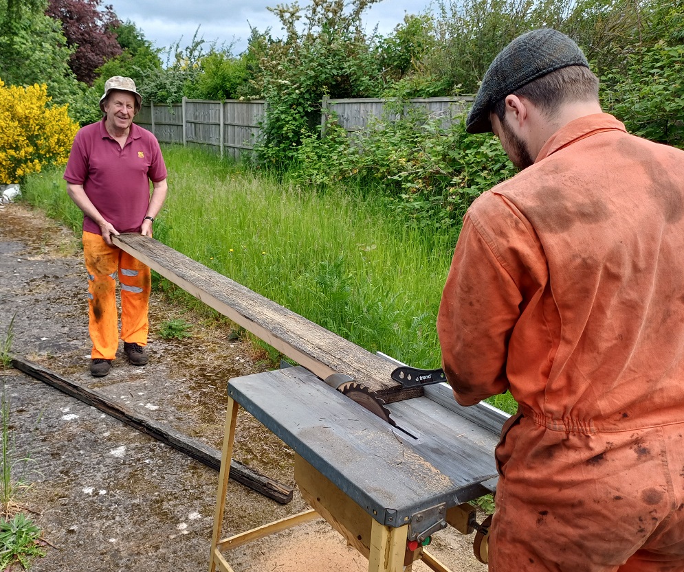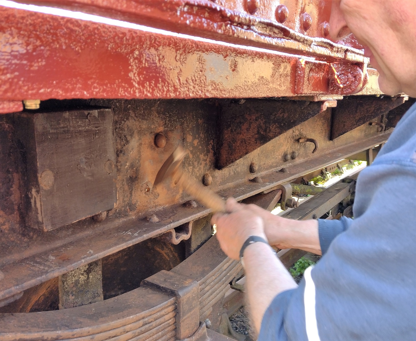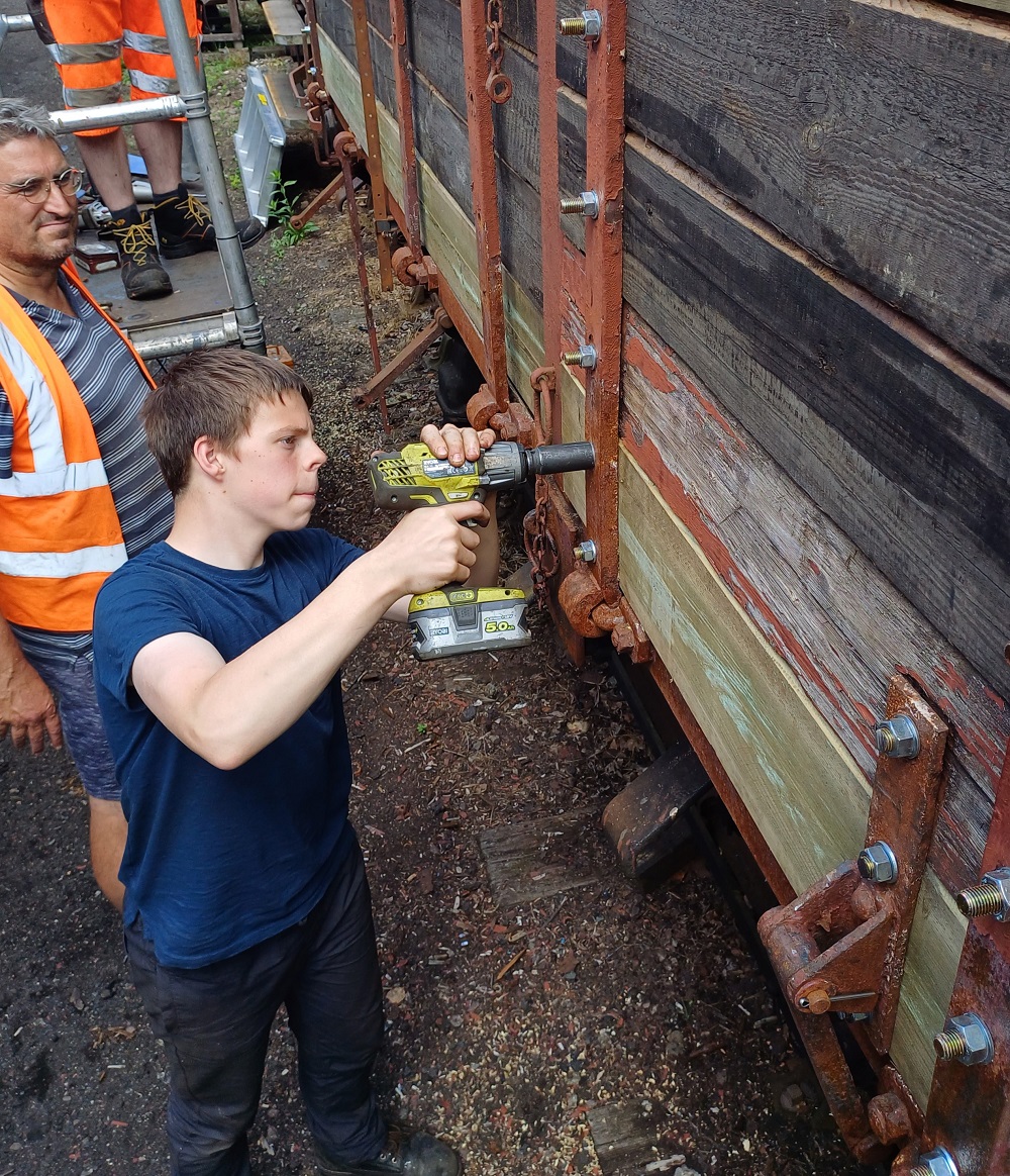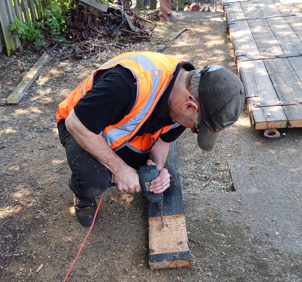 Sunday and the weather improved allowing us to work on the Pipe wagon B740654; after a couple of weeks for the planks to settle we tightened all the door bolts on the west side & south end, and trimmed a couple of slightly long ones.
