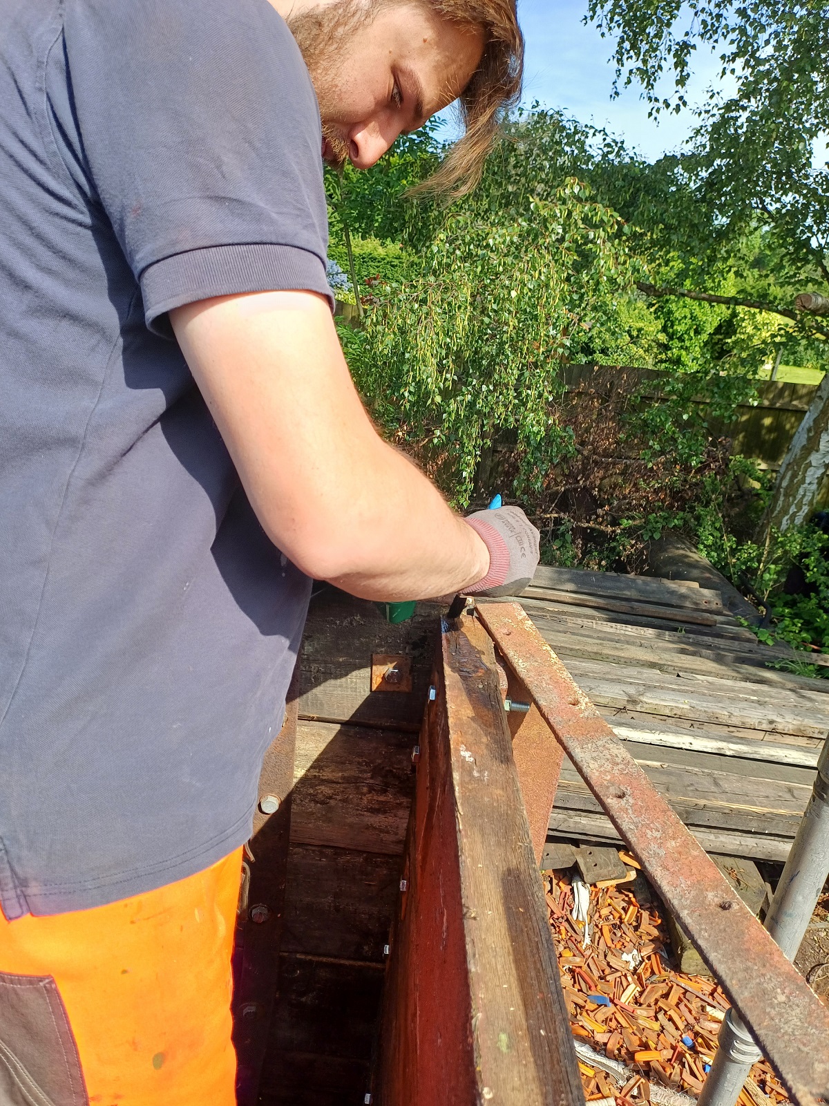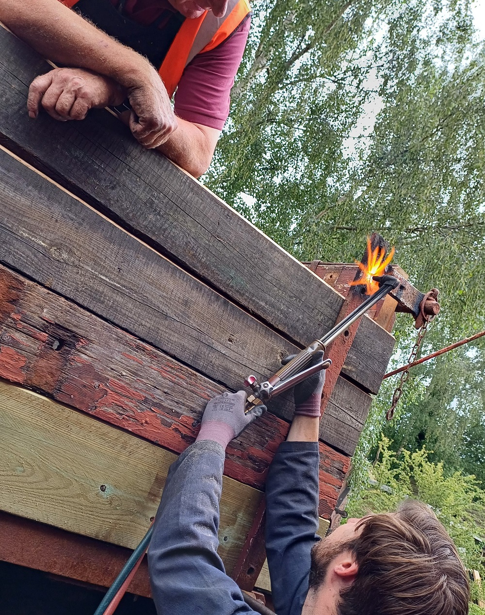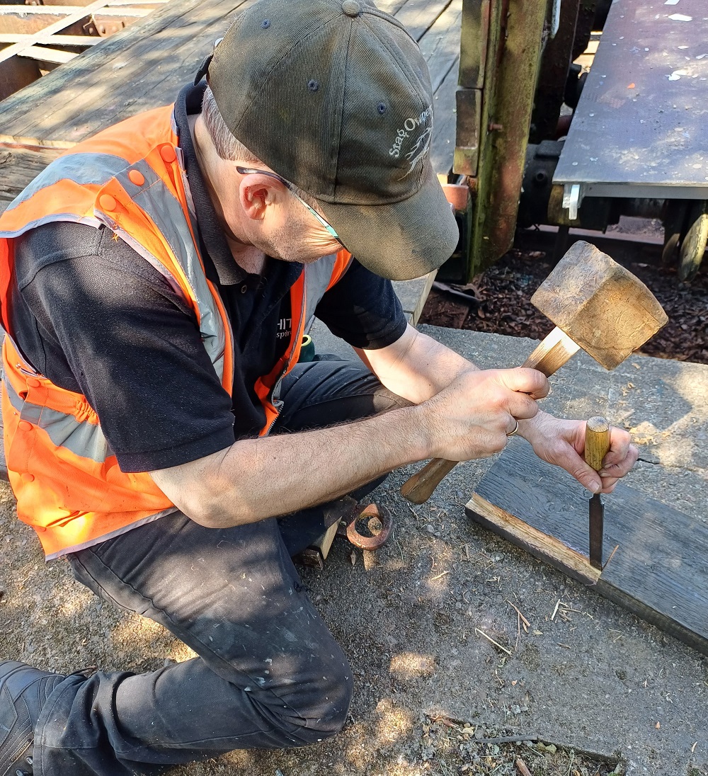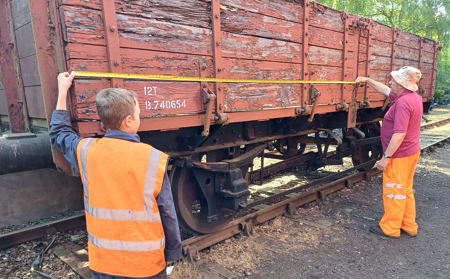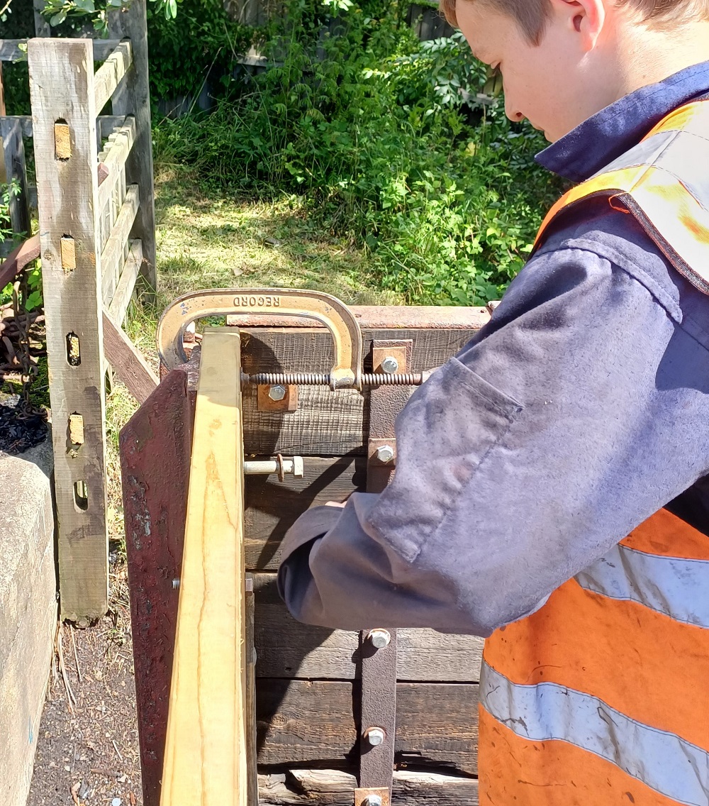 Sunday and the weather improved allowing us to work on the Pipe wagon B740654; after a couple of weeks for the planks to settle we tightened all the door bolts on the west side & south end, and trimmed a couple of slightly long ones.