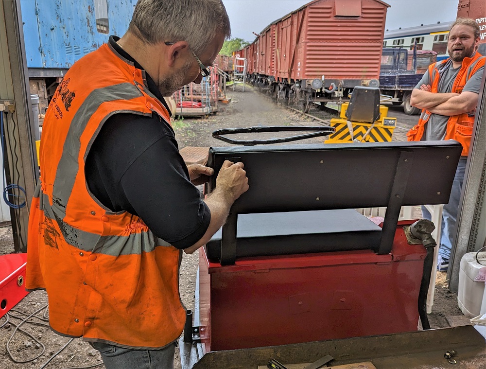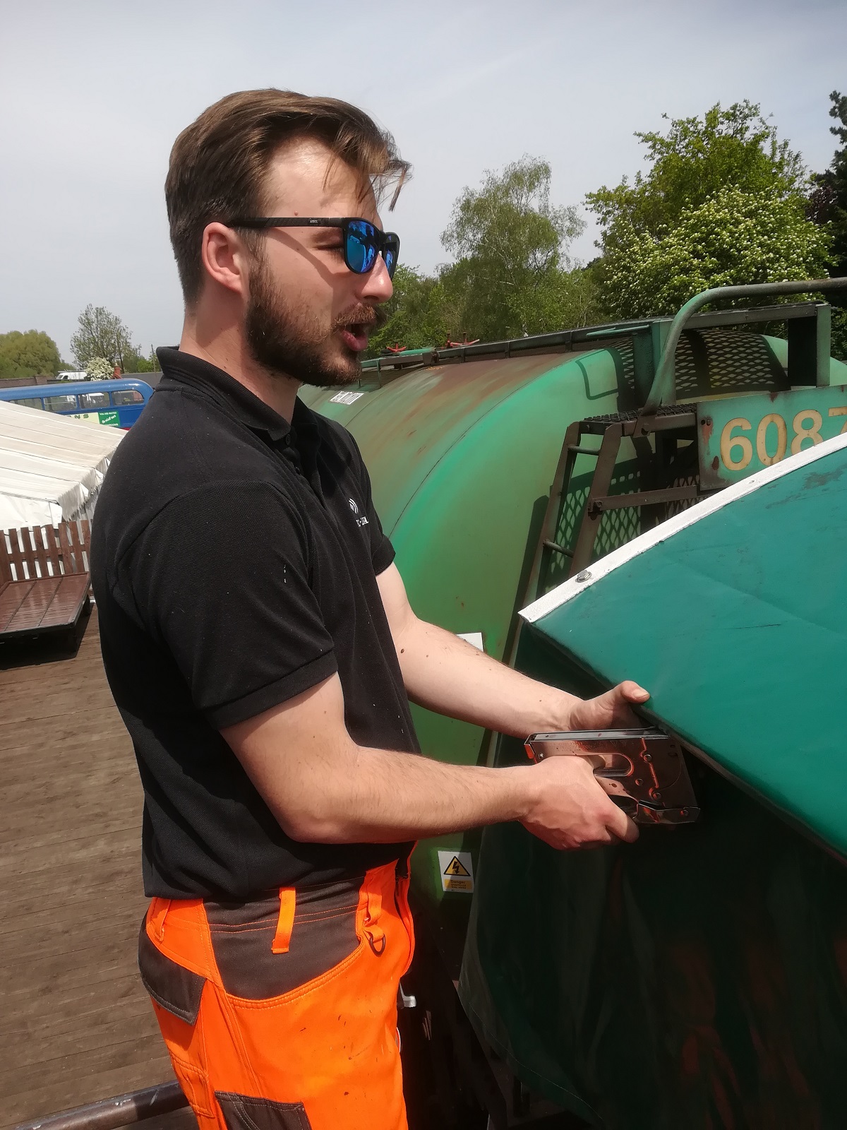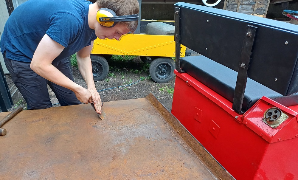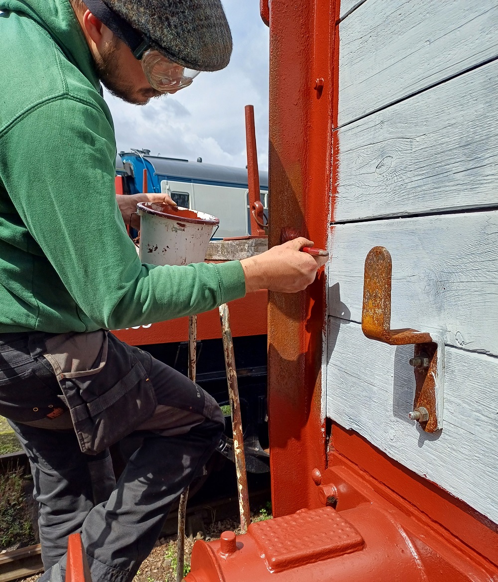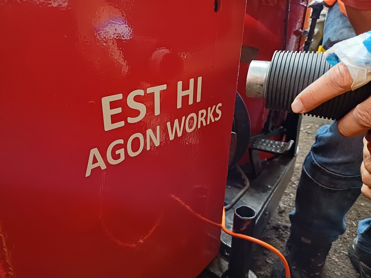 At our Open Weekend in July, Kiki took part adorned with our friends’ West Hill Wagon Works logos; however in preparation for the Railways at Work event Kiki will receive a more appropriate livery. The first step was to carefully remove the temporary vinyl lettering and clean the paintwork. Kiki‘s new livery will be revealed at the Railways at Work Gala on the 19th August.