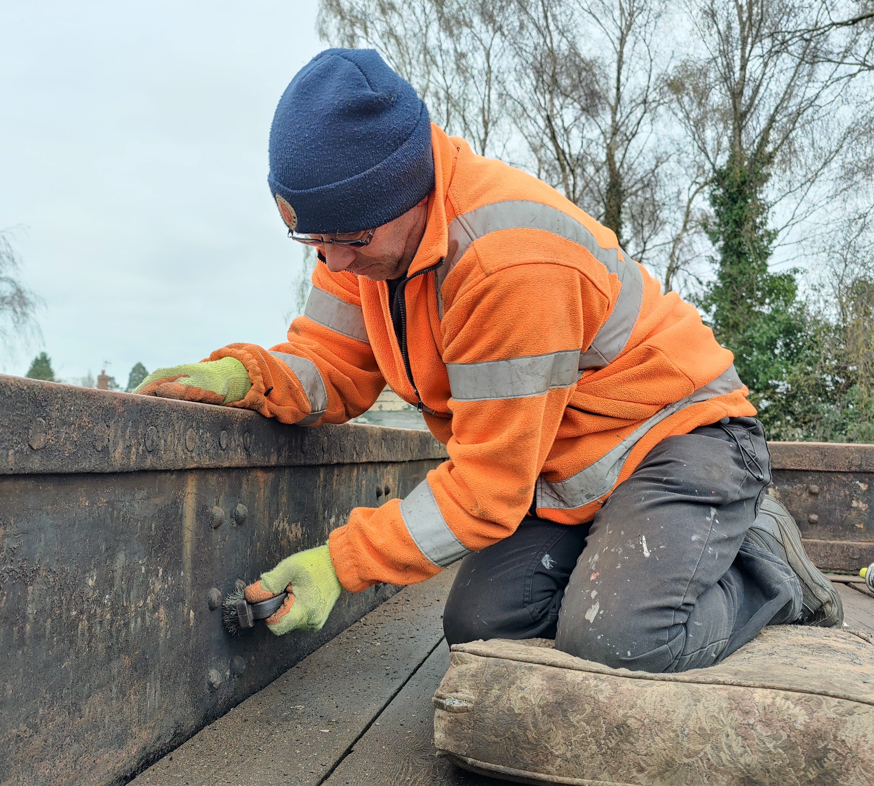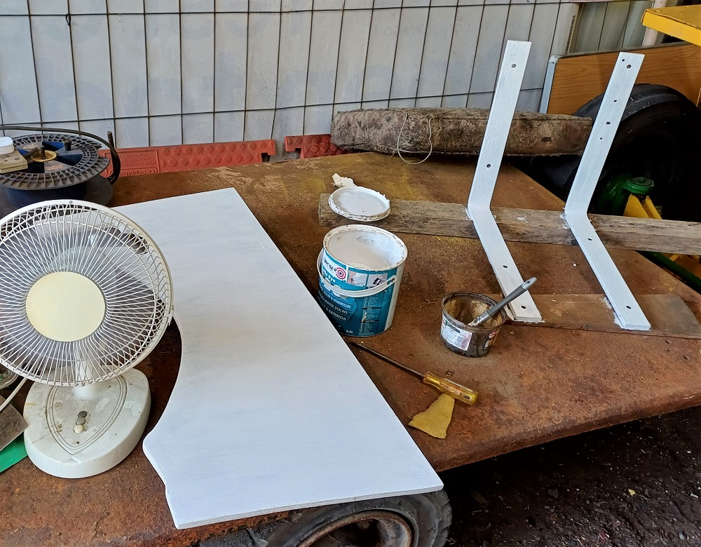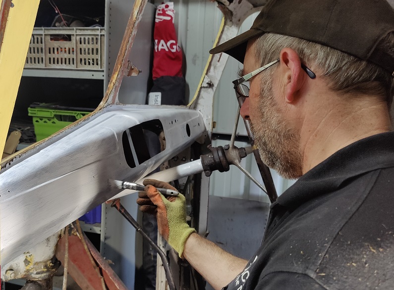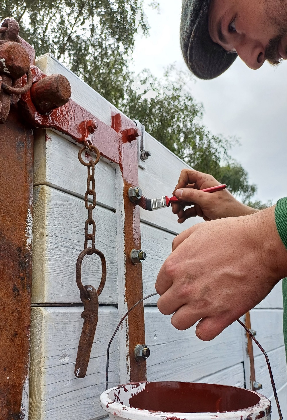 A final bit of scraping of door furniture then we set about applying some red-oxide primer to the door furniture and stanchions.