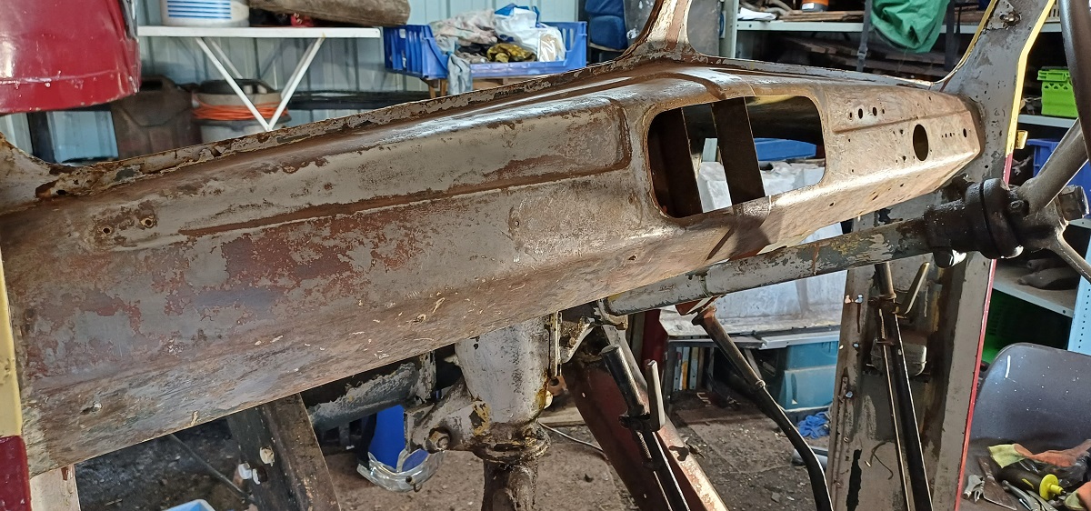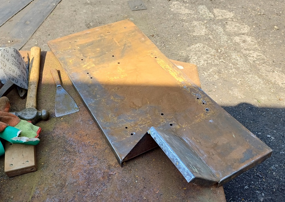 Following the removal of the air driven pump from Tank wagon 3777 last week, the remaining section of pipework was removed. The brackets on the underframe were ground off and red-oxide primer applied.