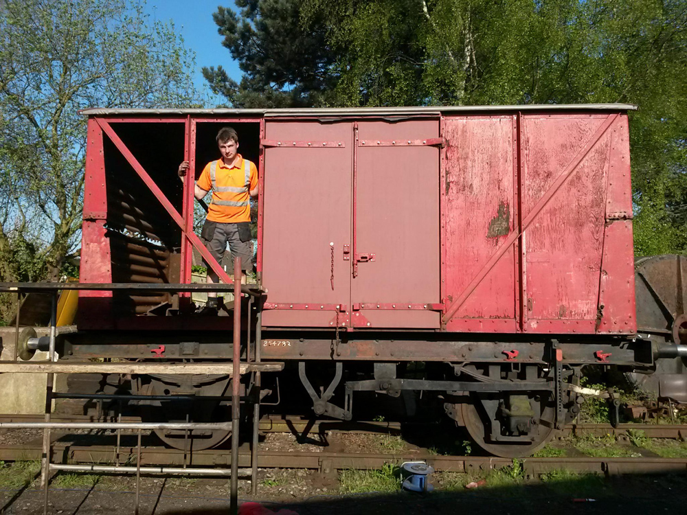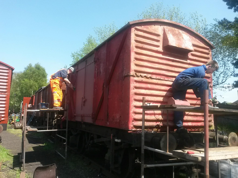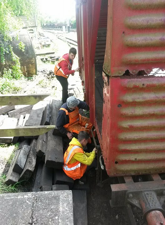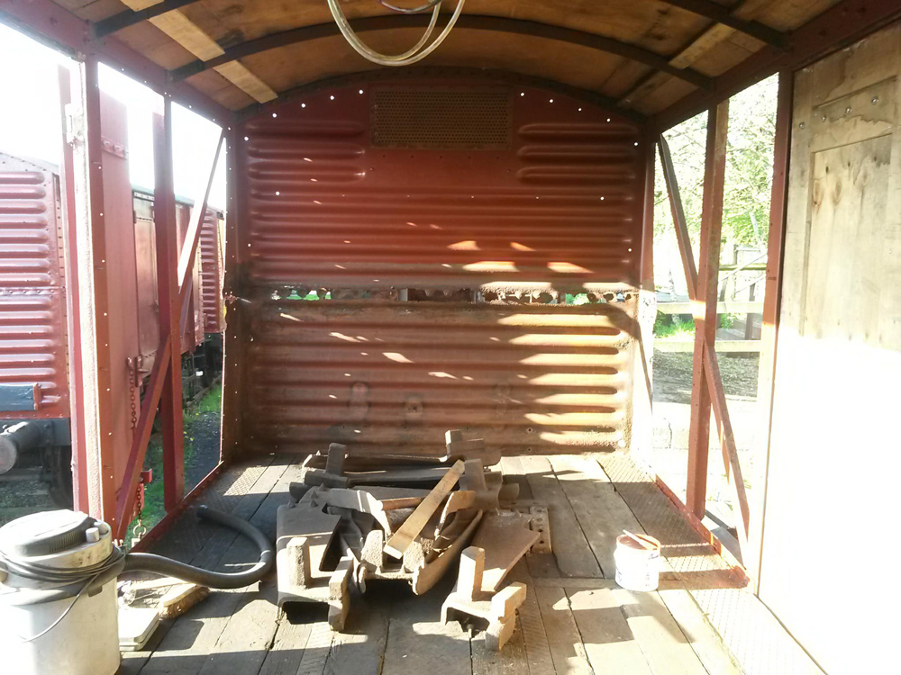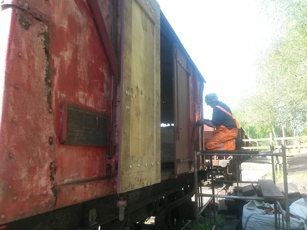 This weekend saw us working away on B854782, preparing for its visit to the loco shed to have some remedial work to the corrugated ends. Matt has also removed the branding posters pasted onto the vans for the photo charter and gala, and touched in the paint where it had become detached.