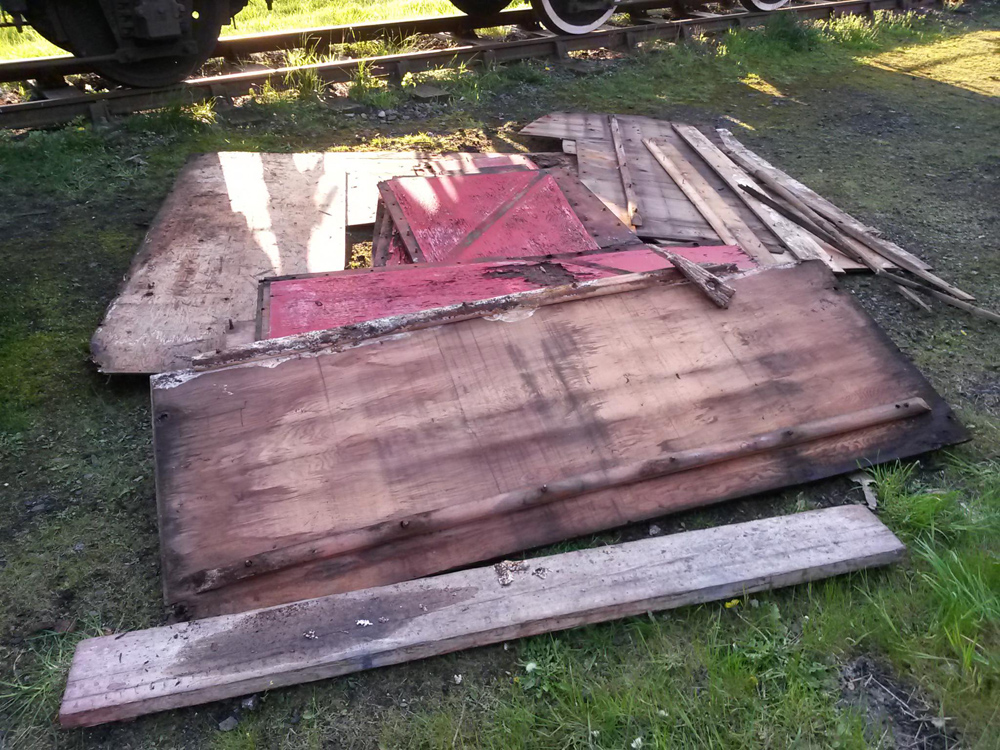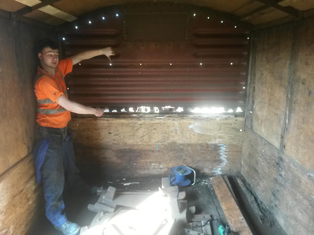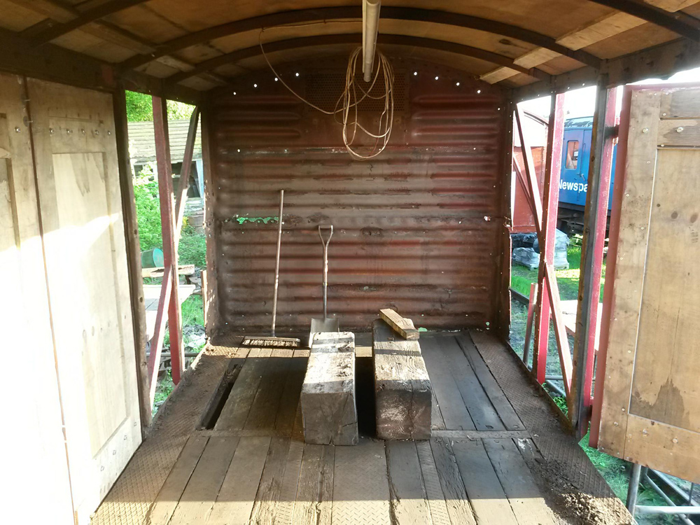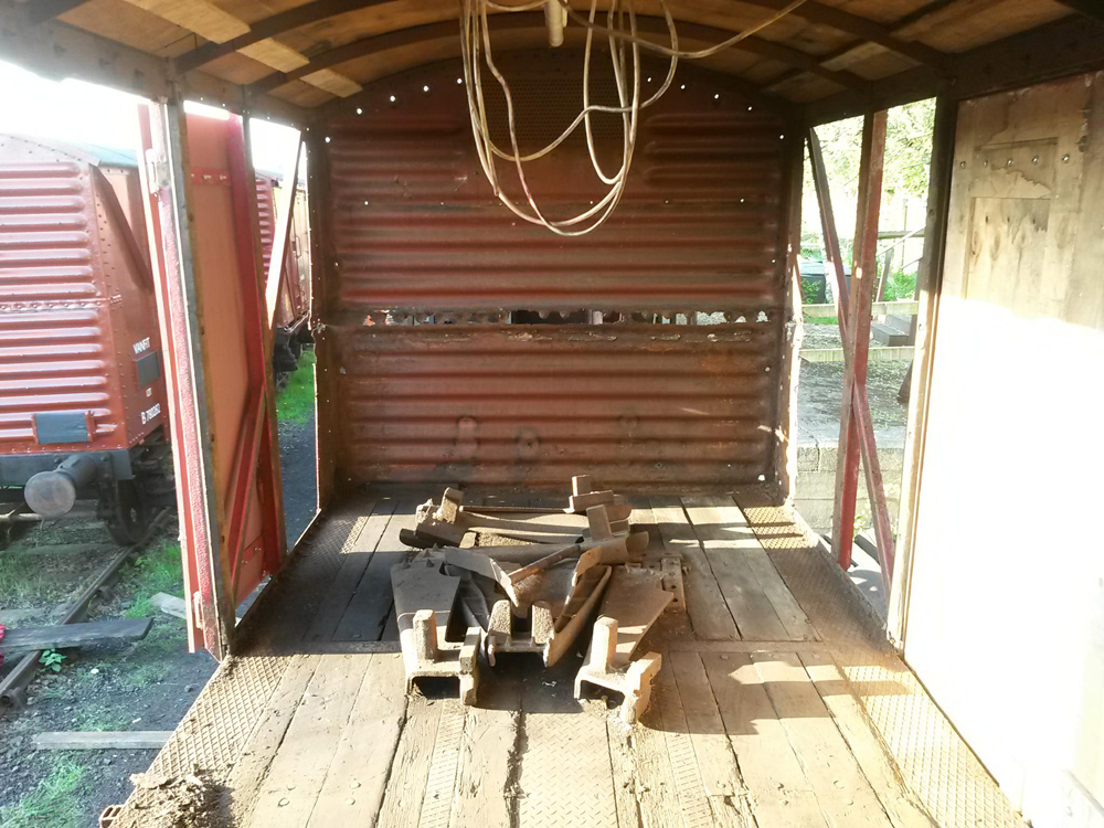 This vehicle will soon be making its way to the Locomotive works for some much-needed welding to repair the steel ends of the vehicle. It is in use as the crane packing van and as such full of packing wood which required to be emptied, this was carried out so we could begin the task of removing the nuts and bolts to release the plywood inner and outer sheets.